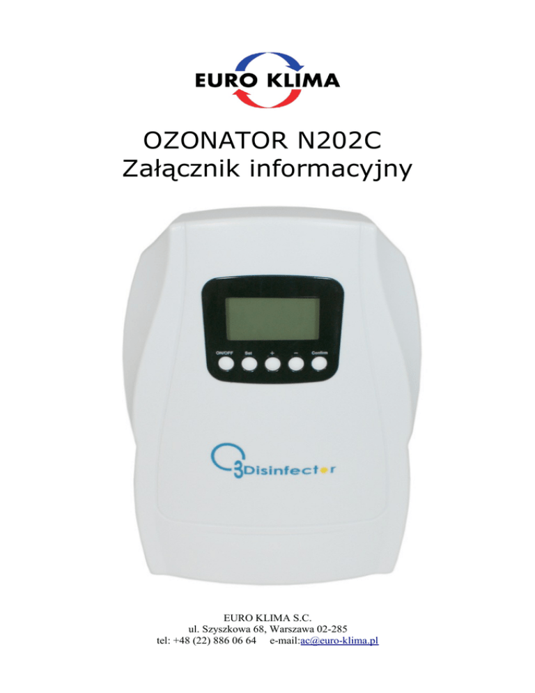 OZONATOR N202C Załącznik informacyjny EURO KLIMA S.C. ul. Szyszkowa 68, Warszawa 02-285 tel: +48 (22) 886 06 64 e-mail:[email protected] Charakterystyka i oddziaływanie ozonu: -Ozon silnie utlenia, więc działa bakteriobójczo, wirusobójczo i grzybobójczo -Usuwa organiczne i nieorganiczne zapachy z pomieszczeń i samochodów Ozon nie maskuje zapachów, lecz je usuwa! -Poprzez natlenianie poprawia metabolizm i odżywianie tkanek -Wzmacnia system odpornościowy Nawet niewielkie stężenia ozonu zmniejszają lub usuwają: -Zapach papierosowy oraz inne zapachy organiczne i nieorganiczne -Grzyby tworzące pleśnie np. na ścianach, zapachy stęchlizny, choroby skóry, jamy ustnej. Eliminuje również zarodniki grzybów. Skutki działania są długotrwałe. -Roztocza, które powodują alergie, ataki astmy, wyczerpanie organizmu -Drobnoustroje powodujące zakażenia bakteryjne, stany zapalne, choroby bakteryjne, gnicie żywności itp. -Pestycydy, fungicydy, azotany oraz pleśnie i grzyby z warzyw i owoców -Hormony, anaboliki i inne zanieczyszczenia w mięsie, drobiu, owocach morza. -Pyłki kwiatowe powodujące alergie, podrażnienia nosa, gardła, skóry. Ozon O3 jest gazem nietrwałym. Okres połowicznego rozpadu jest mniejszy niż 40 min. w czystym powietrzu i przy temperaturze 20ºC, a w zanieczyszczonym wynosi około 30 min. Dla wody okres połowicznego rozpadu ozonu wynosi od 30 min przy temperaturze 20ºC do kilku minut przy 50ºC. Po około 2 godzinach ozon przechodzi całkowicie w normalny tlen O2. Dlatego generatory ozonu o wydajności do 500 mg 03/godz. są bezpieczne w stosowaniu. Dopuszczalne maksymalne stężenie ozonu (MCW) dla 8 godz./dobę i 40 godz/tydzień wynosi 200µg/m³ (0,2 µg /m³) lub w wartościach względnych 0,1ppm (100ppb). Zalecany poziom docelowy to 120µg/m³ (0,12µg/m³) lub 0,06 ppm. Ozon jest jednym z najskuteczniejszym środków dezynfekujących. Działanie bakteriobójcze wykazuje już w stężeniu około 13µg/dcm³ . Działanie bakteriobójcze ozonu jest 50 razy skuteczniejsze i 3 tysiące razy szybsze niż chloru. EURO KLIMA S.C. ul. Szyszkowa 68, Warszawa 02-285 tel: +48 (22) 886 06 64 e-mail:[email protected] Praktyczne zastosowania: 1.Samochody osobowe, środki transportu. Ozonowanie wnętrz samochodów jest jedynym skutecznym sposobem usunięcia z tapicerki wnętrza samochodu, układu klimatyzacji, bakterii, wirusów, zarodników pleśni i grzybów oraz zapachów. Ozonowanie powinno się przeprowadzać co najmniej dwa razy w roku. Ozonowanie przeprowadzamy w trzech cyklach po 30 min. z przerwami 15 min., wprowadzając rurkę z ozonatorem przez lekko uchyloną szybę drzwi do wnętrza samochodu, oraz do wlotu powietrza i włączając wentylator samochodu na niski poziom obiegu wewnętrznego. Po zakończeniu ozonowania otworzyć drzwi samochodu i wywietrzyć. 2. Usuwanie bakterii, wirusów, pleśni, grzybów, fungicydów, pestycydów i azotanów z owoców i warzyw w celu ich oczyszczenia i przedłużenia świeżości i trwałości. Warzywa i owoce – maksymalny ładunek do 10 kg włożyć do plastikowego lub szklanego naczynia i zalać wodą do całkowitego zanurzenia. Umieścić w wodzie rurkę z dyfuzorem ozonatora. Włączyć ozonator na 10-15 min. Po zakończeniu ozonowania owoce lub warzywa pozostawić w wodzie do 10 min. Po czym odlać wodę z naczynia. Warzywa i owoce mogą podlegać dalszej obróbce spożywczej. Owoce i warzywa można również ozonować, zwłaszcza owoce miękkie jak maliny, czy truskawki, w powietrzu - umieszczając je luzem w pojemniczkach lub w foliowych woreczkach strunowych, wprowadzając rurkę dyfuzora do torebki i zamykając ją. Czas ozonowania 10 min. Przed spożyciem odczekać 20 min. 3. Odkażanie i odświeżanie mięsa, drobiu, jaj w celu usunięcia zanieczyszczeń metalicznych, mikroorganizmów, hormonów, antybiotyków itp. Ładunek do 5 kg umieścić w naczyniu jak w punkcie 1. Zalać wodą i ozonować 20-30 min. Wylać wodę, osuszyć na sicie lub durszlaku. Produkty można przyrządzać bezpośrednio do spożycia lub przechowywać w lodówce czy zamrażarce. 4. Ryby, owoce morza - ozonowanie jak w przypadku mięs, ale czas ozonowania skrócić do 10min. 5. Ozonowanie ryżu, grochu, fasoli, kasz gruboziarnistych. Umyć w wodzie, umieścić w naczyniu, zalać wodą. Włożyć rurkę z dyfuzorem ozonatora do naczynia i ozonować 10 min. Gotować w wodzie na którą działał ozon. Tak ugotowane produkty będą dużo smaczniejsze i dużo zdrowsze. 6. Dezynfekcja zastawy stołowej, naczyń, sztućców, desek do krojenia. Ozonujemy w wodzie 20 min. EURO KLIMA S.C. ul. Szyszkowa 68, Warszawa 02-285 tel: +48 (22) 886 06 64 e-mail:[email protected] 7. Ozonowanie wody pitnej. Dyfuzor zanurzamy w plastikowej butli z wodą o pojemności do 10 litrów lub plastikowym wiaderku napełnionym wodą z kranu. Czas ozonowania 5-15 min. Skutecznie naozonujemy i dotlenimy wodę a jednocześnie oczyścimy ją z pozostałości chloru, bakterii, metali czy chloroformu. Tak przygotowaną wodę (po 20 min.) możemy użyć do gotowania, picia, płukania i mycia zębów. 8. Kąpiel ozonowa. Działa korzystnie na organizm: dotlenia skórę, odpręża, zmniejsza cellulit, leczy choroby grzybowe skóry, trądzik. Usuwa nieprzyjemny zapach stóp i potu. Rurkę z dyfuzorem umieszczamy w napełnionej częściowo wodą wannie o temperaturze do 45ºC i ozonujemy przez 10 min. 9. Ozonowanie pomieszczeń: pokoi, kuchni, łazienek, sanitariatów, garaży, piwnic itp.- skutecznie je dezynfekuje i usuwa wszelkie zapachy jak dym papierosowy, zapach stęchlizny, zapach moczu zwierząt domowych itp. Pomieszczenia do 16 m² ozonujemy dwa razy po 30 min. z przerwą półgodzinną, po czym wietrzymy. Pomieszczenia do 30m² ozonujemy trzykrotnie po 30 min. z przerwami półgodzinnymi i wietrzymy. Ozonator lub wężyk ozonatora umieszczamy w pomieszczeniu możliwie wysoko. Zaleca się aby w trakcie ozonowania włączony był nieduży wentylator mies