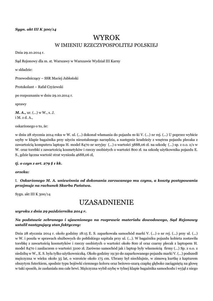 Sygn. akt III K 300/14 WYROK W IMIENIU RZECZYPOSPOLITEJ POLSKIEJ Dnia 29.10.2014 r. Sąd Rejonowy dla m. st. Warszawy w Warszawie Wydział III Karny w składzie: Przewodniczący – SSR Maciej Jabłoński Protokolant – Rafał Czyżewski po rozpoznaniu w dniu 29.10.2014 r. sprawy M. A., ur. (...) w W., s. J. i M. z d. A., oskarżonego o to, że: w dniu 28 stycznia 2014 roku w W. ul. (...) dokonał włamania do pojazdu m-ki V. (...) nr rej. (...) U poprzez wybicie szyby w klapie bagażnika przy użyciu nieustalonego narzędzia, a następnie kradzieży z wnętrza pojazdu plecaka z zawartością komputera laptopa H. model 8470 nr seryjny (...) o wartości 3888,06 zł. na szkodę (...) sp. z o.o. z/s w W. oraz torebki z zawartością kosmetyków i rzeczy osobistych o wartości 800 zł. na szkodę użytkownika pojazdu E. S., gdzie łączna wartość strat wyniosła 4688,06 zł, tj. o czyn z art. 279 § 1 kk. orzeka: I. Oskarżonego M. A. uniewinnia od dokonania zarzucanego mu czynu, a koszty postępowania przejmuje na rachunek Skarbu Państwa. Sygn. akt III K 300/14 UZASADNIENIE wyroku z dnia 29 października 2014 r. Na podstawie zebranego i ujawnionego na rozprawie materiału dowodowego, Sąd Rejonowy ustalił następujący stan faktyczny: Dnia 28 stycznia 2014 r. około godziny 18:15 E. S. zaparkowała samochód marki V. (...) o nr rej. (...) przy ul. (...) w W. i poszła w sprawach służbowych do pobliskiego szpitala przy ul. (...). W bagażniku pojazdu kobieta zostawiła torebkę z zawartością kosmetyków i rzeczy osobistych o wartości około 800 zł oraz czarny plecak z laptopem H. model 8470 i zasilaczem o wartości 3100 zł. Zarówno samochód jak i laptop były własnością firmy (...) Sp. z o.o. z siedzibą w W., E. S. była tylko użytkowniczką. Około godziny 19:30 do zaparkowanego pojazdu marki V. (...) podszedł mężczyzna w wieku około 35 lat, o wzroście około 175 cm. Ubrany był niechlujnie, w zimową kurtkę z kapturem obszytym futerkiem, spodnie typu bojówki ciemnego koloru oraz beżowo-szarą czapkę głęboko zaciągniętą na głowę w taki sposób, że zasłaniała mu całe brwi. Mężczyzna wybił szybę w tylnej klapie bagażnika samochodu i wyjął z niego pozostawiony przez E. S. plecak z laptopem, który zarzucił na ramię oraz torebkę. Wraz z wybiciem szyby włączył się alarm. Dźwięk alarmu zwrócił uwagę idącego wzdłuż ulicy (...), który zauważył jak przez wybitą szybę nieznany mu mężczyzna wyjmuje z zaparkowanego samochodu damską torebkę. P. M. (1) zatrzymał się w odległości około 15 metrów i przyglądał się rozwojowi zdarzń. Mężczyzna przy samochodzie zorientował się, że jest obserwowany. Zbliżył się do P. M. (1) na odległość około 5 metrów i położył zabraną torebkę na betonowej, prostokątnej rabacie. Powiedział „na co się kurwa gapisz”, po czym niespiesznie oddalił się w kierunku Alei (...). Zabrał ze sobą czarny plecak z laptopem marki H.. P. M. (1) natychmiast zadzwonił pod numer alarmowy policji, informując o całym zdarzeniu. Torebkę zostawił u swojej dziewczyny E. R., aby zabezpieczyła ją do czasu przyjazdu funkcjonariuszy Policji, a sam udał się do pracy. Powyższy stan faktyczny Sąd Rejonowy ustalił na podstawie następujących dowodów: wyjaśnień oskarżonego M. A. (k. 76, 156-157), zeznań świadka P. M. (1) (k. 21v, 24v, 60-61, 157), zeznań świadka E. S. (k. 3), protokołu oględzin samochodu (k. 8), protokołu oględzin płyt z nagraniami zapisów monitoringu (k. 47, 67-68), protokołu przeszukania (k. 53-54, 57-58), karty karnej (k. 79). Oskarżony M. A. przesłuchany w toku postępowania przygotowawczego nie przyznał się do popełnienia zarzucanego czynu i złożył wyjaśnienia. Wyjaśnił, iż nie dokonał tego włamania i nic nie wie w tej sprawie. Nie pamiętał, co robił w dniu zdarzenia. Dodał, że nie wie gdzie jest ul. (...). Nie posiada również komputera laptop, ponieważ nie stać go na takie rzeczy (k. 76). Oskarżony M. A. przesłuchany na rozprawie głównej również nie przyznał się do zarzucanego czynu. Wyjaśnił, że nie popełnił zarzucanego mu przestępstwa i nie pamięta, co tego dnia robił. Potwierdził odczytane mu w trybie art. 389 § 1 k.p.k. wyjaśnienia złożone w postępowaniu przygotowawczym (k. 157-159). Sąd Rejonowy dokonał następującej oceny zgromadzonego w sprawie materiału dowodowego: Wyjaśnienia oskarżonego sprowadzają się w zasadzie do zajęcia stanowiska procesowego w sprawie. M. A. konsekwentnie nie przyznawał się do winy twierdząc, że to nie on włamał się do samochodu marki V. (...). Sąd obdarzył pełnym walorem wiarygodności zeznania świadka E. S.. Kobieta wskazała, że w dniu zdarzenia około godziny 18:15 zaparkowała samochód przy ul. (...) i poszła w sprawach służbowych do szpitala. Gdy po niespełna dwóch godzinach wróciła do samochodu, zauważyła stojących przy pojeździe funkcjonariuszy Policji, od których dowiedziała się, że podczas jej nieobecności miało miejsce włamanie. Nieznany sprawca wybił szybę w tylnej klapie bagażnika, kobieta zauważyła też brak torebki (udało się ją jednak odzyskać) i plecaka ze służbowym laptopem. Zeznania świadka są szczere, rzeczowe i logiczne; kobieta opisała okoliczności, które były jej znane. E. S. nie posiadała jednak bezpośredniej wiedzy o zdarzeniu, nie była jego bezpośrednim świadkiem. Nie widziała osoby, która dokonała włamania do pojazdu i zaboru rzeczy, toteż nie mogła potwierdzić ani zaprzeczyć tezie oskarżenia, że uczynił to M. A.. Zeznania świadka częściowo posłużyły ustaleniu stanu faktycznego, dzięki nim ustalono, jakie przedmioty zostały zabrane przez sprawcę oraz jaka była ich wartość (k. 3). Wiarygodne i stanowiące ważną podstawę ustaleń stanu faktycznego były zeznania świadka P. M. (1). Świadek idąc do pracy zauważył jak nieznany mężczyzna wyjmuje torebkę przez wyb