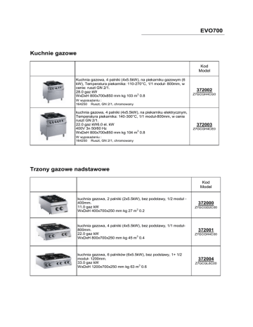 EVO700 Kuchnie gazowe Kod Model Kuchnia gazowa, 4 palniki (4x5.5kW), na piekarniku gazowym (6 kW), Temperatura piekarnika: 110-270°C, 1/1 moduł- 800mm, w cenie: ruszt GN 2/1. 28.0 gaz kW 3 WxDxH 800x700x850 mm kg 103 m 0.8 372002 Z7GCGH4CG0 W wyposażeniu : 164250 Ruszt, GN 2/1, chromowany kuchnia gazowa, 4 palniki (4x5.5kW), na piekarniku elektrycznym, Temperatura piekarnika: 140-300°C, 1/1 moduł-800mm, w cenie ruszt GN 2/1. 22.0 gaz kW6.0 el. kW 400V 3n 50/60 Hz WxDxH 800x700x850 mm kg 104 m3 0.8 372003 Z7GCGH4CE0 W wyposażeniu : 164250 Ruszt, GN 2/1, chromowany Trzony gazowe nadstawowe Kod Model kuchnia gazowa, 2 palniki (2x5.5kW), bez podstawy, 1/2 moduł 400mm. 11.0 gaz kW 3 WxDxH 400x700x250 mm kg 27 m 0.2 kuchnia gazowa, 4 palniki (4x5.5kW), bez podstawy, 1/1 moduł800mm. 22.0 gaz kW 3 WxDxH 800x700x250 mm kg 45 m 0.4 kuchnia gazowa, 6 palników (6x5.5kW), bez podstawy, 1+ 1/2 moduł- 1200mm. 33.0 gaz kW WxDxH 1200x700x250 mm kg 63 m3 0.6 372000 Z7GCGD2C00 372001 Z7GCGH4C00 372004 Z7GCGL6C00 EVO700 Kuchnie elektryczne Kod Model kuchnia elektryczna, 4 płyty grzewcze (4x2.6 kW), na piekarniku elektrycznym (6 kW), Temperatura piekarnika: 140-300°C, w cenie: ruszt GN 2/1. 16.4 el. kW 400V 3n 50/60 Hz 3 WxDxH 800x700x850 mm kg 95 m 0.8 372016 Z7ECEH4RE0 W wyposażeniu : 164250 Ruszt, GN 2/1, chromowany Trzony elektryczne nadstawowe Kod Model kuchnia elektryczna, 2 płyty grzewcze (2x2.6 kW), bez podstawy. 5.2 el. kW 400V 3n 50/60 Hz WxDxH 400x700x250 mm kg 25 m3 0.2 kuchnia elektryczna, 4 płyty grzewcze (4x2.6kW), bez podstawy. 10.4 el. kW 400V 3n 50/60 Hz WxDxH 800x700x250 mm kg 37 m3 0.4 kuchnia elektryczna, 6 płyt grzewczych (6x2.6kW), bez podstawy. 15.6 el. kW 400V 3n 50/60 Hz 3 WxDxH 1200x700x250 mm kg 70 m 0.6 372014 Z7ECED2R00 372015 Z7ECEH4R00 372019 Z7ECEL6R00 EVO700 Trzony ceramiczne nadstawowe Kod Model kuchnia z płytą ceramiczną, 2 strefy (2x2.2kW), 1/2 moduł -400mm, bez podstawy. 4.4 el. kW 400V 3n 50/60 Hz WxDxH 400x700x250 mm kg 35 m3 0.2 kuchnia z płytą ceramiczną, 4 strefy (4x2.2kW), 1/1 moduł-800mm, bez podstawy. 8.8 el. kW 400V 3n 50/60 Hz 3 WxDxH 800x700x250 mm kg 50 m 0.4 372024 Z7IRED2000 372025 Z7IREH4000 Trzony indukcyjne nadstawowe Kod Model kuchnia indukcyjna, 2 strefy grzewcze (2x3.5kW), 1/2 moduł 400mm, bez podstawy. 7.0 el. kW 400V 3n 50/60 Hz WxDxH 400x700x250 mm kg 34 m3 0.2 kuchnia indukcyjna, 4 strefy grzewcze (4x3.5kW), 1/1 moduł 800mm, bez podstawy. 14.0 el. kW 400V 3n 50/60 Hz WxDxH 800x700x250 mm kg 60 m3 0.4 372020 Z7INED2000 372021 Z7INEH4000 EVO700 Płyty gazowe na piekarniku Kod Model kuchnia gazowa z płytą grzewczą, 1 centralny palnik pod płytą grzewczą - 7kW, wymiary płyty grzewczej: 69x59cm, maks. temperatura: 500°C, na piekarniku gazowym - 6kW, Temperatura piekarnika: 140-300°C, piezzo zapalanie, w cenie 164250-ruszt GN 2/1. 13.0 gaz kW WxDxH 800x700x850 mm kg 116 m3 0.8 372008 Z7STGH10G0 W wyposażeniu : 164250 Ruszt, GN 2/1, chromowany kuchnia gazowa z 1/2 płytą grzewczą i 2 otwartymi palniki; centralny palnik pod płytą grzewczą - 3.8kW, wymiary płyty grzewczej: 34x59cm, maks. temperatura: 500°C, wolne palniki: (2x5.5kW), na piekarniku gazowym - 6 kW, Temperatura piekarnika: 140-300°C, 20.6 gaz kW WxDxH 800x700x850 mm kg 115 m3 0.8 372009 Z7STGH30G0 W wyposażeniu : 164250 Ruszt, GN 2/1, chromowany Płyty gazowe nadstawkowe Kod Model kuchnia gazowa z płytą grzewczą nadstawkowa, 1 centralny palnik pod płytą grzewczą - 7kW, maks. temperatura: 500°C. 7.0 gaz kW WxDxH 800x700x250 mm kg 73 m3 0.4 kuchnia gazowa nadst. z 1/2 płytą grzewczą i 2 otwartymi palnikami; centralny palnik pod płytą grzewczą - 3.8kW, wymiary płyty grzewczej: 34x59cm, maks. temperatura: 500°C, wolne palniki: (2x5.5kW). 14.6 gaz kW 3 WxDxH 800x700x250 mm kg 70 m 0.8 372007 Z7sTGH1000 372011 Z7sTGH3000 EVO700 Płyty grillowe gazowe Kod Model Płyta grillowa, gazowa, 1/2 moduł - 400mm, bez podstawy, gładka, stal stopowa, wymiary płyty: 33x54 cm, zakres temperatur 200400°C. 7.0 gaz kW WxDxH 400x700x250 mm kg 47 m3 0.2 Płyta grillowa, gazowa, 1/2 moduł - 400mm, bez podstawy, karbowana, stal stopowa, wymiary płyty: 33x54 cm, zakres temperatur 200-400°C. 7.0 gaz kW WxDxH 400x700x250 mm kg 47 m3 0.2 Płyta grillowa, gazowa, 1/2 moduł - 400mm, bez podstawy, gładka, chromowana, wymiary płyty: 33x54 cm, zakres temperatur 130300°C. 7.0 gaz kW 3 WxDxH 400x700x250 mm kg 47 m 0.2 372029 Z7FTGDSS00 372030 Z7FTGDSR00 372037 Z7FTGDCS00 W wyposażeniu : 164255 Przyrząd do czyszczenia płyty gładkiej chromowanej. Płyta grillowa, gazowa, 1/1 moduł - 800mm, bez podstawy, gładka płyta ze stali stopowej, wymiary płyty: 73x54 cm, zakres temperatur 200-400°C. 14.0 gaz kW WxDxH 800x700x250 mm kg 84 m3 0.4 Płyta grillowa, gazowa, 1/1 moduł - 800mm, bez podstawy, 2/3 gładka + 1/3 karbowana, stal stopowa, wymiary płyty: 73x54cm, zakres temperatur: 200-400°C. 14.0 gaz kW 3 WxDxH 800x700x250 mm kg 84 m 0.4 Płyta grillowa, gazowa, 1/1 moduł- 800mm, bez podstawy, gładka chromowana płyta, wymiary płyty: 73x54 cm, zakres temperatur 130-300°C, w cenie: skrobak (164255). 14.0 gaz kW 3 WxDxH 800x700x250 mm kg 84 m 0.4 372031 Z7FTGHSS00 372032 Z7FTGHSP00 372038 Z7FTGHCs00 W wyposażeniu : 164255 Przyrząd do czyszczenia płyty gładkiej chromowanej. Płyta grillowa, gazowa, 1/1 moduł- 800mm, bez podstawy, 2/3 gładka + 1/3 karbowana, chromowana płyta, wymiary płyty: 73x54cm, zakres temperatur: 130-300°C, moc: 14 kW 14.0 gaz kW 3 WxDxH 800x700x250 mm kg 84 m 0.4 W wyposażeniu : 164255 Przyrząd do czyszczenia płyty gładkiej chromowanej. 164257 Przyrząd do czyszczenia płyty ryflowanej chromowanej. 372041 Z7FTGHCP00 EVO700 Płyty grillowe elektryczne Kod Model Płyta grillowa elektryczna, gładka ze stali miękkiej 4.2 el. kW 400V 3n 50/60 Hz 3 WxDxH 400x700x250 mm kg 40 m 0.2 Płyta grillowa elektryczna, ryflowana ze stali miękkiej 4.2 el. kW 400V 3n 50/60 Hz 3 WxDxH 400x700x250 mm kg 47 m 0.2 Płyta grillowa elektryczna,