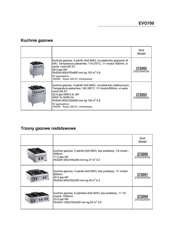 EVO700 Kuchnie gazowe Trzony gazowe nadstawowe
