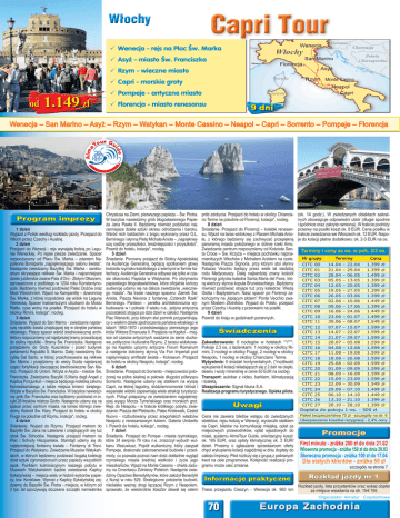 Capri Tour Wenecja - rejs na Plac Św. Marka Asyż - miasto Św. Franciszka Wenecja Francja Włochy Korsyka od 1.149 zł Pompeje - antyczne miasto Rzym Monte Casino Neapol Capri Sardynia Florencja - miasto renesansu Bośnia i Hercegowina Asyż Rzym - wieczne miasto Capri - morskie groty Chorwacja San Marino Florencja Monaco Słowenia 9 dni Wenecja – San Marino – Asyż – Rzym – Watykan – Monte Cassino – Neapol – Capri – Sorrento – Pompeje – Florencja Program imprezy 1 dzień Wyjazd z Polski według rozkładu jazdy. Przejazd do Włoch przez Czechy i Austrię. 2 dzień Przyjazd do Wenecji - rejs wynajętą łodzią po Lagunie Weneckiej. Po rejsie piesze zwiedzanie. Spacer rozpoczynamy od Placu Św. Marka – zdaniem Napoleona Bonaparte „najpiękniejszego salonu świata”. Następnie zwiedzamy Bazylikę Św. Marka - sanktuarium skrywające relikwie Św. Marka i najcenniejsze dzieło jubilerskie zwane Pala d’Oro - Złotym Ołtarzem, sprowadzone z podbitego w 1204 roku Konstantynopola. Będziemy również podziwiać Pałac Dożów oraz Most Westchnień. Wjazd na Kampanillę – dzwonnicę Św. Marka, z której rozpościera się widok na Lagunę Wenecką. Spacer malowniczymi uliczkami do Mostu Rialto, czas wolny na posiłek. Przejazd do hotelu w okolicy Rimini, kolacja*, nocleg. 3 dzień Śniadanie. Wyjazd do San Marino - zwiedzanie najstarszej republiki świata znajdującej się w obrębie państwa włoskiego. Pieszy spacer wśród średniowiecznej architektury rozpoczniemy od najstarszej bramy prowadzącej do stolicy republiki - Bramy Św. Franciszka. Następnie przejdziemy do Groty Kuszników i przed budynek parlamentu Republiki S. Marino. Dalej nawiedzimy Bazylikę Del Santo, w której przechowywane są relikwie Św. Marino i przejdziemy do wieży Guida najstarszej części fortyfikacji otaczającej średniowieczne San Marino. Przejazd do Umbrii. Wizyta w Asyżu - mieście Św. Franciszka. Zwiedzanie Bazyliki S.Maria degli Angeli z Kaplicą Porcjunkuli – miejsca będącego kolebką zakonu franciszkańskiego, a także miejsca śmierci świętego. Wizyta w Bazylice Św. Franciszka. W bazylice nawiedzimy grób Św. Franciszka oraz będziemy podziwiać m.in. cykl 28 fresków mistrza Giotto. Następnie udamy się na spacer przez centrum miasta, na koniec którego zwiedzimy Kościół Św. Klary. Przejazd do hotelu w okolicy Fiuggi na południe od Rzymu, kolacja*, nocleg. 4 dzień Śniadanie. Wyjazd do Rzymu. Przejazd metrem do Bazyliki Św. Jana na Lateranie i znajdujących się tuż obok Św. Schodów. Następnie przejazd metrem na Plac i Schody Hiszpańskie. Stamtąd udamy się do najsłynniejszej fontanny świata – Fontanny di Trevi. Przejazd do Watykanu. Zwiedzanie Muzeów Watykańskich, w których będziemy podziwiać bogatą kolekcję dzieł sztuki zgromadzonych przez papieży wszystkich epok. Punktem kulminacyjnym naszego pobytu w Muzeach Watykańskich będzie zwiedzanie Kaplicy Sykstyńskiej – miejsca wielu w historii wyborów papieży, tzw. Konklawe. Wprost z Kaplicy Sykstyńskiej zejdziemy do Bazyliki Św. Piotra - miejsca, w którym od 2 tys. lat spoczywają doczesne szczątki namiestnika Chrystusa na Ziemi, pierwszego papieża – Św. Piotra. W bazylice nawiedzimy grób błogosławionego Papieża Jana Pawła II. Będziemy również podziwiać najcenniejsze dzieła sztuki okresu odrodzenia i baroku. Wśród nich baldachim z brązu wykonany przez G.L. Berniniego i słynną Pietę Michała Anioła – „najpiękniejszą rzeźbę przeszłości, teraźniejszości i przyszłości”. Powrót do hotelu, kolacja*, nocleg. 5 dzień Śniadanie. Ponowny przejazd do Stolicy Apostolskiej na Audiencję Generalną, będącą spotkaniem głowy kościoła rzymsko-katolickiego z wiernymi w formie katechezy. Audiencja Generalna odbywa się tylko w czasie obecności Papieża w Watykanie. Po otrzymaniu papieskiego błogosławieństwa, które oficjalnie kończy audiencję udamy się na dalsze zwiedzanie „wiecznego miasta”. Na trasie naszego spaceru: Zamek Św. Anioła, Piazza Navona z fontannę „Czterech Rzek” Berniniego. Panteon – perełka architektoniczna wybudowana w I połowie II wieku n.e., jedyna antyczna pozostałość stojąca po dziś dzień w całości. Następnie Plac Wenecki, przy którym stoi pomnik przypominający o wielkim dziele zjednoczenia państwa włoskiego w latach 1860-1870 i przedstawiający pierwszego jego króla Wiktora Emanuela II. Przejście na Kapitol – miejsce od czasów antycznych uważane za serce duchowe, polityczne i kulturalne Rzymu. Z tarasu widokowego na Kapitolu ujrzymy antyczne Forum Romanum a następnie dotrzemy słynną Via Fori Imperiali pod najsłynniejszy amfiteatr świata – Koloseum. Przejazd do hotelu w okolicy Neapolu, kolacja*, nocleg. 6 dzień Śniadanie. Przejazd do Sorrento - miejscowości położonej na półce skalnej w połowie długości półwyspu Sorrento. Następnie udamy się statkiem na wyspę Capri, na której łagodny, śródziemnomorski klimat i wspaniałe widoki zapewniają wiele atrakcji turystycznych. Pobyt połączony ze zwiedzaniem najpiękniejszej wyspy Morza Tyrreńskiego oraz morskich grot. Rejs do Neapolu - w trakcie krótkiego pobytu zwiedzanie: Piazza del Plebiscito, Pałac Królewski, Castel Nuovo - rozbudowany przez aragońskich władców Neapolu z renesansowym łukiem. Galeria Umberto I. Powrót do hotelu, kolacja*, nocleg. 7 dzień Śniadanie. Przejazd do Pompei - miasta rzymskiego, które 24 sierpnia 79 roku n.e. zniszczył wybuch wulkanu Wezuwiusz. Popiół wulkaniczny, który zasypał Pompeje, doskonale zakonserwował budowle i przedmioty, co pozwala poznać nam dość dokładnie wygląd rzymskiego miasta średniej wielkości i życie jego mieszkańców. Wjazd na Monte Cassino - chwila zadumy na Cmentarzu Żołnierzy Polskich. Następnie zwiedzimy Opactwo Benedyktynów, które założył Benedykt z Nursji w roku 529. Strategiczne położenie budowli, niedaleko ważnej drogi łącz