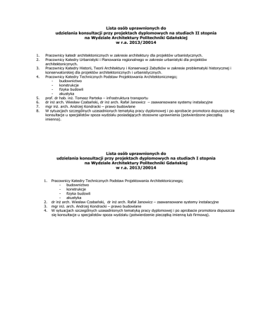 Lista osób uprawnionych do udzielania konsultacji przy projektach dyplomowych na studiach II stopnia na Wydziale Architektury Politechniki Gdańskiej w r.a. 2013/20014 1. 2. 3. 4. 5. 6. 7. 8. Pracownicy katedr architektonicznych w zakresie architektury dla projektów urbanistycznych. Pracownicy Katedry Urbanistyki i Planowania regionalnego w zakresie urbanistyki dla projektów architektonicznych. Pracownicy Katedry Historii, Teorii Architektury i Konserwacji Zabytków w zakresie problematyki historycznej i konserwatorskiej dla projektów architektonicznych i urbanistycznych. Pracownicy Katedry Technicznych Podstaw Projektowania Architektonicznego; budownictwo konstrukcje fizyka budowli akustyka prof. dr hab. inż. Tomasz Parteka – infrastruktura transportu dr inż arch. Wiesław Czabański, dr inż arch. Rafał Janowicz – zaawansowane systemy instalacyjne mgr inż. arch. Andrzej Kondracki – prawo budowlane W sytuacjach szczególnych uzasadnionych tematyką pracy dyplomowej i po aprobacie promotora dopuszcza się konsultacje u specjalistów spoza wydziału posiadających stosowne uprawnienia (potwierdzone pieczątką imienna). Lista osób uprawnionych do udzielania konsultacji przy projektach dyplomowych na studiach I stopnia na Wydziale Architektury Politechniki Gdańskiej w r.a. 2013/20014 1. 2. 3. 4. Pracownicy Katedry Technicznych Podstaw Projektowania Architektonicznego; budownictwo konstrukcje fizyka budowli akustyka dr inż arch. Wiesław Czabański, dr inż arch. Rafał Janowicz – zaawansowane systemy instalacyjne mgr inż. arch. Andrzej Kondracki – prawo budowlane W sytuacjach szczególnych uzasadnionych tematyką pracy dyplomowej i po aprobacie promotora dopuszcza się konsultacje u specjalistów spoza wydziału (potwierdzenie pieczątką imienną lub firmową).