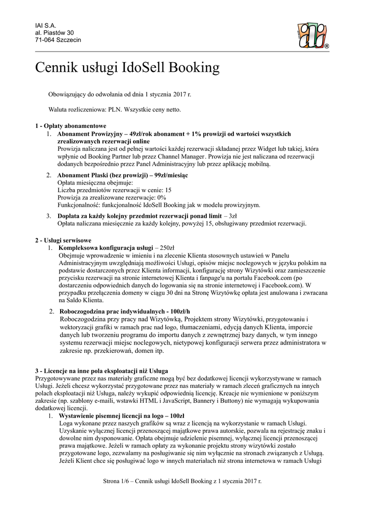 IAI S.A. al. Piastów 30 71-064 Szczecin Cennik usługi IdoSell Booking Obowiązujący do odwołania od dnia 1 stycznia 2017 r. Waluta rozliczeniowa: PLN. Wszystkie ceny netto. 1 - Opłaty abonamentowe 1. Abonament Prowizyjny – 49zł/rok abonament + 1% prowizji od wartości wszystkich zrealizowanych rezerwacji online Prowizja naliczana jest od pełnej wartości każdej rezerwacji składanej przez Widget lub takiej, która wpłynie od Booking Partner lub przez Channel Manager. Prowizja nie jest naliczana od rezerwacji dodanych bezpośrednio przez Panel Administracyjny lub przez aplikację mobilną. 2. Abonament Płaski (bez prowizji) – 99zł/miesiąc Opłata miesięczna obejmuje: Liczba przedmiotów rezerwacji w cenie: 15 Prowizja za zrealizowane rezerwacje: 0% Funkcjonalność: funkcjonalność IdoSell Booking jak w modelu prowizyjnym. 3. Dopłata za każdy kolejny przedmiot rezerwacji ponad limit – 3zł Opłata naliczana miesięcznie za każdy kolejny, powyżej 15, obsługiwany przedmiot rezerwacji. 2 - Usługi serwisowe 1. Kompleksowa konfiguracja usługi – 250zł Obejmuje wprowadzenie w imieniu i na zlecenie Klienta stosownych ustawień w Panelu Administracyjnym uwzględniają możliwości Usługi, opisów miejsc noclegowych w języku polskim na podstawie dostarczonych przez Klienta informacji, konfigurację strony Wizytówki oraz zamieszczenie przycisku rezerwacji na stronie internetowej Klienta i fanpage'u na portalu Facebook.com (po dostarczeniu odpowiednich danych do logowania się na stronie internetowej i Facebook.com). W przypadku przełączenia domeny w ciągu 30 dni na Stronę Wizytówkę opłata jest anulowana i zwracana na Saldo Klienta. 2. Roboczogodzina prac indywidualnych - 100zł/h Roboczogodzina przy pracy nad Wizytówką, Projektem strony Wizytówki, przygotowaniu i wektoryzacji grafiki w ramach prac nad logo, tłumaczeniami, edycją danych Klienta, imporcie danych lub tworzeniu programu do importu danych z zewnętrznej bazy danych, w tym innego systemu rezerwacji miejsc noclegowych, nietypowej konfiguracji serwera przez administratora w zakresie np. przekierowań, domen itp. 3 - Licencje na inne pola eksploatacji niż Usługa Przygotowywane przez nas materiały graficzne mogą być bez dodatkowej licencji wykorzystywane w ramach Usługi. Jeżeli chcesz wykorzystać przygotowane przez nas materiały w ramach zleceń graficznych na innych polach eksploatacji niż Usługa, należy wykupić odpowiednią licencję. Kreacje nie wymienione w poniższym zakresie (np. szablony e-maili, wstawki HTML i JavaScript, Bannery i Buttony) nie wymagają wykupowania dodatkowej licencji. 1. Wystawienie pisemnej licencji na logo – 100zł Loga wykonane przez naszych grafików są wraz z licencją na wykorzystanie w ramach Usługi. Uzyskanie wyłącznej licencji przenoszącej majątkowe prawa autorskie, pozwala na rejestrację znaku i dowolne nim dysponowanie. Opłata obejmuje udzielenie pisemnej, wyłącznej licencji przenoszącej prawa majątkowe. Jeżeli w ramach opłaty za wykonanie projektu strony wizytówki zostało przygotowane logo, zezwalamy na posługiwanie się nim wyłącznie na stronach związanych z Usługą. Jeżeli Klient chce się posługiwać logo w innych materiałach niż strona internetowa w ramach Usługi Strona 1/6 – Cennik usługi IdoSell Booking z 1 stycznia 2017 r. IAI S.A. al. Piastów 30 71-064 Szczecin musi wykupić przeniesienie praw majątkowych. Opłata zawiera wystawienie i przesłanie w dokumencie PDF podpisanym kwalifikowanym podpisem cyfrowym licencji wyłącznej na 1 znak towarowy i nie zawiera kosztu przygotowania i wektoryzacji grafiki. Te prace muszą być wykonywane w ramach dodatkowych prac serwisowych graficznych, płatnych na zasadach ogólnych lub samodzielnie przez Klienta. Wysłanie licencji w postaci papierowej, wymaga zamówienia dodatkowej usługi Przesyłka listowa na terenie Europy. 2. Wystawienie licencji na indywidualny projekt maski – 1000zł Obejmuje udostępnienie projektu maski PSD ze zgodą na samodzielne pocięcie projektu i samodzielne zakodowanie, bez konieczności korzystania z Usługi. Licencja jest wyłączna i obejmuje zgodę na dalsze modyfikacje projektu przez Klienta. 3. Wystawienie licencji na szablon Strony wizytówki – 1500zł Obejmuje udostępnienie maski strony wizytówki wraz z jej projektem w języku opisów szablonów, JavaScript i CSS stanowiących elementy Maski strony wizytówki. Licencja jest niewyłączna obejmuje zgodę na dalsze modyfikacje projektu przez Klienta. 4 - Opłaty dodatkowe 1. Przesyłka listowa na terenie Europy– 15zł Obejmuje wysłanie dowolnej przesyłki do Klienta, w postaci materialnej np. papierowy duplikat faktury o wadze do 350 gram w przypadku gdy Klientowi nie wystarczy dokument dostarczony elektronicznie z kwalifikowanym podpisem cyfrowym. Koszt obejmuje wysłanie przesyłki listem poleconym na terytorium Europy (łącznie z Cyprem, całej Rosji i Izraela). 2. Usługa White-Label – 200zł Pozwala na usunięcie loga „Powered by IdoSell.com”, tekstu alternatywnego i linka z Widgetu, Wizytówki oraz Meta-Author na jednej stronie w panelu administracyjnym. 3. Cesja – 25zł 4. Zwrot nadpłaty salda – 20zł Istnieje możliwość dokonania nadwyżki Salda. Opłata zawiera koszty manipulacyjne operacji wystawienia i wysłania faktury korygującej, a po jej odesłaniu wykonania przelewu na wskazane przez Klienta konto bankowe prowadzone w polskim banku lub przez system płatności internetowych w którym odbiorca płatności ponosi koszt opłaty prowizyjnej. 5. Opłata za wypłatę środków zgromadzonych w BOK na wskazany rachunek bankowy prowadzony w Polsce– 0,5zł 6. Opłata za transfer środków zgromadzonych w BOK na Saldo – 0zł 7. Opłata za wpłatę na Saldo rozliczeń z IAI z wykorzystaniem bramki natychmiastowych płatności – 1% wartości transakcji Opłata naliczana, gdy Klient zdecyduje się na wpłatę na Saldo rozliczeń z IAI S.A. zamiast w po
