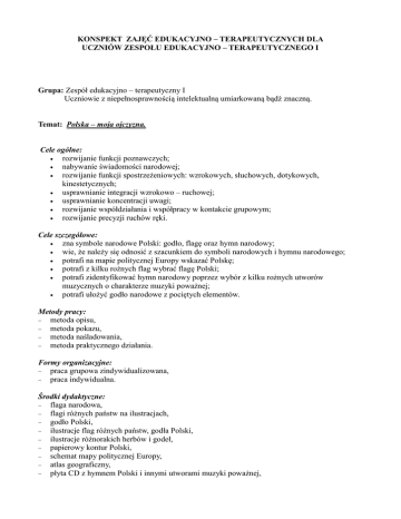KONSPEKT ZAJĘĆ EDUKACYJNO – TERAPEUTYCZNYCH DLA UCZNIÓW ZESPOŁU EDUKACYJNO – TERAPEUTYCZNEGO I Grupa: Zespół edukacyjno – terapeutyczny I Uczniowie z niepełnosprawnością intelektualną umiarkowaną bądź znaczną. Temat: Polska – moja ojczyzna. Cele ogólne: rozwijanie funkcji poznawczych; nabywanie świadomości narodowej; rozwijanie funkcji spostrzeżeniowych: wzrokowych, słuchowych, dotykowych, kinestetycznych; usprawnianie integracji wzrokowo – ruchowej; usprawnianie koncentracji uwagi; rozwijanie współdziałania i współpracy w kontakcie grupowym; rozwijanie precyzji ruchów ręki. Cele szczegółowe: zna symbole narodowe Polski: godło, flagę oraz hymn narodowy; wie, że należy się odnosić z szacunkiem do symboli narodowych i hymnu narodowego; potrafi na mapie politycznej Europy wskazać Polskę; potrafi z kilku rożnych flag wybrać flagę Polski; potrafi zidentyfikować hymn narodowy poprzez wybór z kilku rożnych utworów muzycznych o charakterze muzyki poważnej; potrafi ułożyć godło narodowe z pociętych elementów. Metody pracy: metoda opisu, metoda pokazu, metoda naśladowania, metoda praktycznego działania. Formy organizacyjne: praca grupowa zindywidualizowana, praca indywidualna. Środki dydaktyczne: flaga narodowa, flagi różnych państw na ilustracjach, godło Polski, ilustracje flag różnych państw, godła Polski, ilustracje różnorakich herbów i godeł, papierowy kontur Polski, schemat mapy politycznej Europy, atlas geograficzny, płyta CD z hymnem Polski i innymi utworami muzyki poważnej, przybory plastyczne: kartki papieru, kredki, flamastry, linijki, taśma dwustronna, klej, patyczki, wierszowane zagadki tekst wiersza pt. „Katechizm dziecka polskiego” Wł. Bełzy. Przebieg zajęć: 1. Wprowadzenie w temat poprzez odczytanie wiersz pt.:”Katechizm dziecka polskiego” Wł. Bełzy. 2. Wprowadzenie nazw: ojczyzna, Polska - pokazanie konturu oraz wskazanie na mapie politycznej Europy. Samodzielne wyszukiwanie przez uczniów Polski na mapie Europy. Kolorowanie konturu Polski na schemacie mapy politycznej Europy. 3. Godło – pokazanie godła – omówienie jego wyglądu i poszczególnych elementów. Układanie godła z pociętych części i naklejanie gotowej pracy na kartkę. 4. Hymn – odsłuchanie hymnu narodowego i przyjecie odpowiedniej postawy. Wysłuchanie różnorakich utworów muzycznych o charakterze muzyki poważnej – identyfikowanie hymnu Polski poprzez przyjęcie odpowiedniej postawy lub podniesienie ręki /uczniowie na wózkach/. 5. Flaga – zademonstrowanie flagi, wybieranie flagi Polski z różnorakich flag przedstawionych na ilustracjach. Wykonanie chorągiewki z kartki papieru – zgięcie kartki na połowę wg pokazu, na linii zgięcia po narysowanie przy pomocy flamastra i linijki linii prostej z obu stron kartki oraz zakolorowanie na czerwono, przyklejenie przy pomocy taśmy dwustronnej kartki do patyczków. 6. Odgadywanie zagadek wierszowanych dotyczących naszego kraju. 7. Uwrażliwienie na odpowiednie traktowanie symboli narodowych i hymnu. 8. Podsumowanie zajęć. Pytania i zadania dotyczące naszego państwa. /odpowiednio dla uczniów mówiących i niemówiących/. • Jak nazywa się wasza ojczyzna? Wskaż ją na mapie. • Opisz jak wygląda flaga Polski? Wybierz z tych flag flagę Polski. • Opisz jak wygląda godło Polski. Wybierz z pośród ilustracji godło. • Jeśli usłyszysz hymn Polski przyjmij odpowiednia postawę. /uczniowie na wózkach podnoszą rękę/. Załączniki: załącznik nr 1 – tekst wiersza pt: „Katechizm dziecka polskiego” Wł. Bełzy w formie dialogu (dziecko nieśmiałe odpowiada na pytania rówieśnika), zagadki wierszowane załącznik nr 2 – schemat mapy politycznej Europy załącznik nr 3 – ilustracja przedstawiająca godło Polski załącznik nr 4 – ilustracje przedstawiające różne herby i godła w tym godło Polski załącznik nr 5 – ilustracje przedstawiające różne flagi w tym flagę Polski załącznik nr 1 „Katechizm dziecka polskiego” Wł. Bełzy w formie dialogu (dziecko nieśmiałe odpowiada na pytania rówieśnika). - Kto ty jesteś? - Polak mały. - Jaki znak twój? - Orzeł Biały. - Gdzie ty mieszkasz? - Między swemi. - W jakim kraju? - W polskiej ziemi. - Czym ta ziemia? - Mą ojczyzną. - Czym zdobyta? - Krwią i blizną. - Czy ją kochasz? - Kocham szczerze. - A w co wierzysz? – W Polskę wierzę. Zagadki: Pytanie nie trudne każdy z was przyzna, jak się nazywa nasza ojczyzna? Polska W państwowym godle umieszczony, jego głowa stworzona do korony. Orzeł Biel na niej jest i czerwień, powiewa, gdy wiatr się zerwie. Wciągnięta na masztu szczyt, wisi od świtu po świt. Flaga