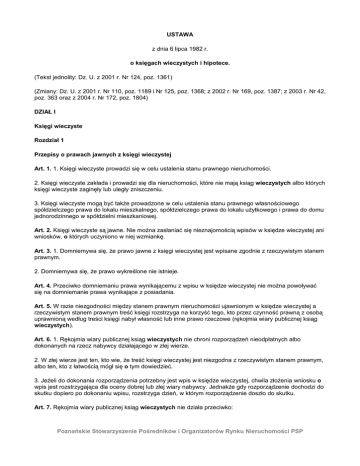 USTAWA z dnia 6 lipca 1982 r. o księgach wieczystych i hipotece. (Tekst jednolity: Dz. U. z 2001 r. Nr 124, poz. 1361) (Zmiany: Dz. U. z 2001 r. Nr 110, poz. 1189 i Nr 125, poz. 1368; z 2002 r. Nr 169, poz. 1387; z 2003 r. Nr 42, poz. 363 oraz z 2004 r. Nr 172, poz. 1804) DZIAŁ I Księgi wieczyste Rozdział 1 Przepisy o prawach jawnych z księgi wieczystej Art. 1. 1. Księgi wieczyste prowadzi się w celu ustalenia stanu prawnego nieruchomości. 2. Księgi wieczyste zakłada i prowadzi się dla nieruchomości, które nie mają ksiąg wieczystych albo których księgi wieczyste zaginęły lub uległy zniszczeniu. 3. Księgi wieczyste mogą być także prowadzone w celu ustalenia stanu prawnego własnościowego spółdzielczego prawa do lokalu mieszkalnego, spółdzielczego prawa do lokalu użytkowego i prawa do domu jednorodzinnego w spółdzielni mieszkaniowej. Art. 2. Księgi wieczyste są jawne. Nie można zasłaniać się nieznajomością wpisów w księdze wieczystej ani wniosków, o których uczyniono w niej wzmiankę. Art. 3. 1. Domniemywa się, że prawo jawne z księgi wieczystej jest wpisane zgodnie z rzeczywistym stanem prawnym. 2. Domniemywa się, że prawo wykreślone nie istnieje. Art. 4. Przeciwko domniemaniu prawa wynikającemu z wpisu w księdze wieczystej nie można powoływać się na domniemanie prawa wynikające z posiadania. Art. 5. W razie niezgodności między stanem prawnym nieruchomości ujawnionym w księdze wieczystej a rzeczywistym stanem prawnym treść księgi rozstrzyga na korzyść tego, kto przez czynność prawną z osobą uprawnioną według treści księgi nabył własność lub inne prawo rzeczowe (rękojmia wiary publicznej ksiąg wieczystych). Art. 6. 1. Rękojmia wiary publicznej ksiąg wieczystych nie chroni rozporządzeń nieodpłatnych albo dokonanych na rzecz nabywcy działającego w złej wierze. 2. W złej wierze jest ten, kto wie, że treść księgi wieczystej jest niezgodna z rzeczywistym stanem prawnym, albo ten, kto z łatwością mógł się o tym dowiedzieć. 3. Jeżeli do dokonania rozporządzenia potrzebny jest wpis w księdze wieczystej, chwila złożenia wniosku o wpis jest rozstrzygająca dla oceny dobrej lub złej wiary nabywcy. Jednakże gdy rozporządzenie dochodzi do skutku dopiero po dokonaniu wpisu, rozstrzyga dzień, w którym rozporządzenie doszło do skutku. Art. 7. Rękojmia wiary publicznej ksiąg wieczystych nie działa przeciwko: Poznańskie Stowarzyszenie Pośredników i Organizatorów Rynku Nieruchomości PSP 1) prawom obciążającym nieruchomość z mocy ustawy, niezależnie od wpisu, 2) prawu dożywocia, 3) służebnościom ustanowionym na podstawie decyzji właściwego organu administracji państwowej, 4) służebnościom drogi koniecznej albo ustanowionym w związku z przekroczeniem granicy przy wznoszeniu budynku lub innego urządzenia. Art. 8. Rękojmię wiary publicznej ksiąg wieczystych wyłącza wzmianka o wniosku, o skardze na orzeczenie referendarza sądowego, o apelacji lub kasacji oraz ostrzeżenie dotyczące niezgodności stanu prawnego ujawnionego w księdze wieczystej z rzeczywistym stanem prawnym nieruchomości. Art. 9. Przepisy art. 5-8 stosuje się także w wypadkach niewymienionych w art. 5 rozporządzeń prawami jawnymi z księgi wieczystej oraz gdy na podstawie wpisanego prawa zostaje spełnione świadczenie na rzecz osoby uprawnionej według treści księgi. Art. 10. 1. W razie niezgodności między stanem prawnym nieruchomości ujawnionym w księdze wieczystej a rzeczywistym stanem prawnym osoba, której prawo nie jest wpisane lub jest wpisane błędnie albo jest dotknięte wpisem nieistniejącego obciążenia lub ograniczenia, może żądać usunięcia niezgodności. 2. (1) Roszczenie o usunięcie niezgodności może być ujawnione przez ostrzeżenie. Podstawą wpisu ostrzeżenia jest nieprawomocne orzeczenie sądu lub postanowienie o udzieleniu zabezpieczenia. Do udzielenia zabezpieczenia nie jest potrzebne wykazanie, że powód ma interes prawny w udzieleniu zabezpieczenia. Art. 11. Ograniczone prawo rzeczowe na nieruchomości, ujawnione w księdze wieczystej, ma pierwszeństwo przed takim prawem nieujawnionym w księdze. Art. 12. 1. O pierwszeństwie ograniczonych praw rzeczowych wpisanych do księgi wieczystej rozstrzyga chwila, od której liczy się skutki dokonanego wpisu. 2. Prawa wpisane na podstawie wniosków złożonych równocześnie mają równe pierwszeństwo. Art. 13. 1. Ustanawiając ograniczone prawo rzeczowe, które ma być wpisane w księdze wieczystej, właściciel może zastrzec pierwszeństwo przed tym prawem lub równe z tym prawem dla innego prawa. 2. Zastrzeżenia można dokonać także po ustanowieniu prawa, za zgodą osoby, której to prawo przysługuje. 3. Do zastrzeżenia pierwszeństwa ograniczonego prawa rzeczowego niezbędny jest wpis w księdze wieczystej. Art. 14. Jeżeli przed wpisaniem prawa, dla którego było zastrzeżone pierwszeństwo, zostało wpisane inne prawo, do wpisu prawa z zastrzeżeniem pierwszeństwa nie jest potrzebna zgoda osoby, której to inne prawo przysługuje, chyba że prawo, dla którego zastrzeżono pierwszeństwo, miałoby być wpisane w szerszym zakresie, niż to wynika z zastrzeżenia pierwszeństwa. Art. 15. Przepisy art. 11-14 nie naruszają pierwszeństwa ograniczonych praw rzeczowych określonego w przepisach szczególnych. Art. 16. 1. W wypadkach przewidzianych w przepisach ustawowych w księdze wieczystej, poza prawami rzeczowymi, mogą być ujawnione prawa osobiste i roszczenia. 2. W szczególności mogą być ujawniane: 1) prawo najmu lub dzierżawy, prawo odkupu lub pierwokupu, prawo dożywocia, Poznańskie Stowarzyszenie Pośredników i Organizatorów Rynku Nieruchomości PSP 2) roszczenie o przeniesienie własności nieruchomości lub użytkowania wieczystego albo o ustanowienie ograniczonego prawa rzeczowego; dotyczy to także roszczeń przyszłych i warunkowych, 3) roszczenie wynikające z określenia zarządu lu