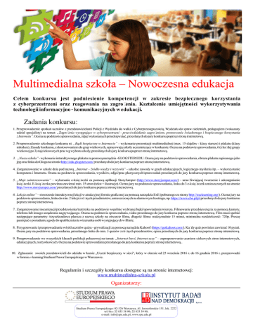 Multimedialna szkoła – Nowoczesna edukacja Celem konkursu jest podniesienie kompetencji w zakresie bezpiecznego korzystania z cyberprzestrzeni oraz reagowania na zagrożenia. Kształcenie umiejętności wykorzystywania technologii informacyjno - komunikacyjnych w edukacji. Zadania konkursu: 1. Przeprowadzenie spotkań uczniów z przedstawicielami Policji z Wydziału do walki z Cyberprzestępczością, Wydziału do spraw nieletnich, pedagogiem (wskazany udział specjalisty) na temat: „Zagrożenia występujące w cyberprzestrzeni - przeciwdziałanie zagrożeniom, promowanie świadomego i bezpiecznego korzystania z Internetu”. Ocena na podstawie sprawozdania, zdjęć wykonanych przedsięwzięć, przesłanych do jury konkursu poprzez stronę internetową. 2. Przeprowadzenie szkolnego konkursu nt. „Bądź bezpieczny w Internecie” – wykonanie prezentacji multimedialnej (max. 15 slajdów - klasy starsze) i plakatu (klasy młodsze). Zasady konkursu, z dostosowaniem do grup wiekowych, opracowują szkoły uczestniczące w konkursie. Ocena na podstawie sprawozdania, 6 (z każdej grupy wiekowej po 3) najciekawszych prac wg wyboru szkoły, przesłanych do jury konkursu poprzez stronę internetową. 3. „Nasza szkoła” - wykonanie interaktywnego plakatu za pomocą narzędzia -GLOGSTER EDU. Ocena jury na podstawie sprawozdania, obrazu plakatu zapisanego jako jpg oraz linku do Gloga na stronie http://edu.glogster.com/ przesłanych do jury konkursu poprzez stronę internetową. 4. Zorganizowanie w szkole dnia pod nazwą „Internet – źródło wiedzy i rozrywki” - szkolne zawody w grach edukacyjnych, logicznego myślenia itp. – wykorzystanie komputera i Internetu. Ocena na podstawie sprawozdania, wyników, zdjęć/prac plastycznych/sprawozdań przesłanych do jury konkursu poprzez stronę internetową. 5. „Moje zainteresowania” – wykonanie e-książeczki za pomocą aplikacji StoryJumper (http://www.storyjumper.com/) - umożliwiającej tworzenie i udostępnianie książeczki. E-książeczka powinna zawierać min. 15 stron (tekst + ilustracje). Ocena jury na podstawie sprawozdania, linku do 3 e-książeczek umieszczonych na stronie http://www.storyjumper.com/ przesłanych do jury konkursu poprzez stronę internetową. 6. Lekcja online” – stworzenie interaktywnej lekcji w atrakcyjnej formie graficznej za pomocą narzędzia ExE (pobranego ze strony http://exelearning.org/). Ocena jury na podstawie sprawozdania, linku do min. 2 lekcji z różnych przedmiotów, umieszczonych na darmowym hostingu, np. https://www.cba.pl/pl przesłanych do jury konkursu poprzez stronę internetową. 7. Zorganizowanie inscenizacji/przedstawienia/teatrzyku na podstawie wspólnie wybranej bajki/opowiadania/wiersza. Filmowanie przedsięwzięcia za pomocą kamery, telefonu lub innego urządzenia nagrywającego. Ocena na podstawie sprawozdania, video przesłanego do jury konkursu poprzez stronę internetową. Film musi spełnić następujące parametry: trzysekundowa plansza z nazwą szkoły na otwarcie filmu, długość filmu: maksymalnie 15 minut, minimalna rozdzielczość: 720p. Proszę pamiętać o posiadaniu zgody do upublicznienia wizerunku osób występujących w filmie. 8. Przygotowanie i przeprowadzenie wśród uczniów quizu - grywalizacji za pomocą narzędzia Kahoot! (https://getkahoot.com/). Każdy quiz powinien zawierać 10 pytań. Ocena jury na podstawie sprawozdania, przesłanego linku do min. 3 quizów z różnych przedmiotów, opisu przesłanych do jury konkursu poprzez stronę internetową. 9. Przeprowadzenie we wszystkich klasach prelekcji pokazowej na temat: „Internet bawi, Internet uczy” – zaproponowanie uczniom ciekawych stron internetowych, edukacyjnych, rozrywkowych. Ocena na podstawie sprawozdania przesłanego do jury konkursu poprzez stronę internetową.. 10. Zgłaszanie swoich przedstawicieli do udziału w kursie „Uczeń bezpieczny w sieci”, który w okresie od 23 września 2016 r. do 16 grudnia 2016 r. przeprowadzi w formie e-learning Studium Prawa Europejskiego w Warszawie. Regulamin i szczegóły konkursu dostępne są na stronie internetowej: www.multimedialna-szkola.pl Oganizatorzy: IB INSTYTUT BADAŃ n D NAD DEMOKRACJĄ Studium Prawa Europejskiego: 02-326 Warszawa, Al. Jerozolimskie 151, lok. 2222 tel./fax: 22 833 38 90; 22 833 39 90; e-mail: [email protected]; www.spe.edu.pl Sp. z o.o.