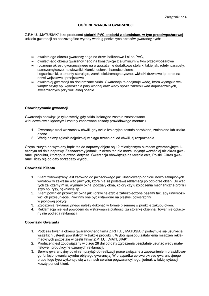 Załącznik nr 4 OGÓLNE WARUNKI GWARANCJI Z.P.H.U. „MATUSIAK” jako producent stolarki PVC, stolarki z aluminium, w tym przeciwpożarowej udziela gwarancji na poszczególne wyroby według poniższych okresów gwarancyjnych: • • • • dwuletniego okresu gwarancyjnego na drzwi balkonowe i okna PVC, dwuletniego okresu gwarancyjnego na konstrukcje z aluminium w tym przeciwpożarowe rocznego okresu gwarancyjnego na wyposażenie dodatkowe stolarki takie jak: rolety, parapety, samozamykacze, nawiewniki, klamki, osłonki, hamulce cierne i ograniczniki, elementy sterujące, zamki elektromagnetyczne, wkładki drzwiowe itp. oraz na drzwi wejściowe i przejściowe dwuletniej gwarancji na dostarczane szkło. Gwarancja ta obejmuje wadę, która wystąpiła wewnątrz szyby np. wyroszenia pary wodnej oraz wady spoza zakresu wad dopuszczalnych, stwierdzonych przy wizualnej ocenie. Obowiązywanie gwarancji Gwarancja obowiązuje tylko wtedy, gdy szkło izolacyjne zostało zastosowane w budownictwie lądowym i zostały zachowane zasady prawidłowego montażu. 1. Gwarancja traci ważność w chwili, gdy szkło izolacyjne zostało obrobione, zmienione lub uszkodzone. 2. Wadę należy zgłosić najpóźniej w ciągu trzech dni od chwili jej rozpoznania. Części zużyte do wymiany bądź też do naprawy objęte są 12 miesięcznym okresem gwarancyjnym liczonym od dnia naprawy. Zaznaczamy jednak, iż okres ten nie może upłynąć wcześniej niż okres gwarancji produktu, którego te części dotyczą. Gwarancja obowiązuje na terenie całej Polski. Okres gwarancji liczy się od daty sprzedaży wyrobu. Obowiązki Klienta 1. Klient zobowiązany jest zarówno do jakościowego jak i ilościowego odbioru nowo zakupionych wyrobów w zakresie wad jawnych, które nie są podstawą reklamacji po odbiorze okien. Do wad tych zaliczamy m.in. wymiary okna, podziały okna, kolory czy uszkodzenia mechaniczne profili i szyb np. rysy, pęknięcia itp. 2. Klient powinien przewozić okna jak i drzwi należycie zabezpieczone pasami tak, aby uniemożliwić ich przesuniecie. Powinny one być ustawione na płaskiej powierzchni w pionowej pozycji. 3. Zgłoszenia reklamacyjnego należy dokonać w formie pisemnej w punkcie zakupu okien. 4. Reklamacja nie jest powodem do wstrzymania płatności za stolarkę okienną. Towar nie opłacony nie podlega reklamacji Obowiązki Gwaranta 1. Podczas trwania okresu gwarancyjnego firma Z.P.H.U. „ MATUSIAK” podejmuje się usunięcia wszelkich usterek powstałych w trakcie produkcji. Wybór sposobu załatwienia roszczeń reklamacyjnych pozostaje w gestii Firmy Z.P.H.U. „MATUSIAK”. 2. Producent jest zobowiązany w ciągu 28 dni od daty zgłoszenia bezpłatnie usunąć wady materiałowe i produkcyjne uznanych reklamacji. 3. Serwis gwarancyjny powinien przyjąć do realizacji prace związane z zapewnieniem prawidłowego funkcjonowania wyrobu objętego gwarancją. W przypadku upływu okresu gwarancyjnego prace tego typu wykonuje się w ramach serwisu pogwarancyjnego, jednak w takiej sytuacji koszty ponosi klient. Wyłączenia odpowiedzialności 1. Producent odpowiada z tytułu udzielonej gwarancji do wysokości wartości zakupionej stolarki. 2. Gwarancja ta nie obejmuje wad powstałych w wyniku: • • • • • dokonywanych napraw wyrobów lub wymiany ich elementów przez osoby nieupoważnione, nieprawidłowego transportu, który mógł spowodować: pęknięcia zgrzewów, szyb, trwałe odkształcenia, zarysowania lub wgniecenia profilu, złej eksploatacji, która ma szczególny wpływa na niedrożność otworów odwadniających, niewłaściwej konserwacji lub jej braku, mycia nieodpowiednimi środkami, kontaktu wyrobów z przedmiotami gorącymi (np. żelazko, grzałka, itp.), zdarzeń losowych (powódź itp.). Gwarancji nie podlegają : • • • • • mechaniczne uszkodzenia szyb takie jak rysy zewnętrzne, pęknięcia, otarcia itp. wyroby z wadami jawnymi, elementy, które ulęgają normalnemu zużyciu, wady dopuszczalne zgodnie z obowiązującymi normami, wady, które po zamontowaniu SA niewidoczne i nie mają wpływu na jego wartość użytkową np. wgniecenia zewnętrznych stron ościeżnicy, zarysowania, itp.