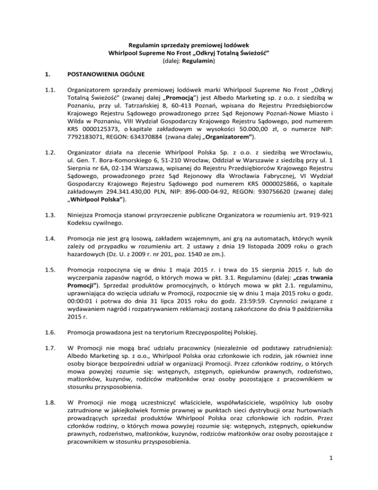 Regulamin sprzedaży premiowej lodówek Whirlpool Supreme No Frost „Odkryj Totalną Świeżość” (dalej: Regulamin) 1. POSTANOWIENIA OGÓLNE 1.1. Organizatorem sprzedaży premiowej lodówek marki Whirlpool Supreme No Frost „Odkryj Totalną Świeżośd” (zwanej dalej „Promocją”) jest Albedo Marketing sp. z o.o. z siedzibą w Poznaniu, przy ul. Tatrzaoskiej 8, 60-413 Poznao, wpisana do Rejestru Przedsiębiorców Krajowego Rejestru Sądowego prowadzonego przez Sąd Rejonowy Poznao-Nowe Miasto i Wilda w Poznaniu, VIII Wydział Gospodarczy Krajowego Rejestru Sądowego, pod numerem KRS 0000125373, o kapitale zakładowym w wysokości 50.000,00 zł, o numerze NIP: 7792183071, REGON: 634370884 (zwana dalej „Organizatorem”). 1.2. Organizator działa na zlecenie Whirlpool Polska Sp. z o.o. z siedzibą we Wrocławiu, ul. Gen. T. Bora-Komorskiego 6, 51-210 Wrocław, Oddział w Warszawie z siedzibą przy ul. 1 Sierpnia nr 6A, 02-134 Warszawa, wpisanej do Rejestru Przedsiębiorców Krajowego Rejestru Sądowego, prowadzonego przez Sąd Rejonowy dla Wrocławia Fabrycznej, VI Wydział Gospodarczy Krajowego Rejestru Sądowego pod numerem KRS 0000025866, o kapitale zakładowym 294.341.430,00 PLN, NIP: 896-000-04-92, REGON: 930756620 (zwanej dalej „Whirlpool Polska”). 1.3. Niniejsza Promocja stanowi przyrzeczenie publiczne Organizatora w rozumieniu art. 919-921 Kodeksu cywilnego. 1.4. Promocja nie jest grą losową, zakładem wzajemnym, ani grą na automatach, których wynik zależy od przypadku w rozumieniu art. 2 ustawy z dnia 19 listopada 2009 roku o grach hazardowych (Dz. U. z 2009 r. nr 201, poz. 1540 ze zm.). 1.5. Promocja rozpoczyna się w dniu 1 maja 2015 r. i trwa do 15 sierpnia 2015 r. lub do wyczerpania zapasów nagród, o których mowa w pkt. 3.1. Regulaminu (dalej: „czas trwania Promocji”). Sprzedaż produktów promocyjnych, o których mowa w pkt 2.1. regulaminu, uprawniająca do wzięcia udziału w Promocji, rozpocznie się w dniu 1 maja 2015 roku o godz. 00:00:01 i potrwa do dnia 31 lipca 2015 roku do godz. 23:59:59. Czynności związane z wydawaniem nagród i rozpatrywaniem reklamacji zostaną zakooczone do dnia 9 października 2015 r. 1.6. Promocja prowadzona jest na terytorium Rzeczypospolitej Polskiej. 1.7. W Promocji nie mogą brad udziału pracownicy (niezależnie od podstawy zatrudnienia): Albedo Marketing sp. z o.o., Whirlpool Polska oraz członkowie ich rodzin, jak również inne osoby biorące bezpośredni udział w organizacji Promocji. Przez członków rodziny, o których mowa powyżej rozumie się: wstępnych, zstępnych, opiekunów prawnych, rodzeostwo, małżonków, kuzynów, rodziców małżonków oraz osoby pozostające z pracownikiem w stosunku przysposobienia. 1.8. W Promocji nie mogą uczestniczyd właściciele, współwłaściciele, wspólnicy lub osoby zatrudnione w jakiejkolwiek formie prawnej w punktach sieci dystrybucji oraz hurtowniach prowadzących sprzedaż produktów Whirlpool Polska oraz członkowie ich rodzin. Przez członków rodziny, o których mowa powyżej rozumie się: wstępnych, zstępnych, opiekunów prawnych, rodzeostwo, małżonków, kuzynów, rodziców małżonków oraz osoby pozostające z pracownikiem w stosunku przysposobienia. 1 1.9. Promocją nie są objęte produkty zakupione w ramach programów pracowniczych Whirlpool Polska pt. „EURO Family” i „Dla Ciebie”. 1.10. Promocja przeznaczona jest wyłącznie dla zamieszkałych na terytorium Rzeczpospolitej Polskiej pełnoletnich osób fizycznych, posiadających pełną zdolnośd do czynności prawnych, które dla celów niezwiązanych z prowadzoną działalnością gospodarczą, w charakterze konsumentów (zgodnie z art. 221 Kodeksu cywilnego) kupują od profesjonalnych podmiotów działających na rynku polskim produkty objęte Promocją, o których mowa w pkt 2.1. regulaminu (dalej: „Uczestnik”). 1.11. Warunkiem uczestnictwa w Promocji jest posiadanie przez Uczestnika rachunku bankowego prowadzonego przez polski bank i w polskiej walucie (PLN), który to rachunek jest niezbędny w celu wydania nagrody pieniężnej przez Organizatora. W przypadku Uczestników, którzy na dzieo wydania nagrody nie będą posiadali ww. rachunku bankowego, nagroda przyznana takim Uczestnikom zgodnie z niniejszym regulaminem nie podlega wydaniu, a Organizator wyda takim Uczestnikom nagrody w indywidualnie uzgodnionym trybie (np. poprzez przekaz pocztowy). W takim przypadku Organizator może potrącid z wartości nagrody ewentualne dodatkowe koszty poniesione przez Organizatora w celu jej wydania (np. koszty wykonania przekazu pocztowego). 1.12. Organizator utworzył stronę internetową Promocji dostępną od 15.05.2015r. pod adresem www.supremenofrost.pl (dalej: „Strona Promocji”). 2. WARUNKI UCZESTNICTWA W PROMOCJI 2.1. Promocją objęte są wszystkie chłodziarko-zamrażarki marki „WHIRLPOOL” z linii „SUPREME NO FROST” z zamrażalnikiem dolnym, dostępne w sieci dystrybucji Whirlpool Polska na terenie Polski w okresie od 1 maja 2015 r. od godz. 00:00:01 do 31 lipca 2015 r. do godz. 23:59:59, z wyłączeniem modeli: BSNF 8101 W oraz BSNF 8101 OX (zwane dalej „Produktami Promocyjnymi”). 2.2. Promocja polega na nagrodzeniu Uczestnika, który w czasie trwania Promocji zapewni spełnienie wszystkich następujących działao: a) zakupi co najmniej jeden z Produktów Promocyjnych w okresie od 1 maja 2015 r. godz. 00:00:01 do 31 lipca 2015 roku godz. 23:59:59 zgodnie z pkt. 1.10. Regulaminu, tj. w celu niezwiązanym z prowadzoną działalnością gospodarczą lub zawodową (w charakterze konsumenta w rozumieniu art. 221 Kodeksu cywilnego); b) zgłosi w przeciągu 14 dni od daty zakupu i nie później niż do dnia 15 sierpnia 2015 roku zakup Produktu Promocyjnego Organizatorowi poprzez przesłanie prawidłowo wypełnionego formularza zgłoszeniowego, zgodnie z zasadami określonymi w pkt 2.3.2.5. Regulaminu (dalej: „formularz zgłoszeniowy”); Uczestnicy, który zakupią