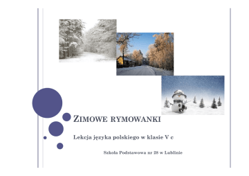ZIMOWE RYMOWANKI Lekcja języka polskiego w klasie V c Szkoła Podstawowa nr 28 w Lublinie ZIMA W OBRAZIE POETYCKIM Zima poetyckim słowem malowana to różne obrazy widziane okiem fotografa, wrażliwego wędrowca, rozbawionego dziecka, poszukiwacza przygód, miłośnika przyrody, człowieka samotnego i szczęśliwej rodziny siedzącej przy stole wigilijnym. Pejzaż zimowy budzi różne reakcje. Jednych zachwyca, innych mrozi. Zawsze wywołuje refleksję. Czy łatwo opisać zimę? Czy łatwo znaleźć odpowiednie słowo w opisie zimowego obrazu? O ZWYKŁEJ ZIMIE MÓWIĄ POECI Język poetyckiego opisu zimy odróżnia się od naszego codziennego języka. Jest niezwykły. v Występują w nim porównania, przenośnie, epitety, wyrazy dźwiękonaśladowcze. v Język poetycki działa na naszą wyobraźnię. Podpowiada, że warto spojrzeć na zimę okiem poety. Okaże się wtedy, że może ożyć i zaczarować, wywołać zadumę lub niechęć. v Każda pora roku jest piękna, dlatego trzeba opiewać również urok zimowego pejzażu. v Poetyckie strofy o zimie najczęściej są rymowane. v ZIMOWE METAFORY, EPITETY, PORÓWNANIA Błysną świeczki na choince uśmiechy na twarzach. (…) W grudniu rzadko ptak zaśpiewa w srebrze stoją wszystkie drzewa. Janusz Minkiewicz ******* Wróbelkowi serce rośnie, że wiosny doczeka Rosną w styczniu zaspy śniegu, że wóz w nich ugrzęźnie a na szybach rosną srebrne liście i gałęzie. Jerzy Ficowski http://dzieci.epapa.pl/wiersze/2 ******* Zima wcale nie jest cicha w zimie wiele głosów słychać . (…) Mróz wygrywa groźnym palcem na klawiszach sopli walce. Dorota Gellner Zima ZIMOWE METAFORY, EPITETY, PORÓWNANIA Nasza zima biała chustą się odziała. Idzie, idzie do nas w gości w srebrnych blaskach cała! Maria Konopnicka Zima ******* Pojadę ja na łyżewkach po lodzie (…) Lód jest śliski, łyżwy ostre jak noże. Hanna Ożogowska Na lodzie ******* Jedzie pani Zima na koniku białym Hanna Ożogowska Jedzie zima ******* Biegały, ptaszki biegały Po śniegu jak płótno białym. Tadeusz Kubiak Biegały ptaszki ZIMOWE METAFORY, EPITETY, PORÓWNANIA Sanki suną W śnieżnej bezbrzeży, Srebrną łuną Biel mi się śnieży. Jan Brzechwa Elegia śnieżna Okruchy śniegu Siecią swych fal Zasnuły w biegu Bezbronną dal. Bolesław Leśmian Noc zimowa ******* ******* Hu! Hu! Ha! Nasza zima zła! Szczypie w nosy, szczypie w uszy Mroźnym śniegiem w oczy prószy, Wichrem w polu gna! Maria Konopnicka Zła zima ******* Świeciła gwiazda na niebie srebrna i staroświecka. Świeciła wigilijnie, każdy ją zna od dziecka. Leopold Staff Gwiazda ZIMOWE METAFORY, EPITETY, PORÓWNANIA Senność gęsta jak śnieg i krążąca jak śnieg Zasypuje śnieżnemi płatkami sennemi. Julina Tuwim Zadymka ******* Zakuła zima okna lodem ku uciesze Dzieci, co, tuląc złoto do srebrnych szyb głowy, Odwilżają oddechem krążki i na piesze Patrzą cienie spieszące drogą w zmierzch liliowy. Leopold Staff Zacisze ******* Lecą niezmordowane w czapeczkach futrzanych. Zaciskają piąstki w biegu, miasta i wioski kryją pod śniegiem. Józef Ratajczak Śnieżynki ******* Więc gdy śnieg na święta zatańczy, Pomyśl, proszę, najukochańszy, O tym panu, co układa rymy Konstanty Ildefons Gałczyński Kto wymyślił choinki NASZE RYMOWANKI Uruchomić wyobraźnię i trochę wrażliwości na dobro v Dostrzec, że świat jest piękny i wyrazić jego urodę niezwykłymi wyrażeniami v Opisać pejzaż wyszukanymi lub dobrze nam znanymi epitetami v Podkreślić zaobserwowane cechy ciekawym porównaniem v Ująć słowa w wersy i wprowadzić rymy v To nasz przepis na rymowankę ZIMOWA BAJKA GABRYSI I PATRYCJI Wszędzie biało jest na łące, Nie biegają już zające. Rudy lis na białym śniegu, Pozostawia ślady w biegu. Poszukuje coś pod śniegiem, A przed psami zmyka biegiem. Lisa psy nie dogoniły, Długo przy norze węszyły. Nie znalazły lisa wreszcie. Może go spotkają jeszcze. RYMOWANKI SARY W zimie jest śniegu lawina Zima jak bajkowa kraina. Drzewa wyglądają jak białe skrzaty, A góry śniegu jak ich małe chaty. Do domu mają blisko Choć po drodze jest ślisko. Zima ubrana w biały puch Wygląda jak biały duch. Po południu słonko świeci Wtedy na sanki wychodzą dzieci. RYMOWANKI ZUZI W ten zimowy dzień pojadę sankami Zrobię sobie zdjęcie z dwoma bałwankami A potem pójdę ścieżką gdzieś bardzo daleko Tam gdzie biały śnieg się zamienia w mleko. **** Zima to taki czas, kiedy zaśnieżony las Łąki, parki i ogrody. Piękny jest widok białej przyrody. RYMOWANKI ZUZI **** Biała łąka, na niej dzieci Ponad łąką słonko świeci. A ja na nie patrzę się I za nimi pobiec chcę. **** Prawie wieczór a ja wciąż bawię się na dworze. Drzewa, krzewy i trawniki są w białym kolorze. Może sobie wrócę już, chociaż sama nie wiem. Może sobie posiedzę jeszcze na tym Białym drzewie? RYMOWANKI POLI I KINGI Kiedy wyszłam, było ślisko, To tak jakby lodowisko. Przejechałam się sankami Z białymi bałwankami. Pojadę na zimowisko, Lodowisko będzie blisko. **** Zaraz święta, piękne święta, niech każdy o nich pamięta. Święta ,święta i po świętach, potem zima i kolęda. RYMOWANKI MICHAŁA I KONRADA Zima jest biała, gdy śnieg popada Na drodze czasem jest lód Zimny jak straszny chłód Chodźmy z zimą na zimowisko A po drodze będzie ślisko. Zima przyszła w wielkim mrozie Ale roztopić się nie może. RYMOWANKI NATALKI I OLI Jadę, jadę w dół sankami pomiędzy białymi drzewami. Drzewa zasypane białym puchem a pod nimi mały suseł. **** Wszyscy lubią zimę białą Bo są święta- śniegu mało! **** Zima przyszła, zaśnieżyła, a potem była wiosna i wszystko rozmroziła. ODAUTORSKA REFLEKSJA Czy łatwo było rymować? v Tak, bo rymy same przychodzą mi do głowy. Zuzia v Nie, bo nic nie umiem wymyślić. Martyna ZADANIE DLA KAŻDEGO Ułóż opowiadanie, któremu nadasz tytuł Zimowa historyjka. Zastosuj narracj