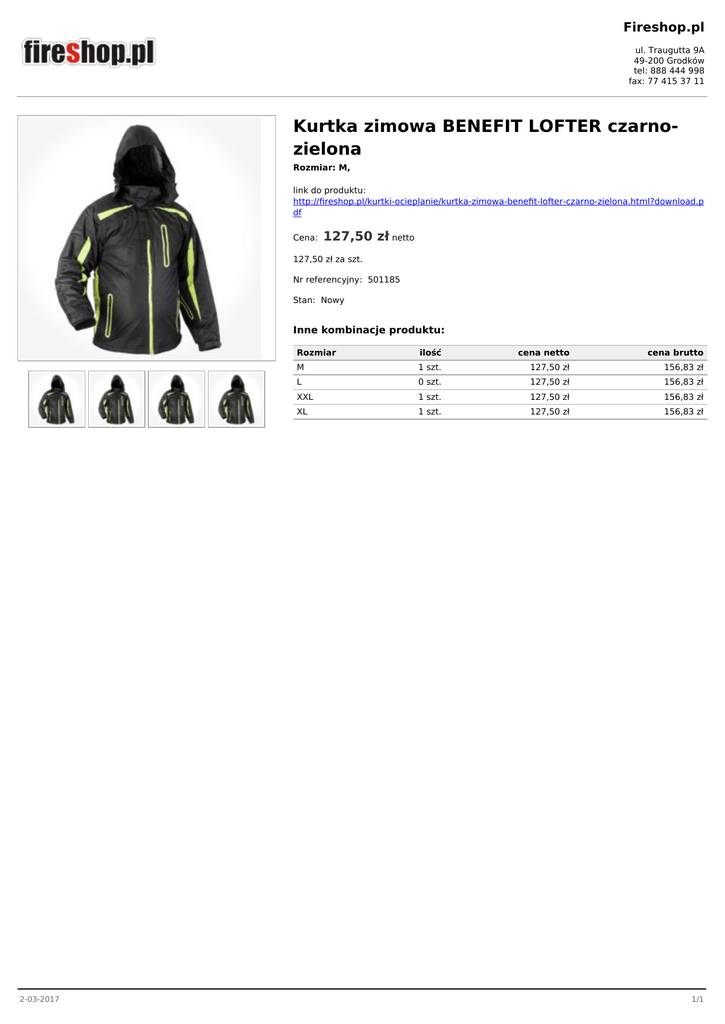 Fireshop.pl ul. Traugutta 9A 49-200 Grodków tel: 888 444 998 fax: 77 415 37 11 Kurtka zimowa BENEFIT LOFTER czarnozielona Rozmiar: M, link do produktu: http://fireshop.pl/kurtki-ocieplanie/kurtka-zimowa-benefit-lofter-czarno-zielona.html?download.p df Cena: 127,50 zł netto 127,50 zł za szt. Nr referencyjny: 501185 Stan: Nowy Inne kombinacje produktu: 2-03-2017 Rozmiar ilość cena netto cena brutto M 1 szt. 127,50 zł 156,83 zł L 0 szt. 127,50 zł 156,83 zł XXL 1 szt. 127,50 zł 156,83 zł XL 1 szt. 127,50 zł 156,83 zł 1/1