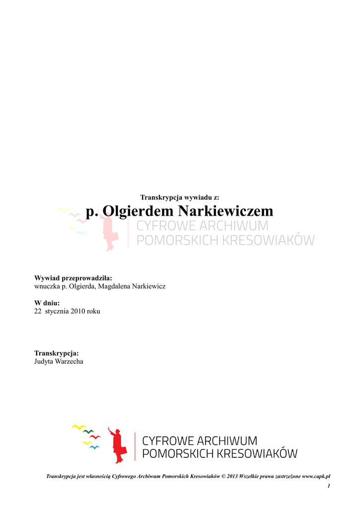 Transkrypcja wywiadu z: p. Olgierdem Narkiewiczem Wywiad przeprowadziła: wnuczka p. Olgierda, Magdalena Narkiewicz W dniu: 22 stycznia 2010 roku Transkrypcja: Judyta Warzecha Transkrypcja jest własnością Cyfrowego Archiwum Pomorskich Kresowiaków © 2013 Wszelkie prawa zastrzeżone www.capk.pl 1 Gdzie mieszkałeś przed drugą wojną światową? - Przed drugą wojną światową i niemal w czasie całej wojny mieszkałem w Wilnie. Zresztą urodziłem się w Wilnie, więc właściwie jestem rodowitym Wilnianinem. Mieszkałem tam razem z rodzicami, z ojcem i matką. Ojciec został w czasie wojny, lekarz – naczelny lekarz miasta Wilna, został w czasie wojny aresztowany przez Bolszewików, wywieziony do Rosji i zamordowany w więzieniu w mieście w Związku Radzieckim. Zostałem, więc tylko z matką. Sytuacja robiła się coraz bardziej niebezpieczna. W czasie okupacji sowieckiej groziło nam przede wszystkim wywiezienie, bo ojciec został… bo był uważany za wroga ludu. A my z matką byliśmy zagrożeni, że albo nas wywiozą albo nas aresztują. W związku z tym sytuacja robiła się niebezpieczna i musiałem się ukrywać. Ukrywałem się właściwie przez ostatnie miesiące, częściowo nawet w szpitalu psychiatrycznym. I aż do momentu wyjazdu z Wilna istniała konieczność ukrywania się, konieczność unikania, co najmniej, tych władz radzieckich. Dlaczego zdecydowaliście się na wyjazd z Wilna? - Razem z matką mieszkałem, jako, że ojciec był aresztowany. Sytuacja robiła się coraz trudniejsza, groziło aresztowanie, groziło wywiezienie, co najmniej. Postanowiliśmy wyjechać szybko z Wilna do Polski i udało się nam to załatwić dosyć szybko. Oprócz tego, oprócz mojej matki, w Wilnie jeszcze żył mój przyrodni brat, razem z żoną i ze swoją rodziną i razem wszyscy zdecydowaliśmy się wyjechać jednym wspólnym transportem do Polski. Decyzja była bardzo trudna bo byliśmy bardzo przywiązani do rodzinnego miasta, do Wilna. Ale właściwie nie było już żadnego innego wyjścia. Był to jedyny sposób uratowania się w tej trudnej sytuacji. A dziadku, ile miałeś lat? - Wtedy miałem 19 lat, więc byłem już właściwie po ukończeniu liceum. Liceum skończyłem na tajnych kompletach, jeszcze w Wilnie. I w związku z tym mogłem już czuć się osobą, prawie dorosłą. Co zabraliście ze sobą, a co zostawiliście? - Właściwie mieliśmy w ogóle bardzo mało rzeczy więc było bardzo mało rzeczy do zabrania. Ale w rzeczywistości zostawiliśmy dom, zostawiliśmy mieszkanie, w którym już nie mieszkaliśmy gdyż byliśmy wysiedleni przedtem z tego domu. I właściwie mieliśmy trochę książek i tylko ubrania, obuwie, takie rzeczy codziennego użytku. Ale żadnych jakiś rzeczy… No trochę kosztowności, trochę dokumentów ale żadnych jakiś takich większych rzeczy nie braliśmy. Natomiast z nami jechał, jak powiedziałem, mój brat i ten wziął trochę mebli, m.in. fortepian który zajmował masę miejsca. Problem był bardzo skomplikowany, bo jechaliśmy przecież takim pociągiem, mieliśmy taki wagon. Wagon był dla koło 12 osób, 12 osób było w wagonie. Więc trudno było coś większego zabrać. Transkrypcja jest własnością Cyfrowego Archiwum Pomorskich Kresowiaków © 2013 Wszelkie prawa zastrzeżone www.capk.pl 2 Jak wyglądała droga do Gdańska? - Więc z Wilna wyjechaliśmy na przełomie zimy i wiosny 45 roku. Było dosyć chłodno. Był to bardzo ciekawy moment, bo akurat tego dnia dowiedzieliśmy się, że wojska polskie wkroczyły do Gdańska. Więc nasz wyjazd z Wilna, łączył się w pewnym sensie z oswobodzeniem Gdańska. Był to pierwszy sygnał. Wprawdzie nie jechaliśmy bezpośrednio do Gdańska ale był to jakiś taki sygnał, który no jakoś połączył nas, że w przyszłości będziemy mieszkali w Gdańsku. Ale podróż nasza była właściwie bardzo skomplikowana, bo moja osobiście składała się z trzech etapów, bo główna podróż z Wilna, to była podróż: Wilno-Łódź. Jechaliśmy przez cały tydzień, droga była bardzo skomplikowana. Jechało się bardzo powoli. Jechało się właściwie w trudnych warunkach, oczywiście było ciemno, zimno. Był to bądź co bądź przełom zimy i wiosny ale ta droga była bardzo skomplikowana. Jechaliśmy przez Białystok, w którym dworzec był całkowicie zrujnowany, potem jechaliśmy do Warszawy. Przez Warszawę jechaliśmy sytuacja była dramatyczna, w Warszawie staliśmy koło trzech godzin. Wyszedłem na zewnątrz z pociągu, wolno było wyjść na trzy godziny, wiedzieliśmy, że pociąg będzie tyle stał i wyszedłem zobaczyć jak wygląda Warszawa. I zobaczyłem sytuację dramatyczną, wyszedłem na ciąg ulic Marszałkowskiej, szedłem przez około dwa kilometry i nie mogłem spotkać jednego, żywego człowieka. Nie było, jednego żywego człowieka. Nie było właściwie jednego, całego domu. Robiło to straszne wrażenie. Potem pod Kutnem nastąpił nalot niemieckich samolotów, na szczęście nie trafili w nasz pociąg, trafili obok, ale oczywiście przeżyliśmy ciężką noc. I dojechaliśmy do Łodzi, do Rudej pabianickiej i tutaj byłem zaskoczony, bo właściwie tutaj istniało całkowicie normalne życie. Tam w Warszawie, w Białymstoku, w Wilnie, były ruiny, ciemno, nie było światła. Tutaj było normalne życie. Ludzie chodzili po ulicach, wychodzili z kościołów, mieli porządne ubrania. I postanowiliśmy wtedy wysiąść, właśnie zatrzymać się w tym mieście, które wygląda jakoś normalnie. Jest podobne do innych miast polskich takich jakie były przed wojną. Bardzo życzliwi mieszkańcy Łodzi, znaleźli dla nas lokal takie dwa pokoje, łącznie z takim jak gdyby sklepem. Był to taki lokal przysklepowy. Umożliwili nam zamieszkanie w tym lokalu i tam zatrzymaliśmy się mniej więcej przez rok, w Łodzi. Tutaj spędzaliśmy pierwszy rok, mój brat był elektrykiem, inżynierem, pracował w elektrowni miejskiej, moja matka