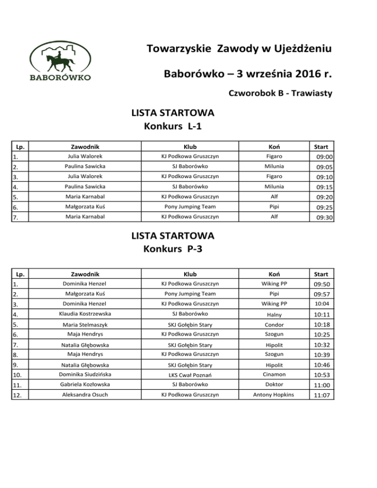 Towarzyskie Zawody w Ujeżdżeniu Baborówko – 3 września 2016 r. Czworobok B - Trawiasty LISTA STARTOWA Konkurs L-1 Lp. Zawodnik Klub Koń Start 1. Julia Walorek KJ Podkowa Gruszczyn Figaro 09:00 2. Paulina Sawicka SJ Baborówko Milunia 09:05 3. Julia Walorek KJ Podkowa Gruszczyn Figaro 09:10 4. Paulina Sawicka SJ Baborówko Milunia 09:15 5. Maria Karnabal KJ Podkowa Gruszczyn Alf 09:20 6. Małgorzata Kuś Pony Jumping Team Pipi 09:25 7. Maria Karnabal KJ Podkowa Gruszczyn Alf 09:30 LISTA STARTOWA Konkurs P-3 Lp. Zawodnik Klub Koń Start 1. Dominika Henzel KJ Podkowa Gruszczyn Wiking PP 09:50 2. Małgorzata Kuś Pony Jumping Team Pipi 09:57 3. Dominika Henzel KJ Podkowa Gruszczyn Wiking PP 10:04 4. Klaudia Kostrzewska SJ Baborówko Halny 10:11 5. Maria Stelmaszyk SKJ Gołębin Stary Condor 10:18 6. Maja Hendrys KJ Podkowa Gruszczyn Szogun 10:25 7. Natalia Głębowska SKJ Gołębin Stary Hipolit 10:32 8. Maja Hendrys KJ Podkowa Gruszczyn Szogun 10:39 9. Natalia Głębowska SKJ Gołębin Stary Hipolit 10:46 10. Dominika Siudzińska LKS Cwał Poznań Cinamon 10:53 11. Gabriela Kozłowska SJ Baborówko Doktor 11:00 12. Aleksandra Osuch KJ Podkowa Gruszczyn Antony Hopkins 11:07 Towarzyskie Zawody w Ujeżdżeniu Baborówko – 3 września 2016 r. Czworobok A - Piaszczysty LISTA STARTOWA Konkurs L-3 Lp. 1. 2. 3. 4. 5. 6. 7. 8. 9. 10. 11. 12. 13. 14. 15. 16. 17. 18. 19. 20. 21. 22. 23. 24. 25. 26. 27. Zawodnik Klub Koń Zuzanna Maternik Anna Karolczak Zuzanna Maternik Julia Giza Justyna Celebias Marta Musialska Marta Labecka Marta Musialska Marta Labecka Arkadiusz Jóźwiak Aleksandra Nawrocka Aleksandra Walas Zuzanna Kosmider Aleksandra Walas Anna Wieczorkiewicz Katarzyna Wosik Anna Wieczorkiewicz Katarzyna Wosik Artur Ankiewicz Izabela Kozłowska Artur Ankiewicz Gabriela Wieczor Zuzanna Maternik Wiktoria Nowacka Zuzanna Maternik Klaudia Kostrzewska Iga Wesołowska BPK SJ Baborówko BPK SJ Baborówko SJ Baborówko BPK SJ Baborówko BPK SJ Baborówko SJ Baborówko KJ Podkowa Gruszczyn BPK SJ Baborówko BPK KJ Equarius KJ Ranczo Poznań KJ Equarius KJ Ranczo Poznań KJ Equarius SJ Baborówko KJ Equarius SJ Baborówko BPK KJ Podkowa Gruszczyn BPK SJ Baborówko Fundacja Kaczyna Duma Florencja Duma Filozofia Ferara Mansarda Feriana Mansarda Feriana Firefly Alister Koleus Florencja Koleus Rusłan Zahun Rusłan Zahun Harfa Florencja Harfa Feriana Morgan P Płotka Morgan P Arabian-Atin-RO Cyprys Start 09:00 09:06 09:12 09:18 09:24 09:30 09:36 09:42 09:48 09:54 10:00 10:06 10:12 10:18 10:24 10:30 10:36 10:42 10:48 10:54 11:00 11:06 11:12 11:18 11:24 11:30 11:36 Towarzyskie Zawody w Ujeżdżeniu Baborówko – 3 września 2016 r. Czworobok A - Piaszczysty LISTA STARTOWA Konkurs P-2 Lp. 1. 2. 3. 4. 5. 6. 7. 8. 9. 10. 11. 12. 13. 14. 15. 16. 17. 18. 19. 20. 21. 22. 23. 24. Zawodnik Klub Koń Iga Wesołowska Dominika Siudzińska Agata Dahlke Ewa Chomicz Klaudia Kostrzewska Ewa Chomicz Klaudia Mentel-Bendlewska Arkadiusz Jóźwiak Klaudia Mentel-Bendlewska Dominika Kiełczewska-Sawicka Patrycja Zubko Dominika Kiełczewska-Sawicka Martyna Kaczmarek Katarzyna Woźniak Grzegorz Rychlik Anna Sobańska Grzegorz Rychlik Dominika Semrau Monika Majchrzak Dominika Semrau Monika Majchrzak Bożena Ziomek Agata Dahlke Bożena Ziomek Fundacja Kaczyna LKS Cwał Poznań Kłos Budzyń SJ Baborówko SJ Baborówko SJ Baborówko BPK SJ Baborówko BPK BPK SJ Baborówko BPK KJ Zagórów KJ Podkowa Gruszczyn LKS Cwał Poznań SJ Baborówko LKS Cwał Poznań BPK Idmar Krajkowo BPK Idmar Krajkowo KJ Profil Piła Kłos Budzyń KJ Profil Piła Cyprys Cinamon Typier Fllattery Halny Flattery Limero Forta Limero Chimera Cyklon Chimera Silver Lady Czekolada Cherubin Frontiera Cherubin Pedro Dante Pedro Dante Hannah Ulivan Hannah Start 12:45 12:53 13:01 13:09 13:17 13:25 13:33 13:41 13:49 13:57 14:05 14:13 14:21 14:29 14:37 14:45 14:53 15:01 15:09 15:17 15:25 15:33 15:41 15:49 Towarzyskie Zawody w Ujeżdżeniu Baborówko – 3 września 2016 r. Czworobok B - Trawiasty LISTA STARTOWA Konkurs D-2 Lp. 1. 2. 3. 4. 5. 6. 7. Zawodnik Klub Koń Start Natalia Głębowska Wiktoria Nowacka Natalia Głębowska Marta Stachowiak Katarzyna Woźniak Martyna Kaczmarek Patrycja Zubko SKJ Gołębin Stary KJ Podkowa Gruszczyn SKJ Gołębin Stary KJ Podkowa Gruszczyn KJ Podkowa Gruszczyn KJ Zagórów SJ Baborówko Korida P Płotka Korida P Alister Czekolada Silver Lady Cyklon 14:45 14:51 14:57 15:03 15:09 15:15 15:21 Regionalne Zawody w Ujeżdżeniu Baborówko – 3 września 2016 r. Czworobok A - Piaszczysty LISTA STARTOWA Konkurs N-4 Lp. 1. 2. 3. 4. Zawodnik Klub Koń Dorota Korpa Alicja Hadryś-Nowak Dorota Korpa Natalia Organista BPK KS Centurion BPK KS Centurion Tumnus Happy Dancer Tumnus King Ron P Start 16:45 16:53 17:01 17:09 LISTA STARTOWA Konkurs C-2 Lp. 1. 2. 3. 4. Zawodnik Klub Koń Natalia Organista Tomasz Nowakowski Marta Błażko Alicja Hadryś-Nowak KS Centurion UKS Fiord Młodzikowo KJ Golden Dream KS Centurion King Ron P Denar Devinette Apollo Start 17:40 17:48 17:56 18:04
