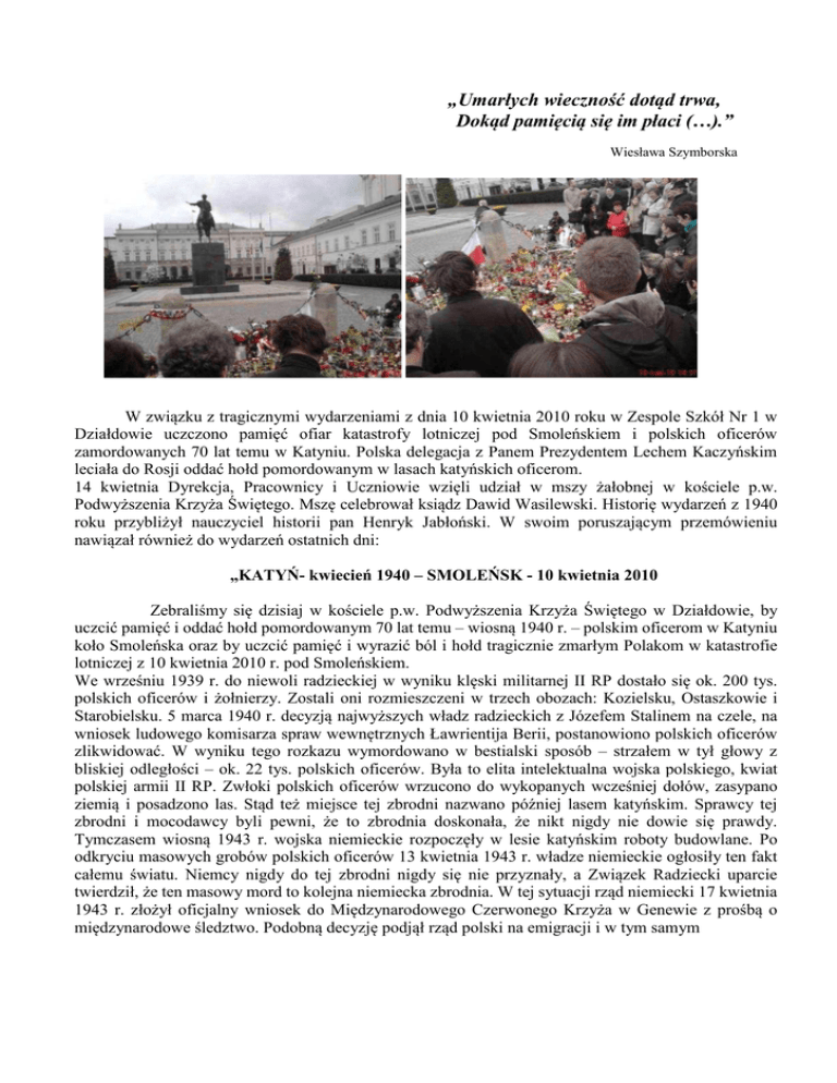 „Umarłych wieczność dotąd trwa, Dokąd pamięcią się im płaci (…).” Wiesława Szymborska W związku z tragicznymi wydarzeniami z dnia 10 kwietnia 2010 roku w Zespole Szkół Nr 1 w Działdowie uczczono pamięć ofiar katastrofy lotniczej pod Smoleńskiem i polskich oficerów zamordowanych 70 lat temu w Katyniu. Polska delegacja z Panem Prezydentem Lechem Kaczyńskim leciała do Rosji oddać hołd pomordowanym w lasach katyńskich oficerom. 14 kwietnia Dyrekcja, Pracownicy i Uczniowie wzięli udział w mszy żałobnej w kościele p.w. Podwyższenia Krzyża Świętego. Mszę celebrował ksiądz Dawid Wasilewski. Historię wydarzeń z 1940 roku przybliżył nauczyciel historii pan Henryk Jabłoński. W swoim poruszającym przemówieniu nawiązał również do wydarzeń ostatnich dni: „KATYŃ- kwiecień 1940 – SMOLEŃSK - 10 kwietnia 2010 Zebraliśmy się dzisiaj w kościele p.w. Podwyższenia Krzyża Świętego w Działdowie, by uczcić pamięć i oddać hołd pomordowanym 70 lat temu – wiosną 1940 r. – polskim oficerom w Katyniu koło Smoleńska oraz by uczcić pamięć i wyrazić ból i hołd tragicznie zmarłym Polakom w katastrofie lotniczej z 10 kwietnia 2010 r. pod Smoleńskiem. We wrześniu 1939 r. do niewoli radzieckiej w wyniku klęski militarnej II RP dostało się ok. 200 tys. polskich oficerów i żołnierzy. Zostali oni rozmieszczeni w trzech obozach: Kozielsku, Ostaszkowie i Starobielsku. 5 marca 1940 r. decyzją najwyższych władz radzieckich z Józefem Stalinem na czele, na wniosek ludowego komisarza spraw wewnętrznych Ławrientija Berii, postanowiono polskich oficerów zlikwidować. W wyniku tego rozkazu wymordowano w bestialski sposób – strzałem w tył głowy z bliskiej odległości – ok. 22 tys. polskich oficerów. Była to elita intelektualna wojska polskiego, kwiat polskiej armii II RP. Zwłoki polskich oficerów wrzucono do wykopanych wcześniej dołów, zasypano ziemią i posadzono las. Stąd też miejsce tej zbrodni nazwano później lasem katyńskim. Sprawcy tej zbrodni i mocodawcy byli pewni, że to zbrodnia doskonała, że nikt nigdy nie dowie się prawdy. Tymczasem wiosną 1943 r. wojska niemieckie rozpoczęły w lesie katyńskim roboty budowlane. Po odkryciu masowych grobów polskich oficerów 13 kwietnia 1943 r. władze niemieckie ogłosiły ten fakt całemu światu. Niemcy nigdy do tej zbrodni nigdy się nie przyznały, a Związek Radziecki uparcie twierdził, że ten masowy mord to kolejna niemiecka zbrodnia. W tej sytuacji rząd niemiecki 17 kwietnia 1943 r. złożył oficjalny wniosek do Międzynarodowego Czerwonego Krzyża w Genewie z prośbą o międzynarodowe śledztwo. Podobną decyzję podjął rząd polski na emigracji i w tym samym dniu co delegacja niemiecka złożył odpowiednie dokumenty do Genewy. Można powiedzieć, że rząd Związku Radzieckiego tylko na to czekał. Bez porozumienia z polskim rządem emigracyjnym uznał działania strony polskiej za dowód współpracy z Niemcami, za akt zdrady radzieckiego sojusznika i w nocy z 25 na 26 kwietnia 1943 r., nie czekając na żadne polskie wyjaśnienia, zerwał stosunki dyplomatyczne z polskim rządem na emigracji. I tak rozpoczęło się trwające blisko 50 lat kłamstwo katyńskie. Kolejne rządy PRL, kolejni władcy radzieccy kłamali, aż do 1990 – 1991r. Wielcy przywódcy Zachodu i Stanów Zjednoczonych – milczeli. Prawda o Katyniu ujrzała częściowo światło dzienne dzięki polityce radzieckiego przywódcy Michaiła Gorbaczowa i pierwszego prezydenta Rosji Borysa Jelcyna.To Jelcyn w 1991 r. przekazał stronie polskiej część dokumentów historycznych potwierdzających radziecki udział w zbrodni katyńskiej. 10 kwietnia 2010 r. w godzinach rannych - w drodze na uroczystości upamiętniające 70 rocznicę zbrodni katyńskiej – polska delegacja z Panem Prezydentem RP – Profesorem Lechem Kaczyńskim, Jego Małżonką Marią, parlamentarzystami wszystkich sił politycznych III RP, z najwyższą kadrą generalską polskiej armii wszystkich rodzajów wojsk naszego państwa, z duchowieństwem wszystkich wyznań, z przedstawicielami środowisk kombatanckich, najwyższymi urzędnikami administracji władzy wykonawczej, z delegacją stowarzyszenia Rodzin Katyńskich i innych organizacji rządowych i pozarządowych wraz z załogą samolotu rozbiła się pod Smoleńskiem ginąc na miejscu w lotniczej katastrofie. Kolejny dramat katyński, kolejna narodowa tragedia dokonała się w dwóch aktach: w 1940 roku i w 2010 roku. Polska delegacja chciała oddać hołd pomordowanym polskim oficerom w Katyniu, wyrazić żal i współczucie przedstawicielom Stowarzyszenia Rodzin Katyńskich i rozpocząć nowy etap współpracy w stosunkach polsko-rosyjskich. Pan Prezydent Lech Kaczyński w swoim niewygłoszonym przemówieniu, miał się domagać pełnej prawdy o zbrodni katyńskiej i na prawdzie rozpocząć nowy etap w historii obu narodów. Pan Prezydent miał wizję swojej prezydentury jako służby narodowi, pełniąc misję najwyższego reprezentanta RP. Był nośnikiem trwałych, patriotycznych, historycznych – ponadczasowych wartości. To Pan Prezydent Kaczyński przyczynił się do rehabilitacji osób represjonowanych przez komunistyczne służby z lat 1944-98. To dzięki niemu powstało Muzeum Powstania Warszawskiego, to dzięki jego działalności zapomniani na blisko pół wieku przez władze PRL-u kombatanci odzyskali zaszczytne tytuły pierwszych obrońców ojczyzny. Pan Profesor L. Kaczyński i Jego Małżonka Maria wyrośli z rodzin o patriotycznych tradycjach, w których ich przodkowie walczyli za wolność i niepodległość ojczyzny. Wszystkie ofiary tej tragedii narodowej zasługują na najwyższy szacunek, hołd i historyczną pamięć, bo wszyscy zginęli służąc ojczyźnie. Kończąc, proszę pozwolić mi po tej historycznej części na krótką religijną refleksję. Bóg okazał się potężniejszy niż mocodawcy zbrodni katyńskiej. Wierzę, 
