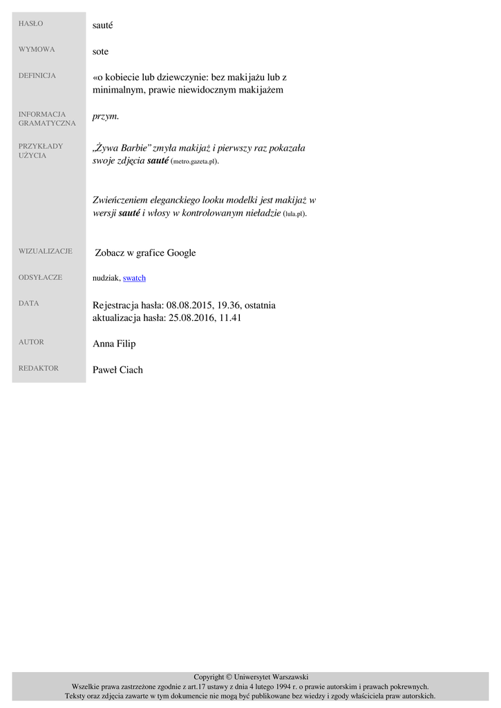 HASŁO sauté WYMOWA sote DEFINICJA «o kobiecie lub dziewczynie: bez makijażu lub z minimalnym, prawie niewidocznym makijażem» INFORMACJA GRAMATYCZNA przym. PRZYKŁADY UŻYCIA „Żywa Barbie” zmyła makijaż i pierwszy raz pokazała swoje zdjęcia sauté (metro.gazeta.pl). Zwieńczeniem eleganckiego looku modelki jest makijaż w wersji sauté i włosy w kontrolowanym nieładzie (lula.pl). WIZUALIZACJE Zobacz w grafice Google ODSYŁACZE nudziak, swatch DATA Rejestracja hasła: 08.08.2015, 19.36, ostatnia aktualizacja hasła: 25.08.2016, 11.41 AUTOR Anna Filip REDAKTOR Paweł Ciach Copyright © Uniwersytet Warszawski Wszelkie prawa zastrzeżone zgodnie z art.17 ustawy z dnia 4 lutego 1994 r. o prawie autorskim i prawach pokrewnych. Teksty oraz zdjęcia zawarte w tym dokumencie nie mogą być publikowane bez wiedzy i zgody właściciela praw autorskich. Powered by TCPDF (www.tcpdf.org)