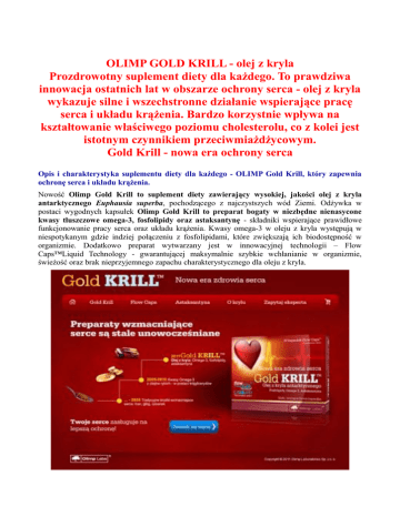OLIMP GOLD KRILL - olej z kryla Prozdrowotny suplement diety dla każdego. To prawdziwa innowacja ostatnich lat w obszarze ochrony serca - olej z kryla wykazuje silne i wszechstronne działanie wspierające pracę serca i układu krążenia. Bardzo korzystnie wpływa na kształtowanie właściwego poziomu cholesterolu, co z kolei jest istotnym czynnikiem przeciwmiażdżycowym. Gold Krill - nowa era ochrony serca Opis i charakterystyka suplementu diety dla każdego - OLIMP Gold Krill, który zapewnia ochronę serca i układu krążenia. Nowość Olimp Gold Krill to suplement diety zawierający wysokiej, jakości olej z kryla antarktycznego Euphausia superba, pochodzącego z najczystszych wód Ziemi. Odżywka w postaci wygodnych kapsułek Olimp Gold Krill to preparat bogaty w niezbędne nienasycone kwasy tłuszczowe omega-3, fosfolipidy oraz astaksantynę - składniki wspierające prawidłowe funkcjonowanie pracy serca oraz układu krążenia. Kwasy omega-3 w oleju z kryla występują w niespotykanym gdzie indziej połączeniu z fosfolipidami, które zwiększają ich biodostępność w organizmie. Dodatkowo preparat wytwarzany jest w innowacyjnej technologii – Flow Caps™Liquid Technology - gwarantującej maksymalnie szybkie wchłanianie w organizmie, świeżość oraz brak nieprzyjemnego zapachu charakterystycznego dla oleju z kryla. • • • • • Zalety oraz sposób działania taniego suplementu diety Gold Krill (olej z kryla antarktycznego) marki Olimp: Najwyższej jakości olej z kryla antarktycznego Euphausia superba. Dobra i skuteczna odżywka, która obniża poziom cholesterolu i trójglicerydów - wzmacnia serce i układ krążenia. zmniejsza dolegliwości związane z chorobami reumatycznymi - olej z kryla to rewelacyjny preparat na bolące stawy. Tani preparat, który łagodzi symptomy związane z okresem menopauzy, oraz PMS (zespołu napięcia przedmiesiączkowego). Wszechstronnie działający suplement - redukuje zmarszczki, poprawia wygląd skóry, włosów, paznokci. Mocne serce, zdrowy układ krążenia, profilaktyka przeciwmiażdżycowa i wiele więcej dzięki Olimp Gold Krill! Olej z kryla zawarty w odżywce Olimp Gold Krill to prawdziwa innowacja ostatnich lat w obszarze ochrony serca. Odkrycie jego niezwykłych właściwości było wynikiem wytężonej pracy zespołu naukowców z różnych dziedzin nauki i medycyny. Liczne badania naukowe potwierdzają, iż wykazuje on silne i wszechstronne działanie wspierające pracę serca i układu krążenia. Dostarcza składników, które pomagają w kształtowaniu prawidłowego poziomu cholesterolu HDL i LDL, trójglicerydów, wpływają pozytywnie na krzepliwość krwi oraz ciśnienie tętnicze a także neutralizują wolne rodniki, dzięki czemu wpływają na sprawne funkcjonowanie serca i układu krążenia przez długie lata. Potrójna ochrona - tylko z Olimp Gold Krill (olej z kryla w kapsułkach). Dla zapewnienia możliwie maksymalnej ochrony układu sercowo-naczyniowego Olimp Gold Krill łączy w sobie aż trzy innowacyjne substancje. Omega-3 w formie połączeń fosfolipidowych: Zdecydowana większość suplementów dostępnych na rynku zawiera kwasy Omega-3 w postaci trójglicerydów lub etyloestrów, wytwarzane z olei rybich. Gold Krill to zupełnie inna jakość. Kwasy Omega-3, zawarte w oleju z kryla, występują w formie połączeń fosfolipidowych. Jaka jest różnica? Dzięki fosfolipidowemu nośnikowi, zdecydowanie wzrasta wchłanialność i wykorzystanie kwasów Omega-3 w organizmie. Fosfolipidy: Fosfolipidy to niezbędne elementy strukturalne każdej żywej komórki. Wchodzą, bowiem w skład błon komórkowych, uczestnicząc w transporcie substancji do wnętrza jak i na zewnątrz komórki. W konsekwencji pełnią niezwykle istotną rolę w funkcjonowaniu serca, naczyń krwionośnych, układu nerwowego. Zaangażowane są także w kontrolowanie czynności serca oraz w regulacjię gospodarki lipidowej. Astaksantyna: Olej z kryla jest źródłem astaksantyny – jednego z najsilniejszych, znanych antyoksydantów. Usuwa ona wolne rodniki, które są przyczyną wielu niekorzystnych procesów w organizmie. Wolne rodniki utleniają m.in. zły cholesterol, który następnie może się przyczyniać do zwiększania ryzyka miażdżycy czy choroby niedokrwiennej serca. Innowacyjna kapsułka Flow Caps: Gold Krill zawarty jest w innowacyjnej kapsułce stworzonej w technologii Flow Caps™ Liquid Technology. Najbardziej zaawansowana technologia płynna gwarantuje maksymalnie szybkie wchłanianie i wysoką biodostępność składników aktywnych. Twarda otoczka żelatynowa z opatentowanym systemem zamknięcia, zapobiega utlenianiu się substancji aktywnych zapewniając zachowanie cennych właściwości oraz najwyższej jakości produktu oraz zabezpiecza przed nieprzyjemnym zapachem. Tego typu rozwiązanie to znaczący przełom w technologii ochrony substancji aktywnych zawartych w kapsułkach. W tradycyjnych kapsułkach miękkich, stosowanych obecnie na rynku, formują się kanały dyfuzyjne, przez które składniki mogą dyfundować na powierzchnię, gdzie są utleniane, generując charakterystyczny, nieprzyjemny zapach. Technologia Flow Caps niemal w 100% likwiduje to niekorzystne zjawisko. Kapsułki Flow Caps posiadają jeszcze jedną ważną zaletę – jest to ich mały i opływowy kształt. Dzięki temu są niezwykle łatwe do połknięcia. Dawkowanie oleju z kryla - Gold Krill Olimp Labs: 1 kapsułka dziennie lub inaczej po konsultacji z lekarzem. Nie należy przekraczać zalecanej dziennej porcji do spożycia w ciągu dnia. Suplement diety nie może być stosowany jako substytut zróżnicowanej diety. Zalecany jest zrównoważony sposób żywienia i zdrowy tryb życia. Opis i charakterystyka nienasyconych kwasów tłuszczowych omega-3 marki Olimp: • 1 porcja odżywki = 1 kapsułka • Zawartość opakowania: 30 miękkich, żelowych kapsułek "Flow Caps" Skład produktu Gold Krill: Zawartość: w jednej kapsułc