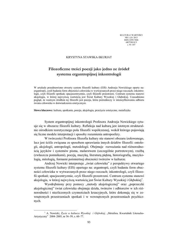 KULTURA I WARTOŚCI NR 1 (5)/ 2013 ISSN 2299-7806 ARTYKUŁY s. 93–107 KRYSTYNA STAWSKA-SKURJAT Filozoficzne treści poezji jako jedno ze źródeł systemu ergantropijnej inkontrologii W artykule przedstawiono otwarty system filozofii kultury (EIS) Andrzeja Nowickiego oparty na: ergantropii, czyli badaniu form obecności człowieka w wytwarzanych przez niego rzeczach; inkontrologii, czyli filozofii spotkań; spacjocentryzmie, czyli filozofii przestrzeni. Centrum systemu stanowi aksjologia, w której najwyższą wartością jest Świat Kultury Wysokiej i Głębokiej. Uzasadniono pogląd, że ważnym źródłem tej filozofii jest poezja, która pośredniczy w intensyfikowaniu odbioru świata człowieka w doświadczeniu estetycznym. Słowa kluczowe: kultura, spotkanie, poezja, aksjologia, przeżycie estetyczne, metafizyka System ergantropijnej inkontrologii Profesora Andrzeja Nowickiego sytuuje się w obszarze filozofii kultury. Refleksja nad kulturą jest istotnym strukturalnie ośrodkiem teoretycznego pola filozofii współczesnej, wokół którego pojawiają się liczne modele interpretacji i sposoby rozumienia antroposfery. W twórczości Profesora filozofia kultury nie stanowi obszaru izolowanego, lecz jest ściśle związana ze sposobem uprawiania innych działów filozofii: ontologii, aksjologii, antropologii, metodologii. Obejmuje rozważania nad różnorodnością języków i systemów pisma, malarstwem (szczególnie portretowym), rzeźbą (zwłaszcza pomnikami), poezją, muzyką, literaturą piękną, historiografią, muzykologią, mitologią, formami pośmiertnej obecności twórców w kulturze. Andrzej Nowicki interpretuje „świat człowieka” z perspektywy otwartego systemu filozofii kultury (EIS) opartego na: ergantropii, czyli badaniu form obecności człowieka w wytwarzanych przez niego rzeczach; inkontrologii, czyli filozofii spotkań; spacjocentryzmie, czyli filozofii przestrzeni. Centrum systemu stanowi aksjologia, w której najwyższą wartością jest Świat Kultury Wysokiej i Głębokiej1. Wyodrębniony przy pomocy „metody aksjologicznej” oraz „poprzeczki aksjologicznej” świat człowieka obejmuje dzieła, twórców i odbiorców w ich różnorodności i niezliczonych czynnościach kreacyjnych, które dokonują się w zewnętrznych przestrzeniach spotkań i w wewnętrznych przestrzeniach psychicznych. 1 A. Nowicki, Życie w kulturze Wysokiej i Głębokiej, „Metafora. Kwartalnik LiterackoArtystyczny” 2004–2005, nr 56–59, s. 60–77. 93 KRYSTYNA STAWSKA-SKURJAT – FILOZOFICZNE TREŚCI POEZJI... „Bramami” prowadzącymi w „Świętą Przestrzeń” Kultury są biblioteki, filharmonie, muzea, bliskie kontakty z oświeconymi ludźmi. W kręgu bezpośrednich rozważań filozofa znajdują się ontologiczne problemy twórczości, w tym procesy stawania się, wprowadzania w świat nowych, nie-bywałych, nie-istniejących wcześniej wytworów. W związku z tym pod warstwą kulturowych faktów Profesor poszukuje mechanizmów wyzwalających zmiany w kulturze. Wskazuje na „moc generatywną” dziel, „moc magnetyczną”, „moc muzykogenną poezji”, „moc poezjogenną muzyki”, „moc spacjogenną”, „moc retroaktywną” jako na zdolności kulturowych wytworów do „dokonywania realnych zmian aksjologicznych”2, które ukierunkowane są na wprowadzanie nowych wartości i wzorów3 i przekształcanie ich w realne cząstki osobowości twórców i odbiorców kultury. Jako podmiot wartości dzieło poetyckie, twórczo bogate, realizuje się w konkretyzacjach egzystencjalnych i metafizycznych: uczestniczy w skutecznych, bo przynoszących satysfakcję spotkaniach, zaś za pośrednictwem dramatycznosymbolicznej wypowiedzi wykracza poza bezpośrednie doświadczenia poznawcze i estetyczne. Wyraża wówczas więcej treści, niż wynikałoby to z samego znaczenia pojęciowego bezpośredniego przekazu. Poezja, wykraczając poza potoczne sądy często uwikłane w sprzeczności, ujmuje rzeczywistość za pośrednictwem metafor i symboli – w perspektywie tego, co ogólne, nie empiryczne, swoiste i zbyt wielorakie, aby można je było sprowadzić do wspólnego mianownika. W ten sposób próbuje zmierzyć się z wieloma wymiarami rzeczywistości, które jawią się w przekazie poetyckim jako odmienne jakościowo od danych w myśleniu potocznym i w poznaniu naukowym. Dzieło poetyckie jest narzędziem4 pojmowania i interpretowania świata na najrozmaitsze sposoby. Dlatego obok pytań o „co” dzieła, o jego ideę, tj. pytań ukierunkowanych na odsłanianie ogólnych, wieloczasowych własności jakościowych, dzięki którym jest ono znakiem, pojawiają się pytania o „życie” utworu poetyckiego w danym obszarze kulturowym. Przyjmuje się, że dzieła sztuki znajdują oparcie nie tylko w materialnym fundamencie, lecz także w twórcy i odbiorcy, tj. w psychicznych aktach podmiotu i są równocześnie bytami samodzielnymi, transcendentnymi wobec przeżyć odbiorcy. Dzieła poetyckie, jako struktury wielopoziomowe oparte na znakach słownych, mają charakter intersubiektywny. Ponieważ jednak ujęcie dzieła jako bytu językowego, czysto słownego jest niewystarczające dla zrozumienia jego najistot2 A. Nowicki, Spotkania w rzeczach, PWN, Warszawa 1991, s. 333. Warto przypomnieć piękną wypowiedź Henryka Elzenberga: „Prawdziwa, mocna indywidualność ludzka jest jak gwóźdź diamentowy, wbity prosto w kosmos na wieki wieków, bez podłożonych zabezpieczających tekturek. Takimi diamentami usiane jest dno wszechistnienia, jak przestwór nocny gwiazdami; nic ich nie łączy prócz tego, że są właśnie takie: mocne i wbite – i to jest ich wielkopańska wspólnota”. H. Elzenberg, Kłopot z istnieniem. Aforyzmy w porządku czasu, „Znak”, Kraków 1994, s. 300. 4 Problem istoty narzędzia wnikliwie rozpatruje M. Heidegger w Sein und Zeit, (Bycie i czas, tłum. B. Baran, Wyd. Nauk. PWN, Warszawa 1994, § 15, s. 94–102). 3 94 KRYSTYNA STAWSKA-SKU