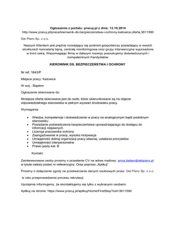 Ogłoszenie z portalu: pracuj.pl z dnia: 13.10.2014 http://www.pracuj.pl/praca/kierownik-ds-bezpieczenstwa-i-ochrony-katowice,oferta,3611590 Del Piero Sp. z o.o. Naszym Klientem jest prężnie rozwijający się podmiot gospodarczy posiadający w swoich strukturach kancelarię tajną, centralę monitoringowa oraz grupy interwencyjne wyposażone w broń ostrą. Wspomagając firmę w dalszym rozwoju poszukujemy doświadczonych i kompetentnych Kandydatów KIEROWNIK DS. BEZPIECZEŃSTWA I OCHRONY Nr ref. 1643/P Miejsce pracy: Katowice W woj.: Śląskim Ogłoszenie skierowane do: Niniejsza oferta skierowana jest do osób, które ukierunkowane są na objęcie odpowiedzialnego stanowiska w pełnym wyzwań środowisku pracy. Wymagania: Wiedza, kompetencje i doświadczenie w pracy na analogicznym bądź podobnym stanowisku Posiadanie poświadczenia bezpieczeństwa upoważniającego do dostępu do informacji niejawnych Licencja pracownika ochrony Zaangażowanie w pracę, wysoka motywacja Umiejętność dobrej organizacji pracy własnej, ustalania priorytetów Umiejętności interpersonalne Prawo jazdy kat. B Kontakt: Zainteresowane osoby prosimy o przesłanie CV na adres mailowy: [email protected] w tytule należy podać nr referencyjny. Oraz poprzez „Aplikuj” Prosimy o dołączenie zgody na przetwarzanie danych osobowych przez Del Piero Sp. z o.o. w celu przeprowadzenia procesu rekrutacji. Uprzejmie informujemy, że skontaktujemy się tylko z wybranymi osobami. Aplikuj na stronie: https://www.pracuj.pl/aplikuj/Home/FirstStep?oid=3611590