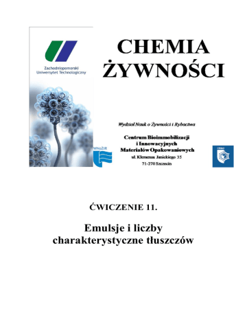 ĆWICZENIE 11. Emulsje i liczby charakterystyczne tłuszczów Emulsją jest układ koloidalny, w którym ośrodek rozpraszający i substancja rozproszona jest cieczą a wielkość kropelek cieczy rozproszonej dochodzi nawet do 10-3 cm. Są to układy termodynamiczne nietrwałe i odnoszą się do układów dwóch nierozpuszczających się wzajemnie się cieczy. Emulsje łatwo ulegają koalescensji, czyli łączeniu się kropelek cieczy rozproszonej w większe krople. W celu zapobieżeniu koalescencji dodaje się emulgatorów. Podstawowym warunkiem utworzenia emulsji w układzie dwóch cieczy jest całkowity brak lub bardzo mała ich wzajemna rozpuszczalność. Jeżeli napięcie międzyfazowe pomiędzy składnikami emulsji jest bardzo małe (ok. 0,1 erg * cm-2), to możliwy jest samorzutny proces emulgowania. Emulsję zdyspergowanego oleju (albo znanej substancji organicznej) w wodzie oznacza się krótko jako emulsję O/W. Odwrotnie emulsję zdyspergowanej wody w oleju oznacza się jako emulsję W/O. Typ utworzonej emulsji zależy od emulgatora. Działanie emulgatorów polega na zmniejszaniu międzyfazowego napięcia powierzchniowego pomiędzy kropelkami substancji rozproszonej a cieczy rozpraszającej. Emulsje, będące układami termodynamicznie niestabilnymi, wraz z czasem podlegają proces rozdzielania faz. Separacja faz jest końcowym efektem niestabilności emulsji, do której może zachodzić nawet latami, zależnie od mechanizmu destabilizacji. Wśród procesów destabilizacji emulsji wyróżniane są: śmietankowanie, flokulacja, sedymentacja, inwersja faz, koalescencja oraz oswaldowskie dojrzewanie emulsji. Emulgatory W emulsjach powierzchnia styku dwóch faz (niemieszajacych się składników) jest bardzo duża, więc układ może być trwały tylko w przypadku, gdy siły napięcia powierzchniowego między fazami będą bliskie zeru. W przypadku przeciwnym faza rozproszona w bardzo krótkim czasie łączy się w fazę ciągłą i emulsja rozdziela się na dwie fazy ciągłe (zjawisko zwane koalescencją). Tak w przyrodzie, jak i w emulsjach tworzonych przez człowieka w celu obniżenia napięcia powierzchniowego między fazami wykorzystuje się substancje trzecie, zwane emulgatorami, tenzydami, środkami powierzchniowo-czynnymi, które posiadają grupy zarówno hydrofilne, jak i lipofilne. Taka budowa powoduje, że umieszczają się one na granicy faz, jedną częścią "zanurzone" w fazie hydrofilowej a drugą w hydrofobowej (Rys. 1). Tworząc monomolekularną warstewkę przyjmują na siebie "bycie granicą faz", a ponieważ ich powinowactwo do obu faz jest podobne, powodują praktycznie zanik napięcia powierzchniowego lub przynajmniej znaczne jego obniżenie i tym sposobem stabilizują emulsję. Powinowactwo emulgatora do fazy olejowej i fazy wodnej określa parametr HLB (Hydrophilic - Liophilic Balance). Wartość HLB, zależna głównie od budowy cząsteczki, a dokładniej od stosunku części hydrofilowej do hydrofobowej, określa, czy dany środek powierzchniowo-czynny stabilizuje lepiej emulsje O/W czy W/O. Umownie przyjęto skalę HLB w zakresie 1 - 40. Wartość 1 odnosi się do kwasu olejowego, wartość 40 do laurylosiarczanu sodowego. Emulgatory o HLB <10 pozwalają wytwarzać emulsje typu W/O (są lepiej rozpuszczalne w fazie niepolarnej, np. stearyniany magnezu, wapnia). HLB powyżej 10 predysponuje emulgator do użycia w emulsji O/W (np. mydła sodowe i potasowe, trójetanoloamina i inne). Jedną z codziennie spotykanych emulsji jest mleko, w którym kropelki tłuszczu rozproszone są w roztworze wodnym soli sodu, wapnia i potasu. Rolę emulgatora, odgrywa białko kazeina. Liczba HLB charakteryzuje się addytywnością, tzn. dla mieszaniny emulgatorów można ją obliczyć na podstawie wartości HLB poszczególnych składników i ich względnego udziału w mieszaninie. a) b) Rys. 1. a) schemat budowy cząsteczki emulgatora, b) micela emulsji W/O (http://www.mlyniec.gda.pl/~chemia/ogolna/substancje/substancja.htm) Ponieważ mechanizm obniżania napięcia powierzchniowego polega na tworzeniu cienkiej, najczęściej monomolekularnej warstewki na granicy faz, emulgator dodany do emulsji tylko do pewnego stężenia wspomaga tworzenie i utrzymanie emulsji, dodany w nadmiernej ilości nie powoduje już obniżenia napięcia powierzchniowego i nie gromadzi się więcej na granicy faz tylko tworzy skupiska (micele) w fazie ciągłej. Stosowane są różne zasady podziału emulgatorów. Na przykład wg: - pochodzenia: naturalne (lecytyna) i syntetyczne (estry glicerolu), - ładunku w roztworze: kationowe, anionowe, niejonowe i amfolityczne (Tab. 1), - rozpuszczalności: w wodzie (hydrofilne), oleju (lipofilne) Efektywność działania emulgatorów wspomagają stabilizatory (emulsji), które są zazwyczaj hydrofilnymi makrocząsteczkami, najczęściej hydrokoloidami. Mają one niewielką aktywność emulgującą, lecz tworząc makromolekularne usieciowanie w fazie wodnej zapobiegają migracji fazy olejowej i jej zlewaniu oraz wydzielaniu. Mydła Tłuszcze pod wpływem przegrzanej pary wodnej ulegają hydrolizie, dając glicerol i wolne kwasy tłuszczowe. Rozkład ten można również osiągnąć za pomocą hydrolizy zasadowej (KOH lub NaOH), z tym że otrzymuje się wówczas odpowiednie sole kwasów tłuszczowych nazywane mydłami, a sam proces nosi miano zmydlenia tłuszczu. Sole sodowe i potasowe kwasów tłuszczowych dobrze rozpuszczają się w wodzie, tworząc micelarne roztwory koloidowe. Sole metali dwuwartościowych (Ba2+, Ca2+, Pb2+) są natomiast nierozpuszczalne (mydła nierozpuszczalne). Mydła tworzą koloidy hydrofilowe lub hydrofobowe w zależności od środowiska. W roztworze wodnym grupy polarne (-COONa) skierowane są na zewnątrz, a podstawniki hydrofobowe (węglowodorowe) do wnętrza micelarnych kuleczek mydła. W rozpuszczalnikach organicznych układ tych grup jest odwrotny (micela odwrócona). Grupy hydrofilowe i hydrofobowe mydła ustawiają się zatem
