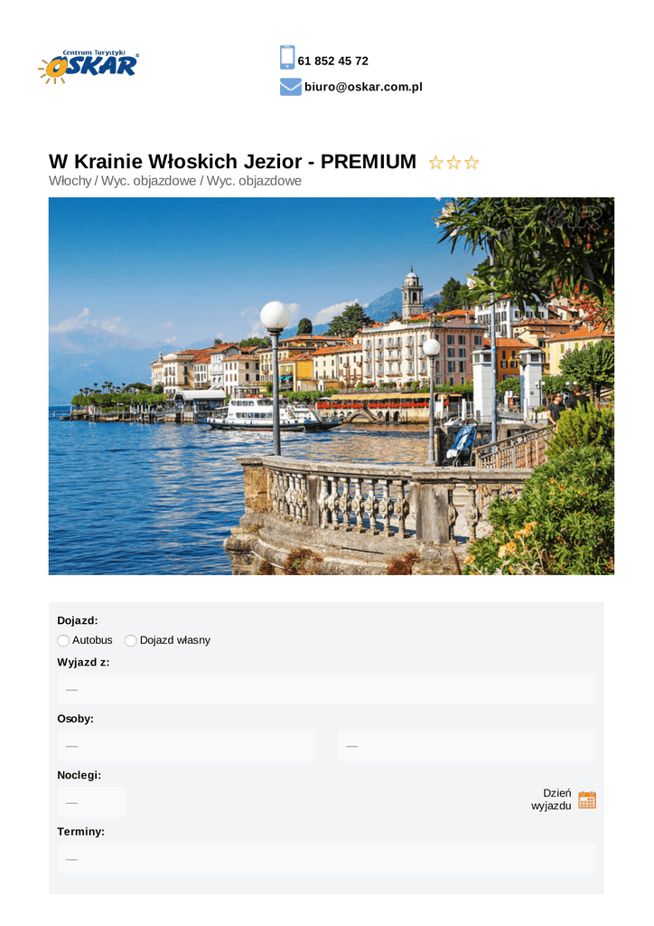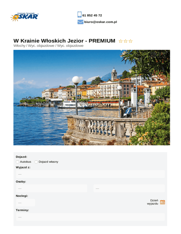 61 852 45 72 [email protected] W Krainie Włoskich Jezior - PREMIUM Włochy / Wyc. objazdowe / Wyc. objazdowe Dojazd: Autobus Dojazd własny Wyjazd z: Osoby: Noclegi: Dzień wyjazdu Terminy: Pokój: Wyżywienie: Najtańsza oferta Zaliczka do 5 marca 2017: 997,00 zł do 5 marca 2017: 997,00 zł Suma: 997,00 zł Opis oferty Miejscowość Przejazd autokarem PREMIUM autokar-premium-oskar-tablet-gniazdko-usb-wygodne-fotele Opinie Realizacja imprezy autokarami PREMIUM to gwarancja: transportu autokarami z roczników 2015 i 2016 produkcji Irizar i VDL Rozkład jazdy indywidualnego, multimedialnego systemu rozrywki - tablet z dotykowym ekranem w każdym zagłówku (filmy, gry, muzyka itp.). Możliwość podłączenia własnego nośnika danych poprzez wejście AUX lub USB. najwyższej klasy skórzanych lub półskórzanych foteli z możliwością regulacji oparcia lub/i zagłówka największej w Polsce przestrzeni między siedzeniami małej półki przed każdym siedzeniem + siateczki na czasopisma, książki czy telefon bezpłatnego dostępu do sieci WiFi na terenie Polski* gniazdek elektrycznych 230V wydajnej klimatyzacji sterowanej indywidualnie bogato wyposażonego barku udostępnionego w czasie jazdy WC na pokładzie autokaru Idealna i komfortowa podróż… ZAWSZE! Na ternie Polski GWARANTUJEMY, że wszystkie przejazdy realizowane są autobusem, busem lub samochodem osobowym. Zapewnimy komfortowy transport na każdym etapie podróży. Ważne: Autokar Premium jest autokarem docelowym. *jakość usług internetowych może różnić się w zależności od jakości sygnału TOUR GUIDE oprowadzanie z indywidualnym systemem nagłośnieniowym Mobilny zestaw audio: indywidulany zestaw słuchawkowy połączony bezprzewodowo z mikrofonem pilota/przewodnika. Zakwaterowanie Hotele *** położone na trasach pomiędzy zwiedzanymi miastami. Pokoje z łazienkami, urządzone w klasycznym stylu, z klimatyzacją lub/i dostęp do Internetu Wi-Fi. W hotelach znajdują się restauracje, dodatkowo niektóre z nich mogą posiadać basen. Dostępne opcje zakwaterowania: pokój 2 - osobowy pokój 3 - osobowy dokwaterowanie (bez dopłat*) lub pokój 1 - osobowy (dopłata) Dostępne opcje wyżywienia wyżywienie BB: 4 śniadania wyżywienie HB: 4 śniadania + 4 obiadokolacje; możliwość dokonania rezerwacji w wersji HB lub obowiązkowa dopłata do obiadokolacji 35 €/os. (płatne u pilota w autokarze) śniadania serwowane: pieczywo, ser, szynka, dżem, napoje: kawa, herbata, sok obiadokolacje serwowane: zupa/przystawka, danie główne, sałatka/deser/owoc; napoje do obiadokolacji dodatkowo płatne Pakiet KOMFORT gwarancja wyboru miejsca w autokarze napoje w autokarze w cenie (6 x do wyboru: kawa, herbata, zimny napój 0,2l) cena: 50 zł/os Pakiet PRESTIGE gwarancja wyboru miejsca w autokarze napoje w autokarze w cenie (6 x do wyboru: kawa, herbata, zimny napój 0,2l) pierwszeństwo wejścia na pokład autokaru nadbagaż 5 kg w cenie napoje do obiadokolacji (0,2l) cena: 100 zł/os Warunki promocji FIRST MINUTE www.oskar.com.pl/zalaczniki/warunki_promocji Karta Dużej Rodziny www.oskar.com.pl/zalaczniki/karta_duzej_rodziny Ubezpieczenie Warunki ubezpieczenia Bezpieczne Podróże Signal Iduna dokument do pobrania www.oskar.com.pl/zalaczniki/owu Warunki ubezpieczenia Kosztów Imprezy Turystycznej Signal Iduna dokument do pobrania www.oskar.com.pl/zalaczniki/owurg Turystyczny Fundusz Gwarancyjny W związku z powołaniem do życia w dniu 26.11.2016 Turystycznego Funduszu Gwarancyjnego każdy klient Biura Podróży Oskar zobowiązany jest do zapłaty kwoty w wysokości 10zł/os. przy każdorazowej rezerwacji imprezy turystycznej (obowiązuje od dnia 26.11.2016). Kwota przeznaczona na Turystyczny Fundusz Gwarancyjny zostanie automatycznie doliczona do wartości rezerwacji (w momencie jej dokonania). Wyjątkiem są imprezy turystyczne odbywające się w krajach posiadających granicę z Rzeczpospolitą Polską. Składka nie jest przychodem biura. Udogodnienia Klimatyzacja Regulowane fotele Tacki Multimedia Nowoczesna flota Zawodowy kierowca Pasy bezpieczeństwa Toaleta w autokarze Podnóżki Wi-Fi Bez paszportu Tour guide Program ramowy DZIEŃ 1 (niedziela) Wyjazd z Polski zgodnie z rozkładem jazdy autokarów. Przejazd przez Czechy, Austrię. (Trasa ok. 950 km) DZIEŃ 2 (poniedziałek) Przyjazd do Padwy – należącej do najważniejszych ośrodków naukowych we Włoszech. W historycznym centrum miasta można znaleźć jeden z najstarszych uniwersytetów europejskich czy Bazylikę świętego Antoniego – tutejszego patrona, w której znajdują się jego grobowiec oraz relikwie. Główny plac Padwy ma kształt elipsy, na której znajduje się 78 posągów – każdy, kto w latach 1755- 1838 zasłużył się dla miasta, miał postawiony pomnik. Dawniej było to miejsce jarmarków, dziś znajduje się tutaj wyspa Memmia. Po zwiedzaniu Padwy, przejazd do Sirmione – uroczego miasteczka położonego nad Jeziorem Garda. Spacer urokliwymi uliczkami, podziwianie bajkowego zamku rodziny Scaglieri. Czas wolny do dyspozycji grupy. Przejazd do hotelu zlokalizowanego w okolicy Jeziora Garda. Obiadokolacja. Nocleg. (Trasa ok. 120 km) DZIEŃ 3 (wtorek) Śniadanie. Dzień przeznaczony na kąpiele słoneczne nad jednym z jezior. Obiadokolacja. Nocleg. DZIEŃ 4 (środa) Śniadanie. Przejazd w okolice Jeziora Como. Krótkie zwiedzanie miasta o tej samej nazwie, podczas którego zobaczymy m.in. Katedrę – jej budowę rozpoczęto w 1396 roku. Spacer promenadą. Czas wolny. Z miejscowości Como popłyniemy do miasteczka Bellagio, niewielkiego, lecz urzekającego swoim klimatem. Pełno tutaj kawiarenek i sklepików, nadających miejscowości niepowtarzalnego charakteru. Czas wolny. Następnie udamy się statkiem do Cadenabbia, gdzie odbierze nas autokar i wyruszymy w drogę do hotelu. Obiadokolacja. Nocleg. (Trasa ok. 170 km + przejazd do hotelu) DZIEŃ 5 (czwartek) Śniadanie. Przejazd w okolice miejscowości Stresa, gdzie udamy się na 2 w