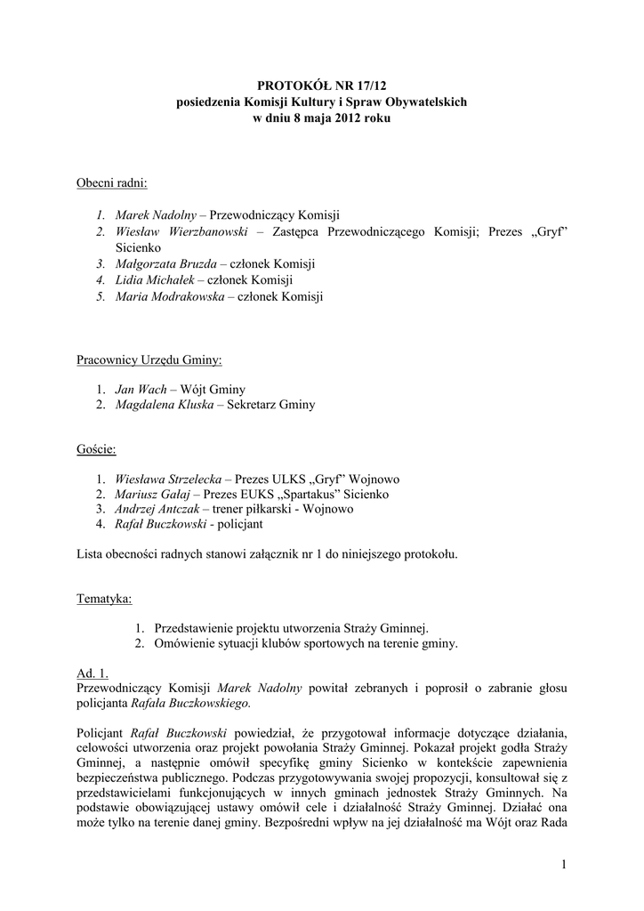 PROTOKÓŁ NR 17/12 posiedzenia Komisji Kultury i Spraw Obywatelskich w dniu 8 maja 2012 roku Obecni radni: 1. Marek Nadolny – Przewodniczący Komisji 2. Wiesław Wierzbanowski – Zastępca Przewodniczącego Komisji; Prezes „Gryf” Sicienko 3. Małgorzata Bruzda – członek Komisji 4. Lidia Michałek – członek Komisji 5. Maria Modrakowska – członek Komisji Pracownicy Urzędu Gminy: 1. Jan Wach – Wójt Gminy 2. Magdalena Kluska – Sekretarz Gminy Goście: 1. 2. 3. 4. Wiesława Strzelecka – Prezes ULKS „Gryf” Wojnowo Mariusz Gałaj – Prezes EUKS „Spartakus” Sicienko Andrzej Antczak – trener piłkarski - Wojnowo Rafał Buczkowski - policjant Lista obecności radnych stanowi załącznik nr 1 do niniejszego protokołu. Tematyka: 1. Przedstawienie projektu utworzenia Straży Gminnej. 2. Omówienie sytuacji klubów sportowych na terenie gminy. Ad. 1. Przewodniczący Komisji Marek Nadolny powitał zebranych i poprosił o zabranie głosu policjanta Rafała Buczkowskiego. Policjant Rafał Buczkowski powiedział, że przygotował informacje dotyczące działania, celowości utworzenia oraz projekt powołania Straży Gminnej. Pokazał projekt godła Straży Gminnej, a następnie omówił specyfikę gminy Sicienko w kontekście zapewnienia bezpieczeństwa publicznego. Podczas przygotowywania swojej propozycji, konsultował się z przedstawicielami funkcjonujących w innych gminach jednostek Straży Gminnych. Na podstawie obowiązującej ustawy omówił cele i działalność Straży Gminnej. Działać ona może tylko na terenie danej gminy. Bezpośredni wpływ na jej działalność ma Wójt oraz Rada 1 Gminy. Podał przykłady specyficznych działań, którymi nie zajmuje się policja, tylko Straż Gminna. Jest to np. kontrola obowiązkowych szczepień psów, kontrola i nadzór nad realizacją programów tworzonych przez Radę Gminy. Mogą to być sprawy związane z zaśmiecaniem i innymi wykroczeniami. Straż Gminna prowadzi również działania profilaktyczne – rozmowy z mieszkańcami, pogadanki z dziećmi. Bierze udział w przeciwdziałaniu narkomanii i alkoholizmowi poprzez kontrolowanie sprzedaży alkoholu, rozmowy i pogadanki z rodzicami na temat narkotyków i substancji psychotropowych, organizowanie szkoleń, kursów dla mieszkańców. Straż zajmuje się również sprawami zaśmiecania jezior, dzikimi wysypiskami śmieci w lasach. Następnie podał przybliżone koszty powstania Straży Gminnej: szkolenie 2500 zł, umundurowanie 1800 zł, wyposażenie osobiste 400 zł, dodatki (komputer) 800 zł, pojazd z oznakowaniem (może być własne auto strażnika), oznakowanie auta 600 zł, kilometrówka, pomieszczenie. W Polsce jest 605 jednostek Straży Gminnej, w których służy ponad 1000 strażników. Poinformował radnych o możliwościach ustawienia fotoradaru. Koszt najnowszego fotoradaru to 60 tys. zł. Wpływy z mandatów przeznacza się na drogi. Istnieje także możliwość wypożyczenia takiego sprzętu, wówczas koszt wynosi 1500 zł za 7 godzin. Tak robi gmina Mrocza. Radny Wiesław Wierzbanowski zapytał, ile miałoby pracować osób w naszej Straży Gminnej. Pan Rafał Buczkowski odpowiedział, że wystarczą 2 osoby. Radny Wiesław Wierzbanowski zapytał, ile dni i godzin pracowaliby strażnicy. Pan Rafał Buczkowski odpowiedział, że praca trwałaby 7 dni, bez limitu godzin. Radna Maria Modrakowska zapytała o wynagrodzenie strażników i koszt prowadzenia biura. Pan Rafał Buczkowski odpowiedział, że nie jest w stanie podać dokładnych danych. Dodał, że sam poprowadziłby biuro. Wójt Gminy poinformował, że nabór na stanowiska strażników odbywa się na zasadzie konkursu. Zauważył, że stworzenie takiej struktury jest kosztowne i złożone. Potrzebne są pojazdy, mundury itd. Dane otrzymane z Bydgoszczy mówią o kwocie około 55 tys. zł na 1 etat strażnika plus wyposażenie. Straż musiałaby mieć pojazd bez limitu kilometrów. W naszej gminie potrzebne byłyby 3 etaty; to koszt około 0,5 mln zł w pierwszym roku, potem około 200 tys. zł miesięcznie. Pan Rafał Buczkowski powiedział, że w gminie Osielsko zakupiono auto za 25 tys. zł. Zwykły strażnik na początek zarabia 1500 zł netto. Prowadzący zarabia trochę więcej. Przewodniczący Marek Nadolny stwierdził, że chciał uciec na początku od rozmowy o finansach, ale tego się nie da. Trzeba odpowiedzieć na pytanie, czy gminie jest potrzebna straż; czy samo dbanie o porządek jest wystarczającym powodem. Wydaje się też, że bez posiadania fotoradaru ciężko będzie znaleźć pieniądze na finansowanie tej struktury. Pan Rafał Buczkowski powiedział, że na początku działania mogą sprowadzać się do dyżurów telefonicznych i reagowania w razie konieczności. 2 Wójt Gminy stwierdził, że Straż Gminna w ogóle byłaby potrzebna. Realizuje ona wiele zadań, z którymi nie może dać sobie rady Urząd Gminy. Utrzymywanie czystości, problem wysypywania śmieci, kontrolowania. Gminie brakuje kadry i instrumentów. Jest ustawa o gospodarce odpadami komunalnymi, która wymusza na gminach dbanie o czystość, rozliczanie, księgowanie, egzekwowanie gospodarki śmieciami. Inną sprawą jest natomiast koszt utworzenia i utrzymanie Straży Gminnej. Przewodniczący Marek Nadolny stwierdził, że obecnie odbywa się dyskusja robocza, w trakcie której rozważana jest potrzeba utworzenia tej struktury. Dalsze rozmowy odbyć się muszą w szerszym gronie. Pan Rafał Buczkowski powiedział, że chciałby coś zrobić dla gminy i nie chodzi mu o wysokość wynagrodzenia. Radna Maria Modrakowska powiedziała, że w tej chwili radni Komisji nie mogą decydować, temat będzie rozważany. Wójt Gminy dodał, że mówi się o likwidacji posterunków policji, co byłoby z dużą szkodą dla bezpieczeństwa w gminach. Przewodniczący Marek Nadolny podziękował przedstawienie tematu Straży Gminnej. panu Rafałowi Buczkowskiemu za Ad. 2. Przewodniczący Marek Nadolny powitał prze