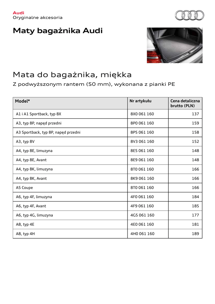 Audi Oryginalne akcesoria Maty bagażnika Audi Mata do bagażnika, miękka Z podwyższonym rantem (50 mm), wykonana z pianki PE Model* Nr artykułu A1 i A1 Sportback, typ 8X 8X0 061 160 137 A3, typ 8P, napęd przedni 8P0 061 160 159 A3 Sportback, typ 8P, napęd przedni 8P5 061 160 158 A3, typ 8V 8V3 061 160 152 A4, typ 8E, limuzyna 8E5 061 160 148 A4, typ 8E, Avant 8E9 061 160 148 A4, typ 8K, limuzyna 8T0 061 160 166 A4, typ 8K, Avant 8K9 061 160 166 A5 Coupe 8T0 061 160 166 A6, typ 4F, limuzyna 4F0 061 160 184 A6, typ 4F, Avant 4F9 061 160 185 A6, typ 4G, limuzyna 4G5 061 160 177 A8, typ 4E 4E0 061 160 181 A8, typ 4H 4H0 061 160 189 Cena detaliczna brutto (PLN) 1 Audi Oryginalne akcesoria Mata do bagażnika, sztywna Z podwyższonym rantem (50 mm), wykonana z tworzywa sztucznego Model* Nr artykułu A3 Sportback, typ 8V 8V4 061 180 248 A6, typ 4G, Avant 4G9 061 180 292 A7 Sportback 4G8 061 180 297 Q3 8U0 061 180 252 Q5 8R0 061 180 266 Q7 4L0 061 180 324 Cena detaliczna brutto (PLN) Wanna do bagażnika, sztywna Z wysokim rantem (200 mm), wykonana z tworzywa sztucznego Model* Nr artykułu A3 Sportback, typ 8V 8V4 061 170 665 A4 Avant, typ 8K 8K9 061 170 684 A6 Avant, typ 4G 4G9 061 170 832 Q3 8U0 061 170 665 Q5 8R0 061 170 739 Q7, do wersji 5-osobowej 4L0 061 170 887 Cena detaliczna brutto (PLN) Szczegółowe informacje o doborze mat do bagażnika dostępne u Partnerów Serwisowych Audi . * Typ samochodu można odczytać z numeru nadwozia, znajdującego się w dowodzie rejestracyjnym. Określa go 7. i 8. znak, np. dla numeru WAUZZZ8E50A123456 typ samochodu to 8E. Oferta ważna do 31.01.2014 r lub do wyczerpania zapasów. 2