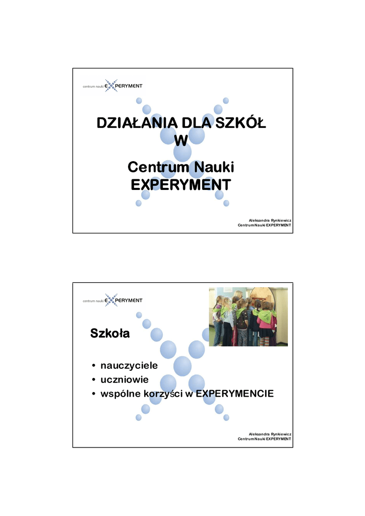 DZIAŁANIA DZIA ANIA DLA SZKÓ SZKÓŁ W Centrum Nauki EXPERYMENT Aleksandra Rynkiewicz Centrum Nauki EXPERYMENT Szkoła Szko a • nauczyciele • uczniowie • wspólne korzyści w EXPERYMENCIE Aleksandra Rynkiewicz Centrum Nauki EXPERYMENT Konferencje i seminaria • przedstawienie Centrum Nauki – idea, cele, zasady funkcjonowania • przedstawienie idei aktywnej edukacji – nauki przez odkrywanie • nowe metody interaktywnej edukacji Aleksandra Rynkiewicz Centrum Nauki EXPERYMENT Konferencje i seminaria • praktyka w EXPERYMENCIE na własnej „skórze” • luźne, „przypadkowe” rozmowy • zachęcenie do współpracy Aleksandra Rynkiewicz Centrum Nauki EXPERYMENT Warsztaty • szkoleniowiec – nauczyciel • przeŜycie lekcji w CN EXPERYMENT • cel – efektywne wykorzystanie „narzędzia” – CN EXPERYMENT, wspólne stworzenie materiałów edukacyjnych Aleksandra Rynkiewicz Centrum Nauki EXPERYMENT eduPEOPLE • współpraca z eXperimentLabbet z Kalmaru (Szwecja) • 2 seminaria, 6 warsztatów • mobilne zestawy doświadczeń naukowych Aleksandra R ynkiewicz Centrum Nauki EXPERYMENT Nowa oferta edukacyjna • I Ty zostaniesz Robinsonem • Z przyrodą za pan brat • Niewyja śniona zagadka • Złap oddech Aleksandra Rynkiewicz Centrum Nauki EXPERYMENT Dziękuj Dzi kuję kuj za uwagę! uwag ! Centrum Nauki EXPERYMENT Pomorski Park Naukowo – Technologiczny Al. Zwycięstwa 96/98 Tel. +48 58 735 11 37 www.experyment.gdynia.pl [email protected] Aleksandra Rynkiewicz Centrum Nauki EXPERYMENT