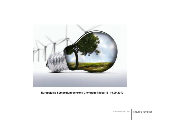 Europejskie Sympozjum ochrony Ciemnego Nieba 13 -15.09.2012 LIGHT IMPRESSIONS ES-SYSTEM Organizacja ES-SYSTEM Podstawową ideą działania firmy: Energy Saving Nazwa Grupy ES-SYSTEM: • ES – idea oszczędności energii (ang. Energy Saving) • SYSTEM – formuła budowy i projektowania produktów Rynek budownictwa ogólnego, architektonicznego, mieszkalnego, przemysłowego i zewnętrznego ISO 9001/2000 Certyfikat zarządzania jakością Od 9 marca 2007 spółka notowana na Giełdzie Papierów Wartościowych LIGHT IMPRESSIONS ES-SYSTEM Organizacja ES-SYSTEM ODDZIAŁY HANDLOWE GDAŃSK ŁÓDŹ MAZURY POZNAŃ RZESZÓW ŚLĄSK WARSZAWA WROCŁAW KRAKÓW ES-SYSTEM S.A. SPÓŁKI ZAGRANICZNE ES-SYSTEM SCANDINAVIA AB - Szwecja ZAKŁADY PRODUKCYJNE ES-SYSTEM NT Sp. z o.o. ES-SYSTEM WILKASY Sp. z o.o. ES-SYSTEM RZESZÓW Sp. z o.o. LIGHT IMPRESSIONS ES-SYSTEM • ROZWIĄZYWANIE problemów oświetleniowych • PRZYGOTOWYWANIE analiz i projektów • DOSTAWA sprzętu wysokiej jakości, nowoczesny design i parametry techniczne • ELASTYCZNOŚĆ w odpowiedzi na potrzeby klientów, sprawny i profesjonalny serwis OWOCE NASZEJ PRACY LIGHT IMPRESSIONS ES-SYSTEM Najnowsza zakończona realizacja krajowa – Bonarka City Center • • • • • Inwestor: Roland Investments Sp. z o.o., Położenie: Kraków (tereny poprzemysłowe w dzielnicy Kraków Podgórze) Powierzchnia handlowa: 91 000 m². Wartość inwestycji: 1,4 mld zł Wartość kontraktu ES-SYSTEM: 3 mln zł. LIGHT IMPRESSIONS ES-SYSTEM LIGHT IMPRESSIONS ES-SYSTEM LIGHT IMPRESSIONS ES-SYSTEM LIGHT IMPRESSIONS ES-SYSTEM LIGHT IMPRESSIONS ES-SYSTEM LIGHT IMPRESSIONS ES-SYSTEM GALERIA OZAS - LITWA GALERIA KRAKOWSKA SERDIKA CENTER - BUŁGARIA GALERIA MALTA - POZNAŃ LIGHT IMPRESSIONS ES-SYSTEM LIGHT IMPRESSIONS ES-SYSTEM Przykładowa inwestycja w realizacji – węzeł drogowy Göteborg, Szwecja (2008 - 2011) • • • • • Inwestor: Vägverket Region Väst Położenie: Göteborg, Sweden Powierzchnia całkowita: 9 000 m² Wartość inwestycji: 185,6 mln Eur Wartość kontraktu ES-SYSTEM: 948,5 tyś Eur (1530 opraw) LIGHT IMPRESSIONS 13 ES-SYSTEM Nowoczesne oświetlenie na terenie Żywieckiego Parku Krajobrazowego. Projekt Ciemne Niebo LIGHT IMPRESSIONS ES-SYSTEM eferencje i realizacje LIGHT IMPRESSIONS ES-SYSTEM Zadania oświetlenia drogowego ? 1. Efekty społeczne: bezpieczeństwa mieszkańców bezpieczeństwa na drogach Kreowanie wizerunku miasta Wydłużenie aktywności społecznej 2. Efekty techniczno – ekonomiczne Odpowiednia jakość widzenia przy wysokiej wydajności energetycznej Niskie koszta eksploatacji Spełnione normy oświetleniowe LIGHT IMPRESSIONS ES-SYSTEM Oprawa typu BOYEN założenia SYSTEM OŚWIETLENIA DROGOWEGO PRZYSTOSOWANY DO SPRAWNEJ MODERNIZACJI SYSTEMU OŚWIETLENIA NA ISTNIEJĄCEJ JUŻ INFRASTRUKTUŻE GMINY, MIASTA - SZEROKIE MOŻLIWOŚCI OPTYMALIZACJI EFEKTU ŚWIETLNEGO - PROSTOTA I ŁATWOŚĆ MONTAŻU - SPRAWNA OBSŁUGA KONSERWATORSKA - WYKORZYSTANIE ZAAWANSOWANYCH TECHNIK KONSTRUKTORSKICH LIGHT IMPRESSIONS ES-SYSTEM LIGHT IMPRESSIONS ES-SYSTEM prawa uliczna typu BOYEN BOYEN – źródła światła E27/E40 -) lampa sodowa wysokoprężna 50, 70, 100, 150, 250W -) lampa metalohalogenkowa 70, 100, 150W G12 -) lampa metalohalogenkowa 35, 70W GX24q-4 -) świetlówka kompaktowa zintegrowana 42W LIGHT IMPRESSIONS ES-SYSTEM prawa uliczna typu BOYEN LIGHT IMPRESSIONS ES-SYSTEM prawa uliczna typu BOYEN LIGHT IMPRESSIONS ES-SYSTEM prawa uliczna typu BOYEN LIGHT IMPRESSIONS ES-SYSTEM prawa uliczna typu BYEN -) swobodna wymiana powietrza w obu kierunkach -) membrana Gore całkowicie wodoszczelna -) odporność membrany na starzenie – 15 lat LIGHT IMPRESSIONS ES-SYSTEM prawa uliczna typu BOYEN LIGHT IMPRESSIONS ES-SYSTEM LIGHT IMPRESSIONS ES-SYSTEM prawa uliczna typu BOYEN LED LIGHT IMPRESSIONS ES-SYSTEM prawa uliczna typu BOYEN LED System BOYEN LED P 59W Un 230V IP 66 Klasa ochronności II LIGHT IMPRESSIONS ES-SYSTEM Wykres przedstawiający napięcie zaburzeń w przewodzie N Linia czerwona oraz żółta są to limity. Aby wynik był pozytywny wykres w kolorze czerwonym nie może przekroczyć linii czerwonej natomiast wykres niebieski nie może przekroczyć linii żółte LIGHT IMPRESSIONS ES-SYSTEM Wykres przedstawiający napięcie zaburzeń w przewodzie L LIGHT IMPRESSIONS ES-SYSTEM LIGHT IMPRESSIONS ES-SYSTEM MOCNE STRONY SYSTEMU BOYEN Tylko 0,2% opraw trafiło do reklamacji • sztywność i trwałość konstrukcji • stałość parametrów fotometrycznych • doskonała optyka i dostosowanie do infrastruktury • Łatwa konserwacja • różnorodność wyboru • funkcjonalność i obniżenie kosztów LIGHT IMPRESSIONS ES-SYSTEM LIGHT IMPRESSIONS ES-SYSTEM owości LIGHT IMPRESSIONS ES-SYSTEM owości P TYP 3 – 110W TYP 6 – 55W Un 230V IP 66 Klasa ochronności II LIGHT IMPRESSIONS ES-SYSTEM Przykładowa inwestycja w realizacji – węzeł drogowy Göteborg, Szwecja (2008 - 2011) • • • • • Inwestor: Vägverket Region Väst Położenie: Göteborg, Sweden Powierzchnia całkowita: 9 000 m² Wartość inwestycji: 185,6 mln Eur Wartość kontraktu ES-SYSTEM: 948,5 tyś Eur (1530 opraw) LIGHT IMPRESSIONS 36 ES-SYSTEM owości LIGHT IMPRESSIONS ES-SYSTEM owości LIGHT IMPRESSIONS ES-SYSTEM owości P 27W Un 230V IP 67/65 Klasa ochronności I LIGHT IMPRESSIONS ES-SYSTEM LIGHT IMPRESSIONS ES-SYSTEM LIGHT IMPRESSIONS ES-SYSTEM Jakub Suchecki Menadżer ds. Oświetlenia Ulicznego ES-SYSTEM S.A. Tel. 663 814 093 [email protected] LIGHT IMPRESSIONS ES-SYSTEM