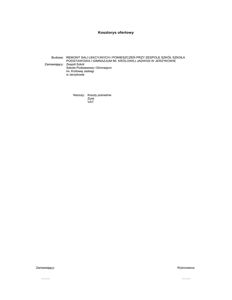 Kosztorys ofertowy Kosztorys Data: 2013-05-05 Budowa: REMONT SALI LEKCYJNYCH I POMIESZCZEŃ PRZY ZESPOLE SZKÓŁ SZKOŁA PODSTAWOWA I GIMNAZJUM IM. KRÓLOWEJ JADWIGI W JERZYKOWIE Zamawiający: Zespół Szkół Szkoła Podstawowa i Gimnazjum im. Królowej Jadwigi w Jerzykowie Jednostka opracowująca kosztorys: egreen - Piotr Bzowy ul. Górczyńska 44/9 60-123 Poznań Narzuty: Koszty pośrednie Zysk VAT 68,00%R+ 68,00%S 10.00%(R+Kp(R))+10.00%(S+Kp(S)) 23,00% Kosztorys opracowali: inż. Piotr Bzowy, ................................................................................................................................................................................................................ Sprawdzający: ............................................................................................................................................................................................................................... Zamawiający: Wykonawca: .......... .......... Zuzia (C) DataComp 1994-2009(lic. 14367) strona nr: 2 Kosztorys ofertowy Element, asortyment, rodzaj robót, pozycja przedmiarowa podstawy nakładów Jedn. Krot. Ilość 1 Sala nr 8 1 KNRW 401/1216/1 Zabezpieczenie podłóg folią 2 KNR 1323/1001/11 Zabezpieczenie okien folia 3 KNR 401/354/12 Wykucie z muru, podokienników betonowych z lastryko 4 KNR 401/321/4 Obsadzenie w ścianach z cegieł, podokienników z konglomeratu marmurowego ponad 1,5 (długość 2,15m) - kolor do uzgodnienia z Zamawiającym 5 KNR 403/606/5 Demontaż i ponowny montaż opraw świetlówkowych oprawa 2x40·W 6 KNR 401/1208/2 Ługowanie farby olejnej z tynków ścian - wysokość 1.75m (lamperia) 7 KNR 711/101/1 (7) Gruntowanie, Unigrunt (sufit + ściany) 8 KNR 202/815/4 Gładź gipsowa na ścianach, 2-warstwowa 9 KNR 202/815/6 Gładź gipsowa na sufitach, 2-warstwowa 10 KNR 202/1505/3 Malowanie farbami lateksowymi wewnętrznych podłoży gipsowych z gruntowaniem, 2-krotne (kolor do uzgodniania z Imwestorem) - ściany 11 KNR 202/1505/3 Malowanie farbami lateksowymi wewnętrznych podłoży gipsowych z gruntowaniem, 2-krotne (kolor biały) - sufit 12 KNRW 202/1521/3 Malowanie technologią natrysku kroplowego (tapety natryskowe) farbą templową - kolor, natrysk kroplowy z podkładem - lamperia 13 KNRW 202/1521/6 Malowanie technologią natrysku kroplowego (tapety natryskowe) farbą templową - lakierowanie natrysku - lamperia m2 52,539 m2 13,230 m 6,450 szt 3,000 szt 6,000 m2 51,205 m2 149,097 m2 96,558 m2 52,539 m2 45,353 m2 52,539 m2 51,205 m2 51,205 m2 57,960 m2 13,230 m 6,450 szt 3,000 szt 9,000 m2 55,800 m2 160,260 m2 102,300 m2 57,960 m2 46,500 m2 57,960 2 Sala nr 6 14 KNRW 401/1216/1 Zabezpieczenie podłóg folią 15 KNR 1323/1001/11 Zabezpieczenie okien folia 16 KNR 401/354/12 Wykucie z muru, podokienników betonowych z lastryko 17 KNR 401/321/4 Obsadzenie w ścianach z cegieł, podokienników z konglomeratu marmurowego ponad 1,5 (długość 2,15m) - kolor do uzgodnienia z Zamawiającym 18 KNR 403/606/5 Demontaż i ponowny montaż opraw świetlówkowych oprawa 2x40·W 19 KNR 401/1208/2 Ługowanie farby olejnej z tynków ścian - wysokość 1.8m (lamperia) 20 KNR 711/101/1 (7) Gruntowanie, Unigrunt (sufit + ściany) 21 KNR 202/815/4 Gładź gipsowa na ścianach, 2-warstwowa 22 KNR 202/815/6 Gładź gipsowa na sufitach, 2-warstwowa 23 KNR 202/1505/3 Malowanie farbami lateksowymi wewnętrznych podłoży gipsowych z gruntowaniem, 2-krotne (kolor do uzgodniania z Imwestorem) - ściany 24 KNR 202/1505/3 Malowanie farbami lateksowymi wewnętrznych podłoży gipsowych z gruntowaniem, 2-krotne (kolor biały) - sufit www.kosztorysy-poznan.pl Wartość jednostkowa Wartość netto Zuzia (C) DataComp 1994-2009(lic. 14367) strona nr: 3 Element, asortyment, rodzaj robót, pozycja przedmiarowa podstawy nakładów 25 KNRW 202/1521/3 Malowanie technologią natrysku kroplowego (tapety natryskowe) farbą templową - kolor, natrysk kroplowy z podkładem - lamperia 26 KNRW 202/1521/6 Malowanie technologią natrysku kroplowego (tapety natryskowe) farbą templową - lakierowanie natrysku - lamperia Jedn. Krot. Ilość m2 55,800 m2 55,800 m2 10,395 m2 4,410 szt 1,000 m2 42,570 m2 10,395 m2 58,590 m 6,450 szt 3,000 szt 9,000 m2 58,590 m2 58,590 m2 58,590 m2 30,000 m2 95,505 m2 83,355 m2 12,150 m2 83,355 m2 12,150 m2 60,000 m2 128,592 m2 161,112 m2 117,240 3 Zaplecze sali nr 6 27 KNRW 401/1216/1 Zabezpieczenie podłóg folią 28 KNR 1323/1001/11 Zabezpieczenie okien folia 29 KNR 403/606/5 Demontaż i ponowny montaż opraw świetlówkowych oprawa 2x40·W 30 KNR 202/1505/3 Malowanie farbami lateksowymi wewnętrznych podłoży gipsowych z gruntowaniem, 2-krotne (kolor do uzgodniania z Imwestorem) - ściany 31 KNR 202/1505/3 Malowanie farbami lateksowymi wewnętrznych podłoży gipsowych z gruntowaniem, 2-krotne (kolor biały) - sufit 4 Sala nr 5 32 KNRW 401/1216/1 Zabezpieczenie podłóg folią 33 KNR 401/354/12 Wykucie z muru, podokienników betonowych z lastryko 34 KNR 401/321/4 Obsadzenie w ścianach z cegieł, podokienników z konglomeratu marmurowego ponad 1,5 (długość 2,15m) - kolor do uzgodnienia z Zamawiającym 35 KNR 403/606/5 Demontaż i ponowny montaż opraw świetlówkowych oprawa 2x40·W 36 KNR 711/101/1 (7) Gruntowanie, Unigrunt (sufit) 37 KNR 202/815/6 Gładź gipsowa na sufitach, 2-warstwowa 38 KNR 202/1505/3 Malowanie farbami lateksowymi wewnętrznych podłoży gipsowych z gruntowaniem, 2-krotne (kolor biały) - sufit 5 Klatka schodowa 39 KNRW 401/1216/1 Zabezpieczenie podłóg folią 40 KNR 711/101/1 (7) Gruntowanie, Unigrunt (sufit+ściany) 41 KNR 202/815/4 Gładź gipsowa na ścianach, 2-warstwowa 42 KNR 202/815/6 Gładź gipsowa na sufitach, 2-warstwowa 43 KNR 202/1505/3 Malowanie farbami lateksowymi wewnętrznych podłoży gipsowych z gruntowaniem, 2-krotne (kolor do uzgodniania z Imwestorem) - ściany 44 KNR 202/1505/3 Malowanie farbami lateksowymi wewnętrznych podłoży gipsowych z gruntowaniem, 2-krotne (kolor biały) - sufit 6 Klatk
