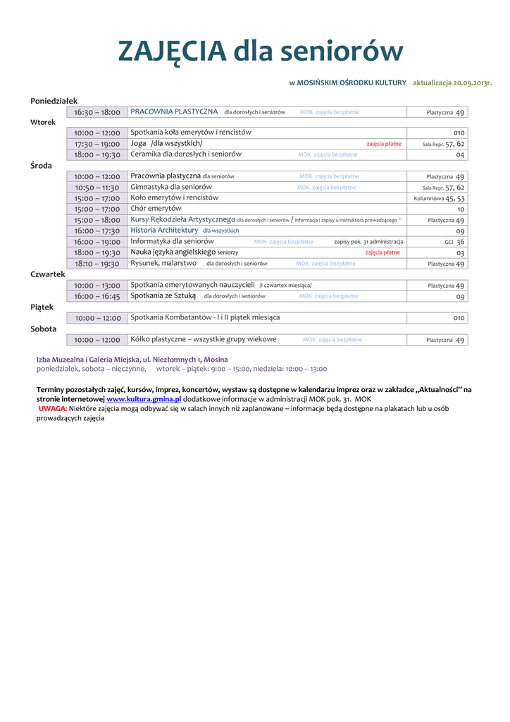 ZAJĘCIA dla seniorów w MOSIŃSKIM OŚRODKU KULTURY aktualizacja 20.09.2013r. Poniedziałek 16:30 – 18:00 PRACOWNIA PLASTYCZNA dla dorosłych i seniorów MOK zajęcia bezpłatne 49 Plastyczna Wtorek 10:00 – 12:00 17:30 – 19:00 18:00 – 19:30 Spotkania koła emerytów i rencistów Joga /dla wszystkich/ Ceramika dla dorosłych i seniorów 10:00 – 12:00 10:50 – 11:30 15:00 – 17:00 15:00 – 17:00 15:00 – 18:00 16:00 – 17:30 16:00 – 19:00 18:00 – 19:30 18:10 – 19:30 Pracownia plastyczna dla seniorów MOK zajęcia bezpłatne Gimnastyka dla seniorów MOK zajęcia bezpłatne Koło emerytów i rencistów Chór emerytów Kursy Rękodzieła Artystycznego dla dorosłych i seniorów / informacja i zapisy u instruktora prowadzącego * Historia Architektury dla wszystkich Informatyka dla seniorów MOK zajęcia bezpłatne zapisy pok. 31 administracja Nauka języka angielskiego seniorzy zajęcia płatne Rysunek, malarstwo dla dorosłych i seniorów MOK zajęcia bezpłatne 10:00 – 13:00 16:00 – 16:45 Spotkania emerytowanych nauczycieli /I czwartek miesiąca/ Spotkania ze Sztuką dla dorosłych i seniorów MOK 10:00 – 12:00 Spotkania Kombatantów - I i II piątek miesiąca 10:00 – 12:00 Kółko plastyczne – wszystkie grupy wiekowe zajęcia płatne 010 62 04 Sala Repr. 57, MOK zajęcia bezpłatne Środa 49 62 Kolumnowa 45, 53 10 Plastyczna 49 09 GCI 36 03 Plastyczna 49 Plastyczna Sala Repr. 57, Czwartek Plastyczna 49 09 zajęcia bezpłatne Piątek 010 Sobota MOK zajęcia bezpłatne Plastyczna 49 Izba Muzealna i Galeria Miejska, ul. Niezłomnych 1, Mosina poniedziałek, sobota – nieczynne, wtorek – piątek: 9:00 – 15:00, niedziela: 10:00 – 13:00 Terminy pozostałych zajęć, kursów, imprez, koncertów, wystaw są dostępne w kalendarzu imprez oraz w zakładce „Aktualności” na stronie internetowej www.kultura.gmina.pl dodatkowe informacje w administracji MOK pok. 31. MOK UWAGA: Niektóre zajęcia mogą odbywać się w salach innych niż zaplanowane – informacje będą dostępne na plakatach lub u osób prowadzących zajęcia
