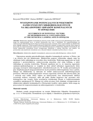 Proceedings of ECOpole Vol. 4, No. 2 2010 Krzysztof FRĄCZEK1, Dariusz ROPEK2 i Agnieszka ORTMAN2 WYSTĘPOWANIE POTENCJALNYCH WEKTORÓW ZANIECZYSZCZEŃ MIKROBIOLOGICZNYCH NA SKŁADOWISKU ODPADÓW KOMUNALNYCH W OŚWIĘCIMIU OCCURRENCE OF POTENTIAL VECTORS OF MICROBIOLOGICAL CONTAMINATION AT THE MUNICIPAL LANDFILL SITE IN OŚWIĘCIM Abstrakt: Składowiska odpadów komunalnych stanowią ważne źródło zanieczyszczeń mikrobiologicznych, które mogą się rozprzestrzeniać m.in. w postaci bioaerozolu oraz wraz z odciekami. Do rozprzestrzeniania się zanieczyszczeń mikrobiologicznych mogą się również przyczynić zwierzęta, które są przywabiane na składowiska przez odpadki organiczne. Celem przeprowadzonych badań było zbadanie występowania zwierząt, które mogą się przyczynić do rozprzestrzeniania zanieczyszczeń mikrobiologicznych na składowisku odpadów komunalnych. Na terenie składowiska stwierdzono liczne występowanie muchówek z rodziny Muscidae oraz ptaków. Na powierzchni ciała muchówek stwierdzono m.in. obecność bakterii wskaźnikowej Enterobacter cloacae. Słowa kluczowe: składowiska odpadów komunalnych, zanieczyszczenia mikrobiologiczne, wektory chorób Najczęstszą metodą unieszkodliwiania odpadów komunalnych zarówno w Polsce, jak i na świecie jest ich składowanie. Składowiska poprzez różnorodne odpady stają się obiektami, które oddziałują na wszystkie sfery środowiska. Wpływają negatywnie na wody gruntowe i powierzchniowe, zanieczyszczają atmosferę oraz szatę roślinną, a także oddziałują na estetykę środowiska. Ważnym aspektem jest to, że stanowią zagrożenie sanitarno-epidemiologiczne ze względu na duży udział substancji organicznych, które sprzyjają rozwojowi mikroorganizmów chorobotwórczych [1]. W wyniku prowadzonych prac eksploatacyjnych mogą przedostawać się do powietrza mikroorganizmy wraz z pyłem, dlatego też składowiska są zaliczane do źródeł zanieczyszczeń mikrobiologicznych powietrza. Obecność mikroorganizmów stwarza zagrożenie zarówno dla zdrowia ludzi, jak i zwierząt oraz roślin. Duży wpływ na intensywność oraz ekstensywność infekcji wywierają wektory zwierzęce, takie jak ptaki, drobne kręgowce (np. gryzonie) oraz bezkręgowce (np. owady), które uczestniczą wielokrotnie biernie w rozprzestrzenianiu czynników patogennych [2]. Dlatego też celem tej pracy było zbadanie występowania na składowisku odpadów komunalnych w Oświęcimiu owadów, także ptaków, które mogą się przyczyniać do rozprzestrzeniania się mikroorganizmów w środowisku. Materiał i metody Badania zostały przeprowadzone na terenie Składowiska Odpadów Komunalnych sp. z o.o. w Oświęcimiu. Gromadzone są tu odpady o charakterze gospodarczo-bytowym, 1 Katedra Mikrobiologii, Uniwersytet Rolniczy, al. A. Mickiewicza 24/28, 30-058 Kraków, email: [email protected] 2 Katedra Ochrony Środowiska Rolniczego, Uniwersytet Rolniczy, al. A. Mickiewicza 21, 31-120 Kraków, tel. 12 662 44 02, email: [email protected] 358 Krzysztof Frączek, Dariusz Ropek i Agnieszka Ortman które pochodzą z obszarów zabudowy mieszkaniowej i obiektów infrastruktury jej towarzyszących, a także odpady wielkogabarytowe. Na terenie składowiska zostało wyznaczonych 5 stanowisk, na których w okresie od wiosny do jesieni 2009 r. poprowadzono badania: I - teren zrekultywowany, II - teren przeznaczony do rozbudowy, III - teren eksploatowany, IV - na granicy składowiska, V - obok drogi wjazdowej. Do odłowu owadów latających wykorzystano żółte tablice lepowe, które wywieszano raz w miesiącu na każdym stanowisku. Za pomocą siatki entomologicznej odłowiono owady z terenu eksploatowanego (sektor czynny składowiska). Następnie przewieziono je do laboratorium i wykonano roztwory z soli fizjologicznej. W każdej probówce z 10 cm3 jałowej soli fizjologicznej umieszczono po 1 sztuce muchy domowej (Musca domestica) z rodziny muchowate (Muscidae) lub muchówkę z rodziny zadrowate (Phoridae). Każdą próbówkę wytrząsano w wytrząsarce po ok. 20 min. Następnie wykonano posiewy na podłożach stałych: Mannitol Salt Agar (MSA, bioMérieux) - dla grzybów, Endo - dla bakterii grupy coli ogólnej, Tryptic Soy Agar (TSA, Difco) - dla bakterii mezofilnych i psychrofilnych. Szczepy bakterii i grzybów wyizolowane z powierzchni ciała owadów oznaczono i przypisano do rodzajów i gatunków. Identyfikację wyizolowanych szczepów bakterii przeprowadzono na podstawie analizy morfologiczno-makroskopowej kolonii wyrosłych na podłożu agarowym oraz mikroskopową komórek barwionych metodą Grama. Następnie badane szczepy bakterii różnicowano na podstawie ich własności metabolicznych za pomocą testów biochemicznych, korzystając z klucza diagnostycznego Bergey’s Manual of Determinative Bacteriology [3]. Identyfikacja grzybów dokonywana była na podstawie analizy makroi mikroskopowych cech kolonii prowadzonej, korzystając z dostępnych kluczy taksonomicznych. Przeprowadzony został także monitoring ornitofauny. Monitoring ten przeprowadzono 3 razy o różnych porach dnia, tj. rano, w południe i popołudniu w lipcu, sierpniu i we wrześniu 2009 r. Wyniki Na Składowisku Odpadów Komunalnych w Oświęcimiu zaobserwowano występowanie następujących gatunków ptaków: rybitwa rzeczna (Sterna hirundo), kruk (Corvus corax), gawron (Corvus frugilegus), mewa pospolita (Larus canus) oraz sroka zwyczajna (Pica pica) (tab. 1). Podczas obserwacji zdecydowanie najczęściej występowała rybitwa rzeczna (Sterna hirundo). Najrzadziej teren składowiska odwiedzały takie gatunki, jak kruk (Corvus corax) oraz sroka zwyczajna (Pica pica). W tabeli 2 przedstawiono liczebność owadów odłowionych na tablicach lepowych na 5 stanowiskach, które wyznaczono na składowisku. Najwięcej stawonogów występowało na stanowisku znajdującym się na terenie eksploatowanym oraz stanowisku po stronie południowej składowiska, które znajdowało si