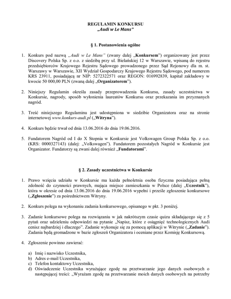 REGULAMIN KONKURSU „Audi w Le Mans” § 1. Postanowienia ogólne 1. Konkurs pod nazwą „Audi w Le Mans” (zwany dalej „Konkursem”) organizowany jest przez Discovery Polska Sp. z o.o. z siedzibą przy ul. Bielańskiej 12 w Warszawie, wpisaną do rejestru przedsiębiorców Krajowego Rejestru Sądowego prowadzonego przez Sąd Rejonowy dla m. st. Warszawy w Warszawie, XII Wydział Gospodarczy Krajowego Rejestru Sądowego, pod numerem KRS 23911, posiadającą nr NIP: 5272322571 oraz REGON: 016992839, kapitał zakładowy w kwocie 50 000,00 PLN (zwaną dalej „Organizatorem”). 2. Niniejszy Regulamin określa zasady przeprowadzenia Konkursu, zasady uczestnictwa w Konkursie, nagrody, sposób wyłonienia laureatów Konkursu oraz przekazania im przyznanych nagród. 3. Treść niniejszego Regulaminu jest udostępniona w siedzibie Organizatora oraz na stronie internetowej www.konkurs-audi.pl („Witryna”). 4. Konkurs będzie trwał od dnia 13.06.2016 do dnia 19.06.2016. 5. Fundatorem Nagród od I do X Stopnia w Konkursie jest Volkswagen Group Polska Sp. z o.o. (KRS: 0000327143) (dalej: „Volkswagen”). Fundatorem pozostałych Nagród w Konkursie jest Organizator. Fundatorzy są zwani dalej również „Fundatorami”. § 2. Zasady uczestnictwa w Konkursie 1. Prawo wzięcia udziału w Konkursie ma każda pełnoletnia osoba fizyczna posiadająca pełną zdolność do czynności prawnych, mająca miejsce zamieszkania w Polsce (dalej „Uczestnik”), która w okresie od dnia 13.06.2016 do dnia 19.06.2016 wypełni i prześle zgłoszenie konkursowe („Zgłoszenie”) za pośrednictwem Witryny. 2. Konkurs polega na wykonaniu zadania konkursowego, opisanego w pkt. 3 poniżej. 3. Zadanie konkursowe polega na rozwiązaniu w jak nakrótszym czasie quizu składającego się z 5 pytań oraz udzieleniu odpowiedzi na pytanie „Napisz, które z osiągnięć technologicznych Audi cenisz najbardziej i dlaczego”. Zadanie wykonuje się za pomocą aplikacji w Witrynie („Zadanie”). Zadania będą gromadzone w bazie zgłoszeń Organizatora i oceniane przez Komisję Konkursową. 4. Zgłoszenie powinno zawierać: a) b) c) d) Imię i nazwisko Uczestnika, Adres e-mail Uczestnika, Telefon kontaktowy Uczestnika, Oświadczenie Uczestnika wyrażające zgodę na przetwarzanie jego danych osobowych o następującej treści: „Wyrażam zgodę na przetwarzanie moich danych osobowych na potrzeby niniejszego Konkursu przez Discovery Polska Sp. z o.o. z siedzibą przy ul. Bielańskiej 12 w Warszawie. Wyrażam jednocześnie zgodę na opublikowanie mojego imienia i nazwiska – w Witrynie w przypadku zostania jednym z laureatów Konkursu.” 5. Akceptując Regulamin Konkursu Uczestnik udziela Organizatorowi nieodpłatnej, niewyłącznej, nieograniczonej w czasie i terytorialnie licencji, z prawem do udzielania sublicencji, na nadawanie, reemitowanie i publiczne udostępnienie Zadania w telewizji i w Internecie w taki sposób, aby każdy mógł mieć do niego dostęp w miejscu i w czasie przez siebie wybranym oraz na wykorzystywanie Zadania dla celów reklamy i promocji Organizatora, jego produktów i usług z możliwością wprowadzania zmian w tekście przy jednoczesnym zachowaniu oryginalnego znaczenia Zadania. 6. Ten sam Uczestnik może przesłać wiele Zgłoszeń. 7. W Konkursie nie mogą brać udziału osoby zatrudnione przez Organizatora ani osoby, które brały udział w organizowaniu Konkursu, w szczególności osoby zatrudnione przez Fundatora, a także członkowie ich najbliższych rodzin, za których uznaje się wstępnych, zstępnych, rodzeństwo, małżonków oraz osoby pozostające w stosunku przysposobienia bądź faktycznego wspólnego pożycia. 8. Prawidłowość Zgłoszeń ocenia 3-osobowa komisja konkursowa, składająca się z przedstawicieli Organizatora i Fundatora („Komisja Konkursowa”). Komisja Konkursowa odrzuca Zgłoszenie: a) pochodzące od osoby nie spełniającej warunków określonych w ust. 1 powyżej, b) pochodzące od osoby, o której mowa w ust. 7 powyżej, c) niepełne, nieczytelne, niekompletne, zawierające dane nieprawdziwe lub błędne, d) zawierające treści nieprzyzwoite, obraźliwe lub z innych względów niepożądane przez Organizatora, niezgodne z prawem lub nie odpowiadające wymogom dobrego smaku, e) w ramach którego odmówiono zaakceptowania lub nie zaakceptowano Regulaminu. 9. Uczestnik może dobrowolnie zrezygnować z udziału w Konkursie w każdym czasie, składając Organizatorowi oświadczenie o rezygnacji przesyłając pisemną rezygnację na adres Organizatora. Za datę rezygnacji uważa się dzień otrzymania przez Uczestnika pocztą elektroniczną wiadomości z potwierdzeniem przyjęcia rezygnacji. Wskutek rezygnacji Uczestnika z udziału w Konkursie, najpóźniej w dniu rezygnacji Uczestnika jego Zgłoszenie zostaje usunięte z bazy i wykluczone z Konkursu. Uczestnik, który zrezygnował z udziału w Konkursie, może ponownie do niego przystąpić, dokonując Zgłoszenia, na warunkach opisanych w niniejszym Regulaminie. 10. Uczestnik może zażądać usunięcia swoich danych osobowych z bazy danych Organizatora, stworzonej na potrzeby przeprowadzenia Konkursu. Żądanie to jest równoznaczne z rezygnacją z udziału w Konkursie. 11. Przedstawiając Zadanie do Konkursu, Uczestnik oświadcza jednocześnie, iż przysługują mu do niego wszelkie prawa, w szczególności prawa autorskie, a także że nie narusza ono jakichkolwiek dóbr osobistych osób trzecich. 12. Uczestnik zwolni Organizatora z odpowiedzialności oraz naprawi wszelkie szkody poniesione przez Organizatora, związane z jakimikolwiek naruszeniami prawa, w tym naruszeniami praw autorskich osób trzecich, zaistniałymi w związku z przedstawieniem przez Uczestnika Zadania i umieszczeniem go w Witrynie. § 3. Przyznanie nagród w Konkursie 1. Organizator przewiduje przyznanie w Konkursie nagród: a) I Stopnia: prawo do zawarcia umowy z Volkswagen uprawniającej zwycięzcę Konkursu do wyjaz