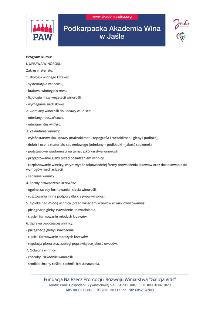 Program kursu: I. UPRAWA WINOROŚLI Zakres materiału: 1. Biologia winnego krzewu: - systematyka winorośli, - budowa winnego krzewu, - fizjologia i fazy wegetacji winorośli, - wymagania siedliskowe. 2. Odmiany winorośli do uprawy w Polsce: - odmiany mieszańcowe, - odmiany Vitis vinifera. 3. Zakładanie winnicy: - wybór stanowiska uprawy (makroklimat – topografia i mezoklimat – gleby i podłoże), - dobór i ocena materiału sadzeniowego (odmiany – podkładki – jakość sadzonek), - podstawowe wiadomości na temat szkółkarstwa winorośli, - przygotowanie gleby przed posadzeniem winnicy, - rozplanowanie winnicy, w tym wybór odpowiedniej formy prowadzenia krzewów oraz dostosowanie do wymogów mechanizacji, - sadzenie winnicy. 4. Formy prowadzenia krzewów: - ogólne zasady formowania i cięcia winorośli, - rusztowania i inne podpory dla krzewów winorośli. 5. Opieka nad młodą winnicą (przed wejściem krzewów w wiek owocowania): - pielęgnacja gleby, nawożenie i nawadnianie, - cięcie i formowanie młodych krzewów. 6. Uprawa owocującej winnicy: - pielęgnacja gleby i nawożenie, - cięcie i formowanie starszych krzewów, - regulacja plonu oraz zabiegi poprawiające jakość owoców. 7. Ochrona winnicy: - choroby i szkodniki winorośli, - środki ochrony roślin i techniki ich stosowania, - biologiczne metody ochrony, - uszkodzenia mrozowe winorośli, - ochrona przed mrozem i przymrozkami, - zabiegi uprawowe zwiększające odporność krzewów. 8. Mechanizacja pracy w winnicy: - sprzęt do uprawy i ochrony winnicy, - warunki pracy na zboczach i niebezpieczeństwo erozji. 9. Zbiór winogron: - różne parametry dojrzałości winogron i wyznaczenie pory zbiorów, - organizacja pracy przy winobraniu, - transport winogron. Zajęcia praktyczne: Większość godzin przewidzianych na zagadnienia związane z uprawą winorośli będą stanowiły zajęcia praktyczne w winnicy. Uczestnicy kursu zapoznają się z całym rocznym cyklem prac w winnicy, począwszy od zimowego przycinania krzewów, poprzez wszystkie sezonowe zabiegi z wiązane z uprawą winnicy oraz pielęgnacją i ochroną winorośli, a także winobranie, skończywszy na zabezpieczeniu krzewów przed kolejną nadchodzącą zimą. Uczestnicy będą także mieli możliwość uczestniczyć w pracach związanych z zakładaniem winnicy, jak wyznaczanie rzędów, sadzenie winorośli i pielęgnacja młodych nasadzeń w pierwszych miesiącach po posadzeniu. Kolejnymi zajęciami praktycznymi będzie degustacja porównawcza win z popularnych w Polsce odmian mieszańcowych z winami z klasycznych odmian Vitis vinifera. II. WYRÓB WINA Zakres materiału: 10. Wino, jego jakość i charakter: - definicja wina wg przepisów UE oraz innych norm międzynarodowych, - różne definicje jakości wina i kryteria jego oceny, - podstawowe rodzaje i style wina możliwe do uzyskania w polskich warunkach, - czynniki wpływające na styl i charakter wina (odmiany winorośli, lokalizacja winnicy, technologia produkcji, lokalne tradycje, etc.) 11. Kompozycja chemiczna oraz analiza moszczu i wina: - podstawowe substancje występujące w moszczu winogron i winie, - chemia analityczna w praktyce winiarskiej i wyposażenie podręcznego laboratorium, - określanie podstawowych parametrów fizykochemicznych oraz zawartości poszczególnych substancji w moszczu i winie (pH, ciężar właściwy moszczu, suchy ekstrakt, kwasy organiczne, alkohole, dwutlenek siarki, lotna kwasowość). 12. Mikrobiologia wina: - podstawowe procesy biochemiczne zachodzące w winogronach, moszczu i winie oraz warunki do rozwoju różnych mikroorganizmów, - pożądane mikroorganizmy: drożdże i bakterie mlekowe, - bakterie octowe i inne niepożądane mikroorganizmy oraz wywoływane przez nie zmiany, - konserwujące działanie dwutlenku siarki i jego zastosowanie przy produkcji wina, - ochrona przed niepożądaną oksydacją. 13. Pomieszczenia, sprzęt i materiały do wyrobu wina. - wymagana powierzchnia i rozkład pomieszczeń służących do wyrobu wina, w zależności od skali produkcji, - wyposażenie winiarni oraz podstawowy sprzęt do wyrobu wina (sprzęt do przerobu winogron, zbiorniki, pompy, filtry, etc.), - materiały używane do wyrobu wina (preparaty drożdży i bakterii, pożywki, enzymy, środki klarujące i konserwujące, odczynniki do analiz, etc.), - przygotowanie pomieszczeń i sprzętu przed rozpoczęciem winobrania. 14. Higiena przy wyrobie wina. 15. Winogrona jako surowiec winiarski: - decydujący wpływ winogron na jakość i charakter wina („dobre wino rodzi się w winnicy”), - budowa i skład winnego grona, - pożądane parametry winogron, w zależności od planowanego rodzaju i stylu wina, - wady surowca oraz ich wpływ na przebieg procesu produkcji i jakość wina. 16. Przerób winogron oraz wstępna obróbka miazgi lub moszczu przed fermentacją: - odszypułkowanie i zgniatanie winogron, - wstępna („zimna”) maceracja w miazdze przed fermentacją, - tłoczenie, rodzaje pras winiarskich, - korekta składu moszczu (podniesienie zawartości cukru, odkwaszanie), - klarowanie i stabilizacja moszczu, 17. Fermentacja alkoholowa: - różne rodzaje drożdży biorących udział w procesie fermentacji (drożdże dzikie i selekcjonowane), - warunki pracy drożdży podczas fermentacji (tlen, substancje odżywcze, temperatura, stężenie cukrów, SO2 i kwasów tłuszczowych), - przebieg fermentacji alkoholowej i kontrola tego procesu, - fermentacja w miazdze winogron (maceracja), - produkty uboczne fermentacji alkoholowej, - zaburzenia fermentacji: przyczyny i przeciwdziałanie. 18. Fermentacja jabłkowo-mlekowa: - spontaniczna fermentacja jabłkowo-mlekowa i czyste kultury bakterii mlekowych - czynniki wpływające na przebieg fermentacji jabłkowo-mlekowej, - produkty uboczne fermentacji jabłkowo-mlekowej. 19. Pielęgnacja młodego wina po fermentacji: - ściąganie wina znad osadu, - leżakowanie nad miałkim osadem drożdży (sur lie), - stabilizac