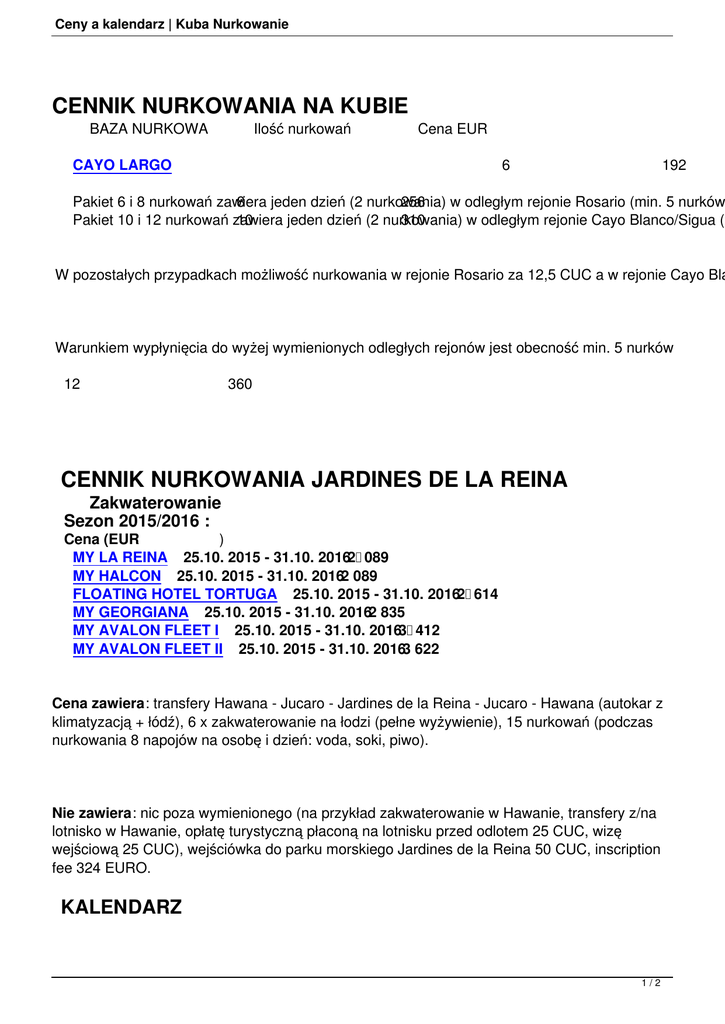 Ceny a kalendarz | Kuba Nurkowanie CENNIK NURKOWANIA NA KUBIE BAZA NURKOWA Ilość nurkowań CAYO LARGO Cena EUR 6 192 Pakiet 6 i 8 nurkowań zawiera 8 jeden dzień (2 nurkowania) 256 w odległym rejonie Rosario (min. 5 nurków Pakiet 10 i 12 nurkowań zawiera 10 jeden dzień (2 nurkowania) 310 w odległym rejonie Cayo Blanco/Sigua ( W pozostałych przypadkach możliwość nurkowania w rejonie Rosario za 12,5 CUC a w rejonie Cayo Bla Warunkiem wypłynięcia do wyżej wymienionych odległych rejonów jest obecność min. 5 nurków 12 360 CENNIK NURKOWANIA JARDINES DE LA REINA Zakwaterowanie Sezon 2015/2016 : Cena (EUR ) MY LA REINA 25.10. 2015 - 31.10. 20162 089 MY HALCON 25.10. 2015 - 31.10. 20162 089 FLOATING HOTEL TORTUGA 25.10. 2015 - 31.10. 20162 614 MY GEORGIANA 25.10. 2015 - 31.10. 20162 835 MY AVALON FLEET I 25.10. 2015 - 31.10. 20163 412 MY AVALON FLEET II 25.10. 2015 - 31.10. 20163 622 Cena zawiera: transfery Hawana - Jucaro - Jardines de la Reina - Jucaro - Hawana (autokar z klimatyzacją + łódź), 6 x zakwaterowanie na łodzi (pełne wyżywienie), 15 nurkowań (podczas nurkowania 8 napojów na osobę i dzień: voda, soki, piwo). Nie zawiera: nic poza wymienionego (na przykład zakwaterowanie w Hawanie, transfery z/na lotnisko w Hawanie, opłatę turystyczną płaconą na lotnisku przed odlotem 25 CUC, wizę wejściową 25 CUC), wejściówka do parku morskiego Jardines de la Reina 50 CUC, inscription fee 324 EURO. KALENDARZ 1/2 Ceny a kalendarz | Kuba Nurkowanie Data 29.7. - 7.8. 2015 Reina Havana Organizator Program Grupa nurków czeskich.Mariana Więcej informacji RÁJ 1492 uzyskasz - Jardines od nurka de la & 2. - 13.9. 2015 Havana Grupa nurków polskich. Maria Więcej informacji RÁJ 1492uzyskasz - Jardines odde nurka la Reina & 26.11. - 6.12. 2015 Reina avana Grupa nurków polskich. Czarka Więcej informacji RÁJ 1492 uzyskasz - Jardines od nurka de la & H Jeśli żaden z powyższych terminów Ci nie odpowiada, to przygotujemy ofertę zgodnie z Twoimi wymaganiami 2/2