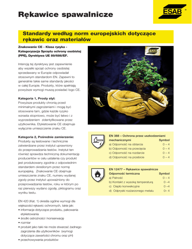 Rękawice spawalnicze Standardy według norm europejskich dotyczące rękawic oraz materiałów Znakowanie CE - Klasa ryzyka Kategoryzacja Sprzętu ochrony osobistej (PPE), Dyrektywa UE 89/686/EF. Intencją tej dyrektywy jest zapewnienie aby wszelki sprzęt ochrony osobistej sprzedawany w Europie odpowiadał TUPTPXOZNTUBOEBSEPN&/;BQFXOJUP generalnie takie same standardy jakości w całej Europie. Produkty, które spełniają powyższe wymogi muszą posiadać logo CE. Kategoria 1, Prosty styl: Powyższe produkty chronią przed minimalnymi zagrożeniami i mogą być stosowane tam, gdzie każde ryzyko wzrasta stopniowo, może być łatwo i z wyprzedzeniem zidentyfikowane przez użytkownika. Etykietowanie CE obejmuje wyłącznie umieszczenie znaku CE. Kategoria 2, Pośrednie zamierzenie: Produkty są testowane i technicznie zatwierdzane przez instytut uprawniony do przeprowadzania testów. Instytut ten również sprawdza techniczną dokumentację producentów w celu ustalenia czy produkt jest produkowany zgodnie z odpowiednim standardem określonym przez normę FVSPQFKTLį;OBLPXBOJF$&PCFKNVKF umieszczenie znaku CE, numeru wydanej zgody przez instytut upoważniony do przeprowadzania testów, roku w którym po raz pierwszy wydano zgodę, piktogramu oraz wyniku testu. &/,BU PLSFŔMBPHØMOFXZNPHJEMB większości rękawic ochronnych, takie jak: tJOGPSNBDKFEPUZD[įDFQSPEVLUVQBLPXBOJB etykietowania tŔSPELJPTUSPŤOPŔDJJLPOTFSXBDKĺ tSP[NJBS tQSPEVLUKBLPUBLJOJFNPŤFTUXBS[BİŤBEOFHP zagrożenia dla użytkowników (wymogi dotyczące zawartości chromu oraz pH) tQS[FDIPXZXBOJBQSPEVLUØX EN 388 – Ochrona przez uszkodzeniami mechanicznymi Symbol a) Odporność na obtarcia 0–4 b) Odporność na przecięcia 0–4 c) Odporność na rozdarcie 0–4 d) Odporność na przebicie 0–4 EN 12477 – Rękawice spawalnicze Odporność termiczna a) Palność Symbol 0–4 b) Kontakt z wysoką temperaturą 0 –4 c) Ciepło konwekcyjne 0 –4 d) Odpryski rozżarzonego metalu 0– 4 Rękawice spawalnicze Kryteria testu Standard Wymagane minimalne osiągi A B Osiągane maksymalne osiągi 0EQPSOPŔİOBŔDJFSBOJF &/ Odporność na przecięcie EN 388 1 1 5 0EQPSOPŔİOBSP[EBSDJF &/ 0EQPSOPŔİOBQS[FCJDJF &/ 1BMOPŔİ &/ Kontakt z wysokimi temperaturami EN 407 1 1 4 $JFQPLPOXFLDZKOF &/ OJFEPUZD[Z 0EQPSOPŔİOBPEQSZTLJSP[ŤBS[POFHPNFUBMV &/ 4QSBXOPŔİEPOJ &/ Jakość skóry ;OBMF[JFOJFPEQPXJFEOJFKKBLPŔDJTLØSZ[BTQPLBKBKįDFKEPLBEOJFXZNPHJQSPGFTKPOBMOFHPTQBXBD[BXZNBHB doświadczenia. ESAB ma dużą wiedzę i doświadczenie w garbowaniu i wykańczaniu skór – ważnych procesach, które określają końcową jakość skóry. To właśnie te procesy nadają skórze jakości pod względem wytrzymałości, miękkości i giętkości. Wierzchnia część skóry nosi nazwę ‘lico’, wewnętrzna część skóry nosi nazwę ‘dwoina’. Skóra licowa jest NJĺLLBUSXBBPEQPSOBOB[OJT[D[FOJFJUPMFSVKFOJFXJFMLJFJMPŔDJXPEZLUØSFKOJFQS[FQVT[D[B.PŤFSØXOJFŤ powstrzymać wysokie temperatury do 80°C. Skóra dwoinowa jest porowata i dlatego łatwiej chłonie wilgoć niż skóra licowa. Jej naturalnie szorstka powierzchnia daje dobre właściwości chwytne. Jej grubość zależy od tego jak tnie się skórę oraz od tego czy jest cięta na jedną lub dwie warstwy. Bez specjalnej obróbki, skóra dwoinowa może zatrzymać ciepło do 100°C. Skóra cielęca Odporna na zniszczenie skóra licowa, która toleruje wodę. Skóra ta jest gruba, odporna na zniszczenie. Cecha ta sprawia, iż nadaje się do wykorzystania jej do produkcji rękawic roboczych, które wytrzymają intensywne użytkowanie i trudne warunki pracy. Skóra zapewniają również dobrą ochronę przed wysokimi temperaturami. Świńska skóra Powierzchnia tego rodzaju skóry jest stosunkowo porowata, co sprawia, że oddychalność takiej rękawicy jest lepsza niż większości innych skór. Świńska skóra jest również miększa. Owcza skóra Owcza skóra jest znaną od najdłuższego okresu czasu. Naturalna zawartość lanoliny sprawia, iż owcza skóra KFTUOJFTBNPXJDJFHJĺULB.BSØXOJFŤCBSE[PEPCSFXBŔDJXPŔDJPEQPSOPŔDJOB[OJT[D[BMOPŔİ8ZUS[ZNBPŔİJ elastyczność sprawiają, że nadaje sie bardzo przy pracach w których wymagana jest sprawność dłoni i dobre czucie palców. Rękawice spawalnicze Rękawice do spawania MIG/MAG/MMA 8T[ZTULJFSĺLBXJDFTQBXBMOJD[FPSB[PDISPOOFNBSLJ&4"#J.VSFYQPTJBEBKįDFSUZGJLBUZ$&3ĺLBXJDF do ciężkich zadań zostały przebadane oraz atestowane przez zewnętrzną jednostkę certyfikującą. 3ĺLBXJDFTįTLMBTZGJLPXBOFKBLPQSPEVLU,MBTZ Przetestowana odporność na urazy mechaniczne, takie jak: ścieranie, przecinanie, rozdzieranie i nakłuwanie. Przetestowana odporność na zagrożenia termiczne, takie jak: otwarty płomień, kontakt z gorącym przedmiotem, ciepło konwekcyjne, promieniowanie cieplne, drobne i większe rozpryski stopionego metalu. Rękawice profilowane ESAB MIG Te doskonałe rękawice firmy ESAB to całkowicie nowe podejście do EPQBTPXBOJBGPSNZJGVOLDKPOBMOPŔDJ;BQSPKFLUPXBOFFSHPOPNJD[OJF aby pasowały do naturalnego zakrzywienia dłoni oferują użytkownikowi [XJĺLT[POįKBLPŔİJXZHPEĺ3ĺLBXJDF.*(XZLPOBOFTį[NPDOFK dobrze skrojonej skóry i mają podszewkę od dłoni do mankietów. Dzięki profilowanemu kształtowi rękawice idealnie pasują do dłoni, a także mają elastyczną część nadgarstkową, która zmniejsza ryzyko obtarcia. Dzięki pełnemu obszyciu nićmi kevlarowymi i wzmocnionemu kciukowi rękawice te są niezwykle wytrzymałe i zapewniają wysoki stopień ochrony użytkownika. &/J&/,BU 1SPGJMPXBOFSĺLBXJDF&4"#.*(SP[- 1SPGJMPXBOFSĺLBXJDF&4"#.*(9- 0700 005 043 0700 005 040 Rękawice Heavy Duty Basic 0EQPSOFOB[VŤZDJFPHSVCPŔDJNNXZTPLJFKKBLPŔDJSĺLBXJDF spawalnicze wykonane z grubej skóry bydlęcej dwoinowej z kciukiem ustawionym pod kątem, w całości zszywana nićmi kelvarowymi, z pełnym ściągaczem. Rękawica jest cała podszyta, w części rękawa bawełną ITI, a obszar dłoń w całości wzmacn