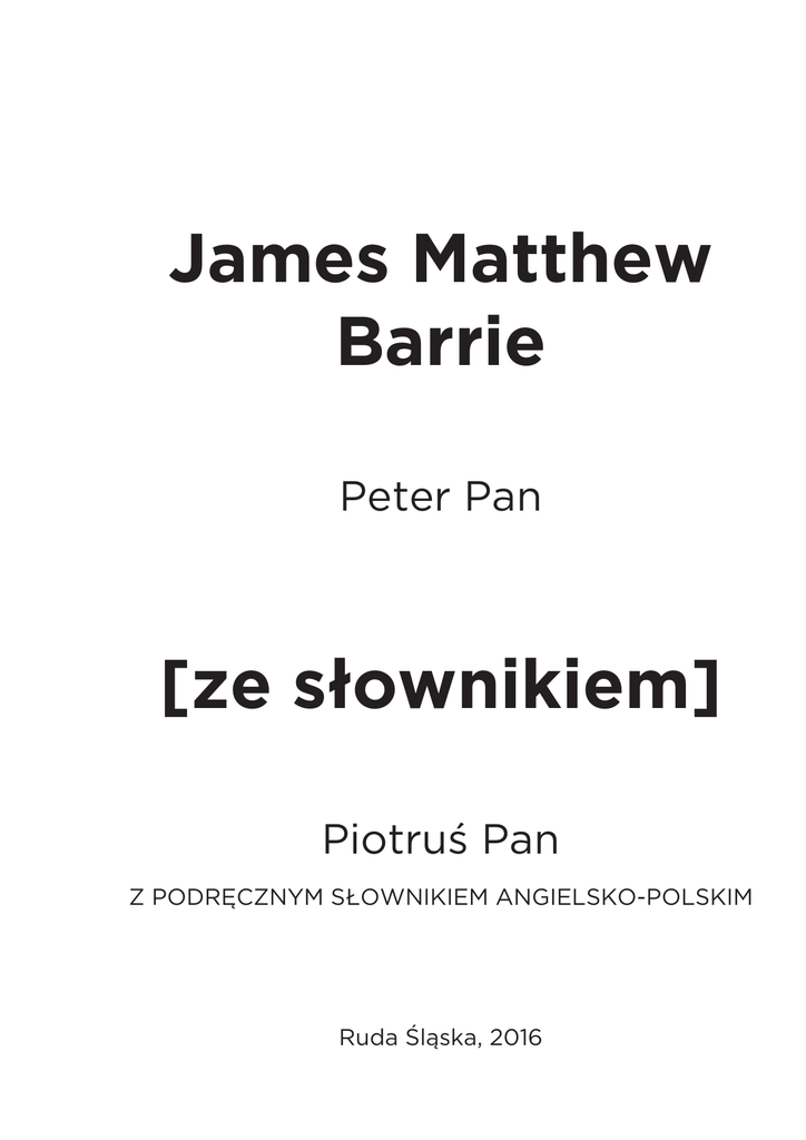 James Matthew Barrie Peter Pan [ze słownikiem] Piotruś Pan Z PODRĘCZNYM SŁOWNIKIEM ANGIELSKO-POLSKIM Ruda Śląska, 2016 CONTENTS VOCABULARY OF MOST COMMON WORDS..................................................................... 7 Chapter 1 PETER BREAKS THROUGH .................................................................................... 23 Chapter 2 THE SHADOW ............................................................................................................. 37 Chapter 3 COME AWAY, COME AWAY! ............................................................................... 51 Chapter 4 THE FLIGHT.................................................................................................................. 71 Chapter 5 THE ISLAND COME TRUE ...................................................................................... 85 Chapter 6 THE LITTLE HOUSE .................................................................................................. 101 Chapter 7 THE HOME UNDER THE GROUND ..................................................................... 113 Chapter 8 THE MERMAIDS' LAGOON .................................................................................... 123 Chapter 9 THE NEVER BIRD ....................................................................................................... 141 Chapter 10 THE HAPPY HOME .................................................................................................. 147 Chapter 11 WENDY'S STORY ...................................................................................................... 157 Chapter 12 THE CHILDREN ARE CARRIED OFF ................................................................ 169 Chapter 13 DO YOU BELIEVE IN FAIRIES? .......................................................................... 177 Chapter 14 THE PIRATE SHIP ..................................................................................................... 189 Chapter 15 "HOOK OR ME THIS TIME" ................................................................................... 199 Chapter 16 THE RETURN HOME................................................................................................ 213 Chapter 17 WHEN WENDY GREW UP .................................................................................... 227 VOCABULARY .................................................................................................................................. 243 Chapter 1 THROUGH PETER BREAKS All children, except one, grow up. They soon know that they will grow up, and the way Wendy knew was this. One day when she was two years old she was playing in a garden, and she plucked another flower and ran with it to her mother. I suppose she must have looked rather delightful, for Mrs. Darling put her hand to her heart and cried, "Oh, why can't you remain like this for ever!" This was all that passed between them on the subject, but henceforth Wendy knew that she must grow up. You always know after you are two. Two is the beginning of the end. Of course they lived at 14 [their house number on their street], and until Wendy came her mother was the chief one. She was a lovely lady, with a romantic mind and such a sweet mocking mouth. Her romantic mind was like the tiny boxes, one within the other, that come from the puzzling East, however many you discover there is always one more; and her sweet mocking mouth had one kiss on it that Wendy could never get, though there it was, perfectly conspicuous in the right-hand corner. The way Mr. Darling won her was this: the many gentlemen who had been boys when she was a girl discovered simultaneously that they loved her, and they all ran to her house to conspicuous - U]XFDMĊF\VLęZ RF]\]ZUDFDMĊF\XZDJę cried - FU\ZRâDýSâDNDý ]DSâDNDý]DZRâDýRNU]\N darling - kochanie, moje PDOHľVWZRXOXELHQLHFSXSLOHN delightful - ]DFKZ\FDMĊF\ discover - RGNU\ýRGQDOHŭý flower - kwiat; flower-pot doniczka grow - URVQĊýZ]URVQĊý UR]ZLMDýVLęVWDZDýVLęJURZXSGRURVQĊý henceforth - RGWĊGRGWDPWHJR czasu kiss - FDâRZDýSRFDâXQHN mocking - PRFNZ\œPLDý SU]HGU]HŭQLDýSRNSLZDýGUZLý NSLQ\GUZLQ\NSLĊF\ mr - SDQSURV]ęSDQD mrs - pani, SURV]ęSDQL plucked - SOXFNUZDýV]DUSDý ]U\ZDýRVNXEDý puzzling - SX]]OH]DVWDQRZLý ]DLQWU\JRZDý]DJDGND âDPLJâyZND]DVWDQDZLDMĊFH romantic - romantyk; URPDQW\F]Q\PLâRVQ\ simultaneously - UyZQRF]HœQLH sweet - VâRGNLH boast - V]F]\FLýVLęFKZDOLýVLę SU]HFKZDâND Brussels - Bruksela; brussels sprout - brukselka cab - WDNVyZNDGRURůND cauliflowers - (cauliflower) kalafior; kalafiorowy doubtful - ZĊWSOLZ\QLHSHZQLH dropped - GURSXSXœFLý ]U]XFLýRSDœýSU]HVWDý feed - NDUPLýů\ZLýVLę GRVWDUF]Dý frightfully - strasznie gleefully - UDGRœQLHWULXPIDOQLH guesses - JXHVV]JDG\ZDý RGJDG\ZDýVĊG]Lý przypuszczenie honourable - honorowy, zaszczytny innermost - najskrytszy, SRâRůRQ\QDMEOLůHMœURGND married - (marU\SRœOXELDý RůHQLýVLęZ\Mœý]DPĊůůRQDW\ ]DPęůQD missing - PLVV]JXELýWęVNQLý FK\ELýQLHWUDILýEUDNXMĊF\ zaginiony nipped - QLSZ\VNRF]\ý XV]F]\SQLęFLHSU]\JU\]LHQLH passion - pasja propose - SURSRQRZDý ]DSURSRQRZDý]DPLHU]Dý RœZLDGF]\ý proud - dumny slamming - VODPWU]DVQĊý U]XFDýRF]HUQLDýWU]DVN VSURXW - Z\SXœFLý]DSXœFLý NLHâHNEUXNVHOND stocks - VWRFNVWDQ]DVyE SDSLHUZDUWRœFLRZ\DNFMDVWURFNV and shares - DNFMHLXG]LDâ\ totting - WRWEU]GĊFPDOXFK kapka, kropelka; totting up GRGDZDý 3(7(53$1 propose to her except Mr. Darling, who took a cab and nipped in first, and so he got her. He got all of her, except the innermost box and the kiss. He never knew about the box, and in time he gave up trying for the kiss. Wendy thought Napoleon could have got it, but I can picture him trying, and then going off in a passion, slamming the door. Mr. Darling used to boast to Wendy that her mother not only loved him but respected him. He was one of those deep ones who know about stocks and shares. Of course no one really knows,
