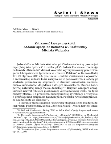Świat i Słowo filologia • nauki społeczne • filozofia • teologia 1(16)/2011 Aleksandra E. Banot Akademia Techniczno-Humanistyczna, Bielsko-Biała Zatrzymać kryzys męskości. Zadanie specjalne Batmana w Piaskownicy Michała Walczaka Jednoaktówka Michała Walczaka pt. Piaskownica1 odczytywana jest najczęściej jako opowieść o „walce płci”. Łukasz Drewniak, recenzując na łamach „Dziennika” dramat Walczaka wyreżyserowany przez Grzegorza Chrapkiewicza (premiera w „Teatrze Polskim” w Bielsku–Białej: 19 i 20 stycznia 2008 r.), pisał m.in.: „Bielska Piaskownica z opowieści o szczeniackiej miłości, która zaczyna się w podstawówce, a kończy po studiach, przeradza się stopniowo w studium samotności, niezrozumienia, niemożności dogadania z drugim człowiekiem. Mówi o końcu pewnej naturalnej relacji męsko-damskiej?”2. Reżyser, Grzegorz Chrapkiewicz, nazwał tytułową piaskownicę „areną życiowej walki, nie tylko między płciami. To przestrzeń międzyludzkiej rywalizacji o wszystko, o przewagę nad drugim na każdym polu. Potrzeba rywalizacji przeważa nad tęsknotą do bliskości”3. Te kierunki przedstawiania Piaskownicy skupiają się na międzyludzkiej relacji, podkreślając, iż owa „życiowa walka”, walka kobiety i męż1 M. Walczak, Piaskownica, „Dialog” 2002, nr 1–2, s. 48–62. Cytując fragmenty dramatu, w nawiasach podaję numer strony. 2 Ł. Drewniak, Zapraszamy do Piaskownicy, „Dziennik” 1.02.2008 r., nr 27, dodatek „Kultura”; cyt za: http://www.teatry.art.pl/!Recenzje/piaskownica_chr_bielsko/zdpi. html, dostęp: 3.12.2008. Michał Walczak, odpowiadając na pytanie, o czym jest Piaskownica, mówi: „o niespełnionej miłości”. Inicjacja w piaskownicy. Z Michałem Walczakiem rozmawiała Iza Natasza Czapska, „Życie Warszawy” 23.02.2003 r.; cyt. za: http://www.teatry.art. pl/!Rozmowy/inicjacjaw.htm, dostęp: 3.12.2008. 3 G. Chrapkiewicz, [bez tytułu], http://www.e-teatr.pl/pl/artykuly/49797.html, dostęp: 15.11.2009. 242 Aleksandra E. Banot czyzny, jest parabolą jakiejś uniwersalnej rywalizacji wpisanej immanentnie w kondycję ludzką. Warto jednak zwrócić uwagę nie tylko na tę relację i jej charakterystykę, ale przyjrzeć się bliżej bohaterom będącym odzwierciedleniem współczesnego obrazu, uwarunkowanej kulturowo, kobiecości i męskości. O ile postać Miłki4 wydaje się dość powierzchownie nakreślona, o tyle Protazek świetnie eksponuje męską tożsamość – związaną, oczywiście, z kulturą Zachodu. Tożsamość, w której wyraźnie zaznaczają się rysy i pęknięcia. Męskość, która, próbując podtrzymać swoje status quo, popada w głęboki kryzys, by nie powiedzieć – ulega rozpadowi. Portret Protazka to obraz samopotwierdzającej się opresyjności męskiego wzorca. Spróbuję nakreślić ten portret, odwołując się do feministycznej krytyki literackiej, czy szerzej, kultury. Ten literaturoznawczy dyskurs wielokrotnie podkreślał, iż bazą dla kobiecych postaci są przetwarzane raz po raz mity, archetypy, symbole, baśnie. Jednym z najczęściej wykorzystywanych mitów jest opowieść o Pigmalionie i Galatei przedstawiona w Metamorfozach Owidiusza. Z łatwością można przywołać ciąg narracji korzystających – w sposób pośredni lub bezpośredni, mniej lub bardziej przetworzony – z tego mitu: opowiadanie Prospera Mérimée Wenus z Ille, Gradiva Wilhelma Jensena (analizowana zresztą przez Sigmunda Freuda), Noce florenckie Heinricha Heinego5, Pigmalion George’a Bernarda Shaw, Kochanka Szamoty Stefana Grabińskiego6 czy Leśnik Marii Kuncewiczowej. Świetnym tworzywem dla konstruowania bohaterek są także różne ikony popkultury, np. Marylin Monroe, lalka Barbie. Zakładam, że w podobny sposób konstruowani są, a w konsekwencji – interpretowani – niektórzy męscy bohaterowie. To właśnie na postać Protazka patrzymy „poprzez” figurę Batmana. Batmana-zabawkę, nieodłączny atrybut Protazka (przeciwstawiony zresztą lalce Miłki), a jednocześnie Batmana-ikonę popkultury, jeden z najbardziej wyrazistych ideałów męskości opartych – co nieuniknione – na stereotypach, banałach, mitach. Ale Batman nawet nie jest protezą Protazka. Ani jego 4 W niniejszym artykule posługuję się imiona bohaterów z przywoływanej adaptacji teatralnej. 5 W. Gutowski, Nagie dusze i maski. O młodopolskich mitach miłości, Kraków 1992, s. 132. Zob. K. Szczuka, Nuda buduaru, [w:] tejże, Kopciuszek, Frankenstein i inne. Feminizm wobec mitu, Kraków 2001, s. 112–113. 6 K. Kłosińska, Stefana Grabińskiego „Kochanka Szamoty”, czyli o tym, jak mężczyzna rodzi kobietę, [w:] tejże, Fantazmaty: Grabiński – Prus – Zapolska, Katowice 2004, s. 13–57. Zatrzymać kryzys męskości 243 alter ego – to za mało7. Batman jest Protazkiem. A raczej – Protazek jest, chce być, Batmanem. Tu już nie ma dwóch paralelnych narracji czy repetycji opowieści – to jest jedna historia. Zaznaczyłam, że Protazek to obraz męskości popadającej w głęboki kryzys. Czy superbohater Batman, współczesny rycerz, zatrzyma ten kryzys? Zanim odpowiem na to pytanie, przyjrzę się najpierw postaci Batmana. Choć jest ona najczęściej kojarzona z filmem, to pierwowzorem był bohater komiksowy. Pierwszy komiks (w serii detektywistycznej), w którym pojawił się Batman, opublikowano w maju 1939 r. Batman – z ang. The Batman lub The Bat-Man oznacza człowieka-nietoperza; jego prawdziwe imię brzmiało Bruce Wayne. Za autorów tej postaci uważa się Boba Kane’a i Billa Fingera8. Z komiksowej historii dowiadujemy się, iż Bruce Wayne, syn pary miliarderów, w dzieciństwie stracił rodziców. Pewnego wieczoru, po spektaklu teatralnym, kiedy w trójkę wracali do domu, zostali napadnięci. Rodzice Batmana zginęli. To wydarzenie odmieniło życie Bruce’a. Kiedy dorósł, postanowił wypowiedzieć wojnę wszelkiemu złu; nie chciał, aby jakikolwiek czł