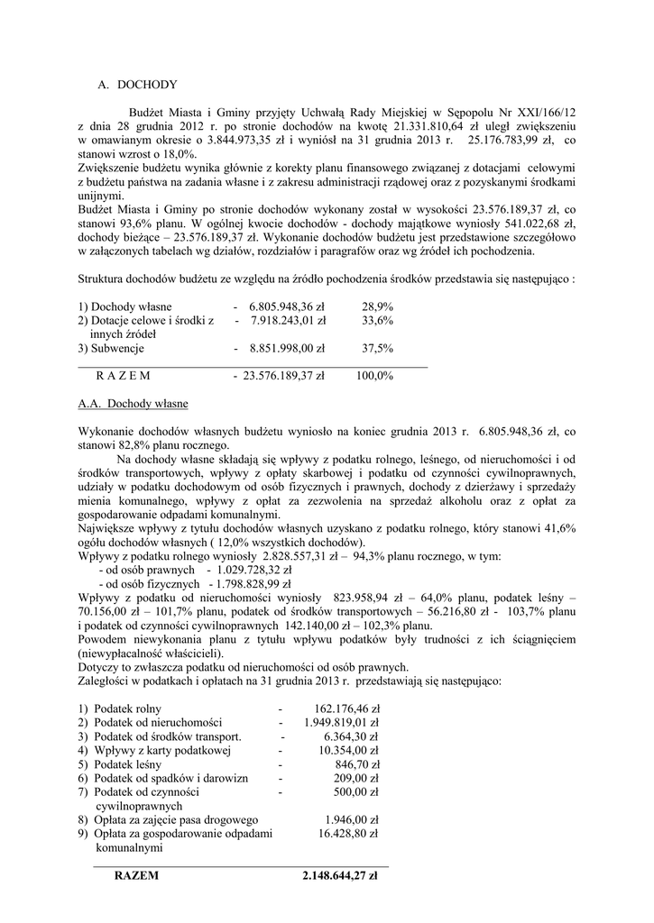A. DOCHODY Budżet Miasta i Gminy przyjęty Uchwałą Rady Miejskiej w Sępopolu Nr XXI/166/12 z dnia 28 grudnia 2012 r. po stronie dochodów na kwotę 21.331.810,64 zł uległ zwiększeniu w omawianym okresie o 3.844.973,35 zł i wyniósł na 31 grudnia 2013 r. 25.176.783,99 zł, co stanowi wzrost o 18,0%. Zwiększenie budżetu wynika głównie z korekty planu finansowego związanej z dotacjami celowymi z budżetu państwa na zadania własne i z zakresu administracji rządowej oraz z pozyskanymi środkami unijnymi. Budżet Miasta i Gminy po stronie dochodów wykonany został w wysokości 23.576.189,37 zł, co stanowi 93,6% planu. W ogólnej kwocie dochodów - dochody majątkowe wyniosły 541.022,68 zł, dochody bieżące – 23.576.189,37 zł. Wykonanie dochodów budżetu jest przedstawione szczegółowo w załączonych tabelach wg działów, rozdziałów i paragrafów oraz wg źródeł ich pochodzenia. Struktura dochodów budżetu ze względu na źródło pochodzenia środków przedstawia się następująco : 1) Dochody własne 2) Dotacje celowe i środki z innych źródeł 3) Subwencje RAZEM - 6.805.948,36 zł - 7.918.243,01 zł 28,9% 33,6% - 8.851.998,00 zł 37,5% - 23.576.189,37 zł 100,0% A.A. Dochody własne Wykonanie dochodów własnych budżetu wyniosło na koniec grudnia 2013 r. 6.805.948,36 zł, co stanowi 82,8% planu rocznego. Na dochody własne składają się wpływy z podatku rolnego, leśnego, od nieruchomości i od środków transportowych, wpływy z opłaty skarbowej i podatku od czynności cywilnoprawnych, udziały w podatku dochodowym od osób fizycznych i prawnych, dochody z dzierżawy i sprzedaży mienia komunalnego, wpływy z opłat za zezwolenia na sprzedaż alkoholu oraz z opłat za gospodarowanie odpadami komunalnymi. Największe wpływy z tytułu dochodów własnych uzyskano z podatku rolnego, który stanowi 41,6% ogółu dochodów własnych ( 12,0% wszystkich dochodów). Wpływy z podatku rolnego wyniosły 2.828.557,31 zł – 94,3% planu rocznego, w tym: - od osób prawnych - 1.029.728,32 zł - od osób fizycznych - 1.798.828,99 zł Wpływy z podatku od nieruchomości wyniosły 823.958,94 zł – 64,0% planu, podatek leśny – 70.156,00 zł – 101,7% planu, podatek od środków transportowych – 56.216,80 zł - 103,7% planu i podatek od czynności cywilnoprawnych 142.140,00 zł – 102,3% planu. Powodem niewykonania planu z tytułu wpływu podatków były trudności z ich ściągnięciem (niewypłacalność właścicieli). Dotyczy to zwłaszcza podatku od nieruchomości od osób prawnych. Zaległości w podatkach i opłatach na 31 grudnia 2013 r. przedstawiają się następująco: 1) 2) 3) 4) 5) 6) 7) Podatek rolny Podatek od nieruchomości Podatek od środków transport. Wpływy z karty podatkowej Podatek leśny Podatek od spadków i darowizn Podatek od czynności cywilnoprawnych 8) Opłata za zajęcie pasa drogowego 9) Opłata za gospodarowanie odpadami komunalnymi RAZEM - 162.176,46 zł 1.949.819,01 zł 6.364,30 zł 10.354,00 zł 846,70 zł 209,00 zł 500,00 zł 1.946,00 zł 16.428,80 zł 2.148.644,27 zł 2 - w tym podatki zahipotekowane 1.837.610,94 zł. Skutki udzielonych przez gminę ulg i zwolnień (bez ulg i zwolnień ustawowych) wynoszą na 31 grudnia 2013 r. - 8.291,92 zł i dotyczą podatku od nieruchomości. Umorzenia zaległości podatkowych wyniosły na koniec grudnia 2013 r. - 18.198,30 zł i dotyczyły: podatku od nieruchomości – 1.470,10 zł, podatku rolnego – 1.854,70 zł i odsetek – 14.873,50 zł. Skutki decyzji wydanych przez organ podatkowy na podstawie ustawy Ordynacja Podatkowa w zakresie rozłożenia na raty i odroczenia terminu płatności zobowiązań podatkowych wyniosły 31.585,02 zł i dotyczyły podatku od nieruchomości 15.018,52 zł, podatku rolnego 1.829,00 zł i odsetek – 14.737,50 zł. Podstawą udzielenia wspomnianych wyżej ulg w spłacie podatków była trudna sytuacja niektórych podatników w naszej gminie oraz okoliczności losowe i względy społeczne. W stosunku do podatników zalegających z podatkami były wystawiane w ciągu okresu sprawozdawczego upomnienia i tytuły wykonawcze. Coraz więcej zaległości jest zabezpieczana hipoteką przymusową i są one praktycznie ściągalne dopiero w trakcie sprzedaży nieruchomości. Wpływy z karty podatkowej, podatku od spadków i darowizn oraz od czynności cywilnoprawnych są realizowane przez Urząd Skarbowy. Skutki obniżenia górnych stawek podatków na 31 grudnia 2013 r. wyniosły 786.327,47 zł i dotyczyły podatku od nieruchomości - 493.057,48 zł, podatku rolnego – 280.341,85 zł oraz podatku od środków transportowych – 12.928,14 zł. Dochody z mienia komunalnego to wpływy z czynszów dzierżawnych, wpływy z najmu lokali mieszkalnych i użytkowych, opłaty za wieczyste użytkowanie oraz wpływy ze sprzedaży mienia komunalnego. Wykonanie dochodów przedstawia się następująco: - czynsze dzierżawne - wpływy ze sprzedaży mienia komunalnego - najem lokali - opłata za użytkowanie wieczyste, trwały zarząd i służebności - wpływy z tytułu przekształcenia prawa wieczystego użytkowania w prawo własności RAZEM - 150.671,43 zł - 84.612,81 zł - 11.423,59 zł 13.448,61 zł - 10.150,00 zł - 270.306,44 zł Wykonanie dochodów w stosunku do planu wyniosło 64,0 %. Zaległości w spłacie dochodów z tych tytułów wynoszą łącznie 119.396,68 zł. W okresie od stycznia do końca grudnia 2013 r. sprzedano nieruchomości zabudowane i niezabudowane na terenie gminy, w tym: - lokal mieszkalny w Sępopolu przy ul. 1.431,63 zł 22 Lipca 4-5, dla najemcy - lokal mieszkalny w Stopkach, dla 2.371,63 zł najemcy - lokal mieszkalny w Gierkinach, dla 1.372,63 zł najemcy - lokal mieszkalny w Domaradach, dla 1.222,63 zł najemcy - działkę niezabudowaną w Sępopolu 3.250,83 zł przy ul. Nad Gubrem, o pow. 387 m² na poprawę warunków zagospodarowania nieruchomości przyległych - lokal mieszkalny w Sępopolu, przy Al. 2.592,63 zł Wojska Polskieg