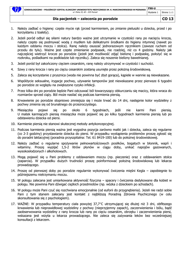 GINEKOLOGICZNO – POŁOŻNICZY SZPITAL KLINICZNY UNIWERSYTETU MEDYCZNEGO IM. K. MARCINKOWSKIEGO W POZNANIU ul. Polna 33, 60 – 535 Poznań F90-U Wydanie 1 Dla pacjentek – zalecenia po porodzie Strona 1 z 1 CO 13 1. Należy zadbać o higienę: częste mycie rąk (przed karmieniem, po zmianie pieluszki u dziecka, przed i po korzystaniu z toalety). 2. Jeżeli poród odbył się siłami natury bardzo ważne jest utrzymanie w czystości rany po nacięciu krocza, należy często się podmywać wodą z mydłem lub delikatnymi środkami do higieny intymnej (nawet po każdym oddaniu moczu i stolca). Ranę należy osuszać jednorazowym ręcznikiem (zawsze ruchem od przodu do tyłu). Ważne jest częste zmienianie podpasek, nie rzadziej, niż co 4 godziny. Należy jak najczęściej wietrzyć krocze po porodzie (jeżeli jest możliwość zdjąć bieliznę i podpaskę, położyć się w rozkroku, pośladkami na podkładzie lub ręczniku). Zaleca się noszenie bielizny bawełnianej. 3. Jeżeli poród był zakończony cięciem cesarskim, ranę należy utrzymywać w czystości i suchości. 4. Szwy z rany krocza i rany po cięciu cesarskim zostaną usunięte przez położną środowiskową. 5. Zaleca się korzystanie z prysznica (woda nie powinna być zbyt gorąca), kąpiele w wannie są niewskazane. 6. Współżycie seksualne, irygacje pochwy, używanie tamponów jest niewskazane przez pierwsze 6 tygodni po porodzie ze względu na zwiększone ryzyko infekcji. 7. Przez kilka dni po porodzie będzie Pani odczuwać ból towarzyszący obkurczaniu się macicy, która wraca do rozmiarów sprzed ciąży. Ból może nasilać się podczas karmienia piersią. 8. Krwawienie po porodzie stopniowo zmniejsza się i może trwać do 14 dni, następnie kolor wydzieliny z pochwy zmienia się od brunatnego do przezroczystego. 9. Miesiączka pojawi się po około 6 tygodniach, jeśli nie karmi Pani piersią. U matek karmiących piersią miesiączka może pojawić się po kilku tygodniach karmienia piersią lub po odstawieniu dziecka od piersi. 10. Karmienie piersią nie stanowi skutecznej metody antykoncepcyjnej. 11. Podczas karmienia piersią ważna jest wygodna pozycja zarówno matki jak i dziecka, zaleca się regularne (co 2-3 godziny) przystawianie dziecka do piersi. W przypadku wystąpienia problemów proszę zgłosić się do poradni laktacyjnej (poradnia przyszpitalna: Tel. 61 8419-100) lub do położnej środowiskowej. 12. Należy zadbać o regularne spożywanie pełnowartościowych posiłków, bogatych w błonnik, wapń i witaminy. Proszę wypijać 1,5-2 litrów płynów w ciągu doby, unikać napojów gazowanych, wysokosłodzonych i alkoholowych. 13. Mogą pojawić się u Pani problemy z oddawaniem moczu (np. pieczenie) oraz z oddawaniem stolca (zaparcia). W przypadku dużych trudności proszę poinformować położną środowiskową lub lekarza prowadzącego. 14. Proszę od pierwszej doby po porodzie regularnie wykonywać ćwiczenia mięśni Kegla – zapobiegnie to późniejszemu nietrzymaniu moczu. 15. W połogu zalecana jest umiarkowana aktywność fizyczna – spacery i ćwiczenia dedykowane dla kobiet w połogu. Nie powinna Pani dźwigać ciężkich przedmiotów (np. wózka z dzieckiem po schodach). 16. W połogu może Pani czuć się rozchwiana emocjonalnie (od euforii do przygnębienia). Jeżeli nie radzi sobie Pani z tym stanem zalecany jest kontakt z najbliższą Poradnią Zdrowia Psychicznego (w celu skonsultowania się z psychologiem). 17. WAŻNE: W przypadku temperatury ciała powyżej 37,7°C utrzymującej się dłużej niż 3 dni, obfitszego krwawienia lub nieprawidłowej wydzieliny z pochwy (nieprzyjemny zapach), zaczerwienienia i bólu, bądź zaobserwowania wydzieliny z rany krocza lub rany po cięciu cesarskim, obrzęku i zaczerwienienia piersi, wskazana jest wizyta u lekarza prowadzącego. Nie zaleca się zażywania leków bez wcześniejszej konsultacji z lekarzem.