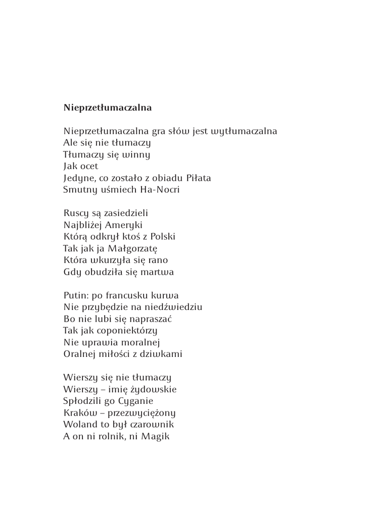Nieprzetłumaczalna Nieprzetłumaczalna gra słów jest wytłumaczalna Ale się nie tłumaczy Tłumaczy się winny Jak ocet Jedyne, co zostało z obiadu Piłata Smutny uśmiech Ha-Nocri Ruscy są zasiedzieli Najbliżej Ameryki Którą odkrył ktoś z Polski Tak jak ja Małgorzatę Która wkurzyła się rano Gdy obudziła się martwa Putin: po francusku kurwa Nie przybędzie na niedźwiedziu Bo nie lubi się napraszać Tak jak coponiektórzy Nie uprawia moralnej Oralnej miłości z dziwkami Wierszy się nie tłumaczy Wierszy – imię żydowskie Spłodzili go Cyganie Kraków – przezwyciężony Woland to był czarownik A on ni rolnik, ni Magik Bez Ziemi chyba opadłem na dno ale ilekroć tak myślę, jest jeszcze drugie dno dno nie ma głębszego znaczenia, jak i depresji, mimo że jest poniżej poziomu – to przez to, że na dnie, mimo że się nie przelewa olewa się, polewa i leje się wodę bez wody byłby tylko dół a bez ziemi – pustka