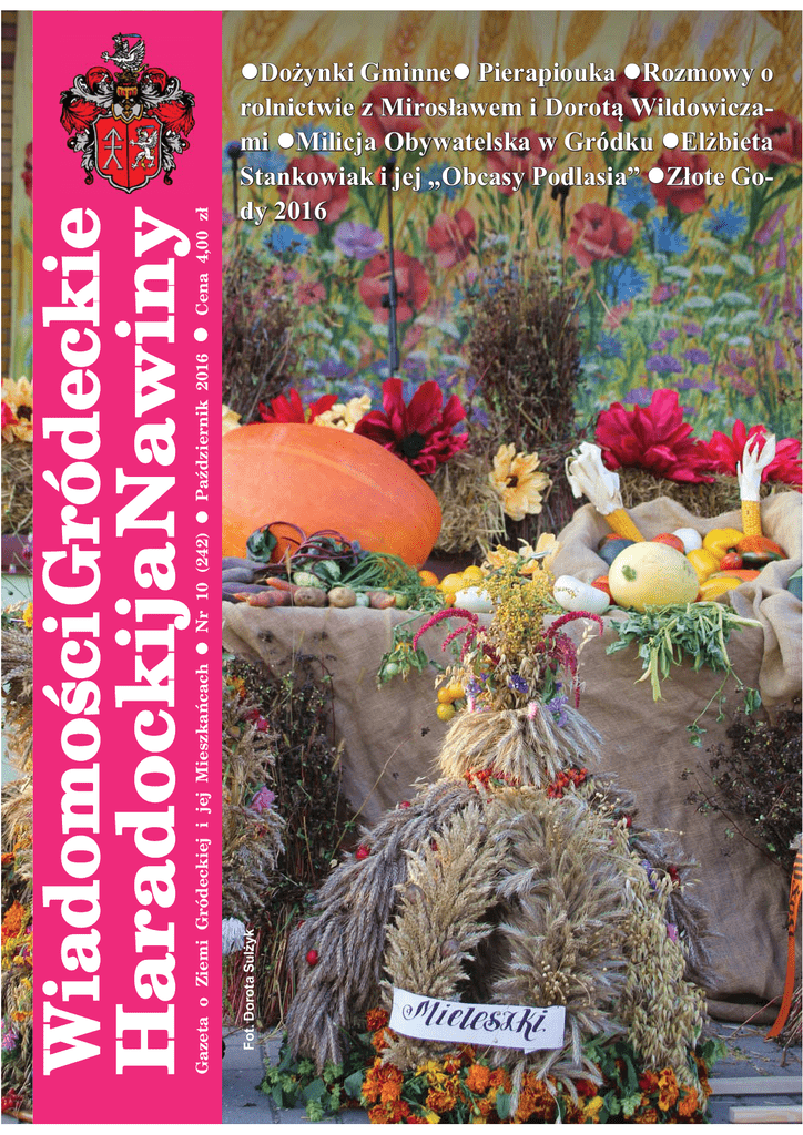 Fot. Dorota Sulżyk Cena 4,00 zł Gazeta o Ziemi Gródeckiej i jej Mieszkańcach Nr 10 (242) Październik 2016 Wiadomości Gródeckie Haradockija Nawiny Dożynki Gminne Gminne Pierapiouka Rozmowy o rolnictwie z Mirosławem i Dorotą Wildowiczami Milicja Obywatelska w Gródku Elżbieta Stankowiak i jej „Obcasy Podlasia” Złote Gody 2016 2 Dożynki Gminne 2016 11.09.2016 r., fot. pracownicy GCK Wiadomości Gródeckie – Haradockija Nawiny PAŹDZIERNIK 2016 Od Redaktor Naczelnej Opony pod sosnami W połowie września, jak co roku całą Polskę, Europę, świat ogarnęła akcja „Sprzątania Świata”. I u nas sprzątano nasz mały gródecki świat. Właściwie i głównie robili to uczniowie z gimnazjum (warto wspomnieć, że innego dnia grupa z Wędkarskiego Koła w Gródku wzięła udział w kajakowym sprzątaniu rzeki Supraśl). Śmieci, które znaleźli na swojej drodze w różnych miejscach Gródka i Walił-Stacji, we- pchnęli do kilkudziesięciu worków. Butelki, puszki, kartony, opakowania po produktach spożywczych, wiadra, zużyte opony. Tak się zastanawiam, kto jest głównym sprawcą zalegania w pobliskich lasach tych brudów. Sprzątają dzieci… Ogromną oponę od traktora ktoś musiał specjalnie przywieźć i znaleźć jej miejsce pod jedną z sosen. Rozmawiałam niedawno na ten temat z moją znajomą leśniczynią. W naszych lasach bywa codziennie. I chociaż przyznała, że porzuconych worków ze śmieciami jest dużo mniej niż kiedyś, to jednak ciągle zdarza się jej spotykać domowe śmieci w lesie. Widuje się porzucone ogromnych gabarytów przedmioty. Zastanawiałyśmy się nad tym. Przecież śmieci odbierane są teraz z gospodarstw co miesiąc w każdej ilości i nie wpływa to na cenę ich wywozu. Przyzwyczajenie, radość z tego powodu, że pod osłoną nocy da się oszukać wszystkich i podrzucić trochę niepotrzebnych gratów w lesie? Plagą są ciągle śmieci przy drodze wyrzucane przez kierowców. Zmienia się nasze nastawienie do ekologii, mamy większą świadomość, nauczyliśmy się segregować śmieci, doceniać komposty… ale ciągle jeszcze jest dużo do zrobienia. Dzieci są w miarę wyedukowane… W modzie jest recykling. Widziałam piękne przedmioty wykonane z niepotrzebnych opon na jednej z gródeckich działek, na warszawskiej wystawie „Zieleń to życie”, na której byłam z Grupą Gospodyń Gródeckich, zauroczyła mnie cudna kompozycja kwiatowa wykonana na bazie sprężyn z materaca. Może i w naszym gospodarstwie niektóre śmieci mogłyby dostać drugie życie? Z lasu na pole… Jako że dożynki odświętowano w naszej gminie na początku września, poruszamy w tym numerze tematy związane 3 z rolnictwem. Jeśli ktoś nie wie, co to była pierapiouka, koniecznie musi przeczytać, jak kiedyś kończono żniwa. Bardzo się cieszę, że udało mi się porozmawiać o współczesnym gospodarowaniu z Mirosławem Wildowiczem i jego żoną Dorotą. Bycie rolnikami to dla nich powód do dumy, choć czasy dla rolnictwa niełatwe. Państwo Wildowiczowie zostali docenieni i wystąpili w tym roku w roli starostów na wojewódzkich dożynkach. PS. Apel do Was: jeśli ktoś ma niepotrzebne archiwalne (z pierwszych ośmiu lat) numery „WG-HN”, bardzo proszę o przyniesienie do redakcji. Chciałabym odtworzyć całe archiwum, a jeszcze ciągle brakuje mi starych numerów. Zapraszamy do współpracy. Podrzucajcie tematy, nadsyłajcie swoje zdjęcia, artykuły, listy do 20 października na adres [email protected] D S ▲ Dożynki Gminne 2016 „Plon niesiemy plon...” Relacja z Dożynek Gminnych Wzorem lat ubiegłych gminne dożynki rozpoczęły się od przybycia kolorowego korowodu dożynkowego z zespołami ludowymi i delegacjami z sołectw gminy Gródek pod scenę amfiteatru nad zalewem w Zarzeczanach. „Plon niesiemy, plon w Gospodarza dom…” – śpiewano. Takim symbolem plonów były niesione wieńce dożynkowe przygotowane pieczołowicie. „Rolnicy zebrali plon, z którego powstał ten oto chleb. Gospodarzu, prosimy, podziel go dla wszystkich mieszkańców tak, aby nikomu nie zabrakło tego chleba” – takimi słowami przywitała Wójta Gminy Gródek Wiesława Kuleszę oraz Przewodniczącego Rady Gminy Wieczysława Gościka tegoroczna Starościna Ilona Łukoszyk (żona rolnika Jakuba Łukoszyka z Gródka), która wraz ze Starostą Andrzejem Niesterczukiem (rolnikiem z Kolonii Mieleszki) wręczyła chleb leżący na haftowanym ręczniku. Zgodnie z tradycją, Wójt podzielił się chlebem z obecnymi na dożynkach mieszkańcami gminy Gródek. Proboszczowie gródeckich parafii – prawosławnej – ks. Mikołaj Ostapczuk i katolickiej – ks. Stanisław Kochanowski – odprawili krótkie nabożeństwo i poświęci- li płody rolne oraz wieńce dożynkowe. Tego dnia w odbyły się również nabożeństwa dziękczynne rolników w podzięce za tegoroczne plony w cerkwi i kościele. Gródeckie dożynki zaszczycili swoją obecnością licznie przybyli goście m.in.: Elżbieta Filipowicz – przedstawiciel Urzędu Marszałkowskiego, Dyrektor Departamentu Rozwoju Obszarów Wiejskich, Jolanta Den – Wicestarosta Powiatu Białostockiego, Włodzimierz Konończuk – Burmistrz Michałowa, Anna Grycuk - Radna Powiatu Białostockiego i Dyrektor Zespołu Szkół w Gródku, Jan Kaczan – członek zarządu Powiatu Białostockiego, Sławomir Jakimiuk - proboszcz Parafii Prawosławnej w Mostowlanach, Piotr Zdrodowski – Komendant Komisariatu Policji w Zabłudowie, Radni Gminy Gródek wraz z Przewodniczącym. Wójt Wiesław Kulesza podziękował wszystkim rolnikom z gminy Gródek oraz sąsiednich gmin za pracę, dzięki której codziennie mamy na stole świeży chleb. Życzył im, aby natura zawsze nagradzała ich trud urodzajem. Życzenia w stronę rolników kierował również Przewodniczący Rady Gminy Wieczysław Gościk, Elżbieta Filipowicz - Dyrektor Departamentu Rozwoju Obszarów Wiejskich oraz Jolanta Den – Wicestarosta Powiatu Bia