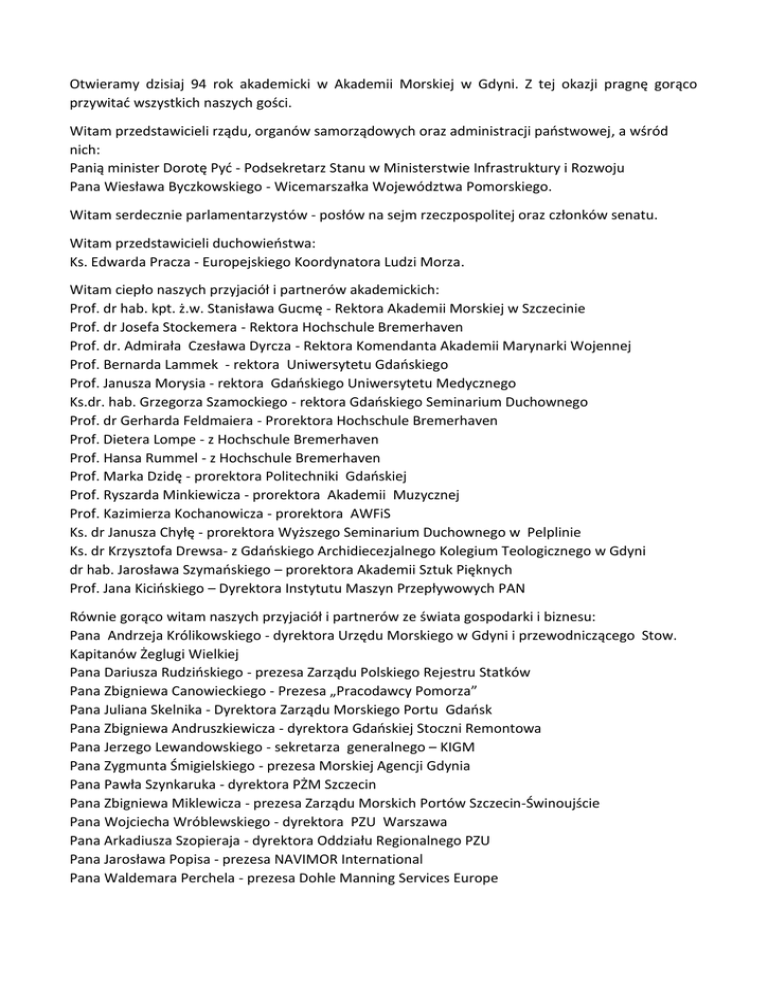 Otwieramy dzisiaj 94 rok akademicki w Akademii Morskiej w Gdyni. Z tej okazji pragnę gorąco przywitać wszystkich naszych gości. Witam przedstawicieli rządu, organów samorządowych oraz administracji państwowej, a wśród nich: Panią minister Dorotę Pyć - Podsekretarz Stanu w Ministerstwie Infrastruktury i Rozwoju Pana Wiesława Byczkowskiego - Wicemarszałka Województwa Pomorskiego. Witam serdecznie parlamentarzystów - posłów na sejm rzeczpospolitej oraz członków senatu. Witam przedstawicieli duchowieństwa: Ks. Edwarda Pracza - Europejskiego Koordynatora Ludzi Morza. Witam ciepło naszych przyjaciół i partnerów akademickich: Prof. dr hab. kpt. ż.w. Stanisława Gucmę - Rektora Akademii Morskiej w Szczecinie Prof. dr Josefa Stockemera - Rektora Hochschule Bremerhaven Prof. dr. Admirała Czesława Dyrcza - Rektora Komendanta Akademii Marynarki Wojennej Prof. Bernarda Lammek - rektora Uniwersytetu Gdańskiego Prof. Janusza Morysia - rektora Gdańskiego Uniwersytetu Medycznego Ks.dr. hab. Grzegorza Szamockiego - rektora Gdańskiego Seminarium Duchownego Prof. dr Gerharda Feldmaiera - Prorektora Hochschule Bremerhaven Prof. Dietera Lompe - z Hochschule Bremerhaven Prof. Hansa Rummel - z Hochschule Bremerhaven Prof. Marka Dzidę - prorektora Politechniki Gdańskiej Prof. Ryszarda Minkiewicza - prorektora Akademii Muzycznej Prof. Kazimierza Kochanowicza - prorektora AWFiS Ks. dr Janusza Chyłę - prorektora Wyższego Seminarium Duchownego w Pelplinie Ks. dr Krzysztofa Drewsa- z Gdańskiego Archidiecezjalnego Kolegium Teologicznego w Gdyni dr hab. Jarosława Szymańskiego – prorektora Akademii Sztuk Pięknych Prof. Jana Kicińskiego – Dyrektora Instytutu Maszyn Przepływowych PAN Równie gorąco witam naszych przyjaciół i partnerów ze świata gospodarki i biznesu: Pana Andrzeja Królikowskiego - dyrektora Urzędu Morskiego w Gdyni i przewodniczącego Stow. Kapitanów Żeglugi Wielkiej Pana Dariusza Rudzińskiego - prezesa Zarządu Polskiego Rejestru Statków Pana Zbigniewa Canowieckiego - Prezesa „Pracodawcy Pomorza” Pana Juliana Skelnika - Dyrektora Zarządu Morskiego Portu Gdańsk Pana Zbigniewa Andruszkiewicza - dyrektora Gdańskiej Stoczni Remontowa Pana Jerzego Lewandowskiego - sekretarza generalnego – KIGM Pana Zygmunta Śmigielskiego - prezesa Morskiej Agencji Gdynia Pana Pawła Szynkaruka - dyrektora PŻM Szczecin Pana Zbigniewa Miklewicza - prezesa Zarządu Morskich Portów Szczecin-Świnoujście Pana Wojciecha Wróblewskiego - dyrektora PZU Warszawa Pana Arkadiusza Szopieraja - dyrektora Oddziału Regionalnego PZU Pana Jarosława Popisa - prezesa NAVIMOR International Pana Waldemara Perchela - prezesa Dohle Manning Services Europe Pana Ryszarda Szlegiera - dyrektora Przeds.Badawczo- Produkcyjnego „ENAMOR” Kmdr por. Adama Roszkowskiego - Komendanta Kaszubskiego Dywizjonu Straży Granicznej Witam członków Senatu Akademii Morskiej, nauczycieli akademickich, członków załóg statków szkolnych, pozostałych pracowników uczelni oraz wszystkich jej studentów. Szczególnie serdecznie witam studentów, którzy 23 września rozpoczęli studia w naszej uczelni. Dzisiejsza inauguracja, której najważniejszym momentem będzie uroczysta immatrykulacja, jest przede wszystkim Waszym świętem. Wśród studentów rozpoczynających studia w nowym roku akademickim witam bardzo ciepło 20 – osobową grupę słuchaczy z Angoli, którzy podejmują studia II i III stopnia. Witam także doktorantów, którzy podjęli studia doktoranckie jest Was już ponad 40. Witam wszystkich miłych gości, a szczególnie ciepło rodziny i bliskich naszych studentów. Korzenie naszej uczelni sięgają roku 1920 kiedy z wizji i marzeń o Polsce morskiej powstała Szkoła Morska w Tczewie. Jej podstawy tworzone były w momencie, gdy pomysł wydawał się szalony, bo Polska nie miała nic - ani portu, ani floty, ani wymaganego przez nią zaplecza. Mądrość wizjonerów sprawdziła się szybko - gdy w 1926 r. utworzone zostało pierwsze przedsiębiorstwo armatorskie Żegluga Polska, które kupiło pięć masowców, potem w 1927 „Polskarob” z „Roburami”, w 1930 r. GAL Gdynia-Ameryka Linie Żeglugowe z transatlantykami – na statkach tych służyli, tak na pokładzie jak i w maszynie, „tczewiacy”. W 1927 r. Leon Rusiecki, jako pierwszy z absolwentów (rocznika 1923) został kapitanem żeglugi wielkiej, zaś w 1929 r. jego kolega z roku Zbigniew Deyczakowski objął dowództwo „Robura”. Świadomi znaczenia bogatej historii i wierni najpiękniejszym morskim tradycjom, bacznie obserwujemy zmiany zachodzące w Polsce i świecie. Odpowiedzią na nie jest współczesna uczelnia i jej bogata oferta studiów, liczne kierunki i specjalności, programy nauczania spełniające międzynarodowe standardy. Kształcenie interdyscyplinarne, dostosowane do wymogów współczesnego świata, pozwala naszym absolwentom skutecznie konkurować na globalnym rynku pracy. Wizytówką uczelni w świecie, jak i niezwykłym ambasadorem Polski, jest żaglowiec „Dar Młodzieży”. Piękno fregaty, żeglarskie rzemiosło i wola walki załogi oraz liczne zwycięstwa w regatach budziły i budzą powszechny podziw. Akademia Morska w Gdyni jest też armatorem statku badawczo-szkoleniowego „Horyzont II”, wyposażonego w urządzenia najnowszej generacji, zdolnego do żeglugi w strefie polarnej. Inauguracja nowego roku akademickiego jest okazją do spojrzenia na drogę, którą przeszliśmy przez 94 lata działalności. Zaczynając praktycznie od zera w roku 1920, dzisiaj, dzięki entuzjazmowi osób zaangażowanych w rozwój szkolnictwa morskiego, jak również dzięki wytężonej pracy nauczycieli akademickich, członków załóg statków szkolnych i pracowników administracji i obsługi jesteśmy od wielu lat, według międzynarodowego rankingu CSIC, w pierwszej czwórce światowych uczelni morskich. Infrastruktura dydaktyczna uczelni obejmuje szereg unikalnych laboratoriów oraz zestaw nowocz
