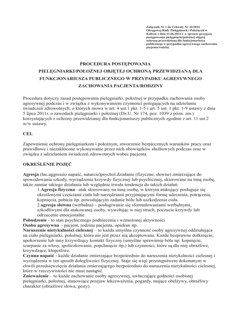Załącznik Nr 1 do Uchwały Nr 34/2014 Okręgowej Rady Pielęgniarek i Położnych w Kaliszu z dnia 11.06.2014 r. w sprawie przyjęcia postępowania pielęgniarki/położnej objętej ochroną przewidzianą dla funkcjonariusza publicznego w przypadku agresywnego zachowania pacjenta/rodziny PROCEDURA POSTĘPOWANIA PIELĘGNIARKI/POŁOŻNEJ OBJĘTEJ OCHRONĄ PRZEWIDZIANĄ DLA FUNKCJONARIUSZA PUBLICZNEGO W PRZYPADKU AGRESYWNEGO ZACHOWANIA PACJENTA/RODZINY Procedura dotyczy zasad postępowania pielęgniarki, położnej w przypadku zachowania osoby agresywnej podczas i w związku z wykonywaniem czynności polegających na udzielaniu świadczeń zdrowotnych, o których mowa w art. 4 ust.1 pkt. 1-5 i art. 5 ust. 1 pkt. 1-9 ustawy z dnia 5 lipca 2011r. o zawodach pielęgniarki i położnej (Dz.U. Nr 174, poz. 1039 z pózn. zm.) korzystających z ochrony przewidzianej dla funkcjonariuszy publicznych zgodnie z art. 11 ust.2 w/w ustawy. CEL Zapewnienie ochrony pielęgniarkom i położnym, stworzenie bezpiecznych warunków pracy oraz prawidłowe i niezakłócone wykonywanie przez nich obowiązków służbowych podczas oraz w związku z udzielaniem świadczeń zdrowotnych wobec pacjenta. OKREŚLENIE POJĘĆ Agresja (łac.aggressio napaść, natarcie)psychol.działanie (fizyczne, słowne) zmierzające do spowodowania szkody, wyrządzenia krzywdy fizycznej lub psychicznej, skierowane na inną osobę, także zamiar takiego działania lub względnie trwała tendencja do takich działań. 1.Agresja fizyczna– atak skierowany na inną osobę, w którym atakujący posługuje się określonymi częściami ciała lub narzędziami przyjmującymi formę uderzenia, potrącenia, kopnięcia, pobicia itp. powodującym zadanie bólu lub uszkodzenia ciała. 2.agresja słowna (werbalna) – posługiwanie się sformułowaniami werbalnymi, szkodliwymi dla atakowanej osoby, wywołując w niej strach, poczucie krzywdy lub odrzucenie emocjonalne. Pobudzenie - to stan psychicznego podniecenia i wzmożonej aktywności Osoba agresywna – pacjent, rodzina pacjenta, opiekun itp. Naruszenie nietykalności cielesnej – to każda umyślna czynność osoby agresywnej oddziałująca na ciało pielęgniarki, położnej, która nie jest przez nią akceptowana. Każde bezprawne dotknięcie, upokorzenie lub inny krzywdzący kontakt fizyczny (umyślne sprawienie bólu np. kopnięcie, szarpanie za włosy, spoliczkowanie, popchnięcie itp.) lub czynności, które są dla niej obraźliwe, krzywdzące, kłopotliwe. Czynna napaść - każde działanie zmierzające bezpośrednio do naruszenia nietykalności cielesnej i wyrządzenia w ten sposób dolegliwości fizycznej. Staje się więć przestępstwem dokonanym w chwili przedsięwzięcia działania zmierzającego bezpośrednio do naruszenia nietykalności cielesnej, które w rzeczywistości nie musi nastąpić. Znieważenie – to każde zachowanie osoby agresywnej, uwłaczające godności osobistej pielęgniarki, położnej, stanowiące przejaw lekceważenia, pogardy, mające obelżywy, obraźliwy charakter (obraźliwe słowa, gesty). W praktyce jest to używanie w stosunku do pielęgniarki i położnej słów wulgarnych, powszechnie uznanych za obelżywe, gesty. OPIS ZASAD ZASTOSOWANIA PROCEDURY Warunki : · Objęcie pielęgniarki i położnej ochroną przewidzianą dla funkcjonariusza publicznego możliwe jest dopiero po zaistnieniu przesłanek zawartych w art. 4 ust.1 pkt. 1-5 i art. 5 ust.1 pkt.1-9 ustawy z dnia 15 lipca 2011r. o zawodach pielęgniarki i położnej, które muszą wystąpić podczas i w związku z wykonywaniem przez pielęgniarkę, położną wskazanych w ww. przepisach prawnych czynności. · Zaistnienie zdarzenia zdrowotnego „podczas i w związku” z wykonywaniem przez pielęgniarkę, położną świadczenia zdrowotnego oznacza zbieżność czasową i miejscową zachowania osoby agresywnej i wykonywania obowiązków służbowych przez funkcjonariusza publicznego niezależnie od miejsca pracy i formy zatrudnienia. · Pełnienie obowiązków służbowych przez pielęgniarkę, położną może mieć miejsce również poza godzinami pracy, jeśli w tym czasie podejmuje czynności związane z udzielaniem świadczeń zdrowotnych jednak musi zaistnieć związek czasowo-przyczynowy pomiędzy zaistniałym zdarzeniem a udzielanym rodzajem świadczeń. · W świetle art. 11 ust.2 ustawy z dnia 15 lipca 2911r. o zawodach pielęgniarki, położnej, pielęgniarka, położna wykonująca czynności, o których mowa poniżej jest traktowana w taki sposób przez prawo, w jaki sposób kodeks karny traktuje funkcjonariuszy publicznych. Na przykład: naruszenie jej nietykalności cielesnej, zniewaga czy czynna napaść na nią będzie kwalifikowana jako przestępstwo, o którym mowa w przepisach kodeksu karnego. Przesłanki: 1.Ochrona prawna przysługująca pielęgniarce objętej ochroną przewidzianą dla funkcjonariusza publicznego podczas wykonywania czynności zawodowych polegających na: ➢ Rozpoznawaniu warunków i potrzeb zdrowotnych pacjenta ➢ Rozpoznawaniu problemów pielęgnacyjnych pacjenta ➢ Planowaniu i sprawowaniu opieki pielęgnacyjnej nad pacjentem ➢ Samodzielnym udzielaniu w określonym zakresie świadczeń zapobiegawczych, diagnostycznych, leczniczych i rehabilitacyjnych oraz medycznych czynności ratunkowych ➢ Realizacji zleceń lekarskich w procesie diagnostyki, leczenia i rehabilitacji 2.Ochrona prawna przysługująca położnej objętej ochroną przewidzianą dla funkcjonariusza publicznego podczas wykonywania czynności zawodowych polegających na: ➢ Prowadzeniu porodu fizjologicznego oraz monitorowaniu płodu z wykorzystaniem aparatury medycznej ➢ Rozpoznawaniu ciąży, sprawowaniu opieki nad kobietą w przebiegu ciąży fizjologicznej, a także prowadzeniu w określonym zakresie badań niezbędnych w monitorowaniu ciąży fizjologicznej ➢ Kierowaniu na badania konieczne do jak najwcześniejszego rozpoznania ciąży wysokiego ryzyka ➢ Przyjmowan
