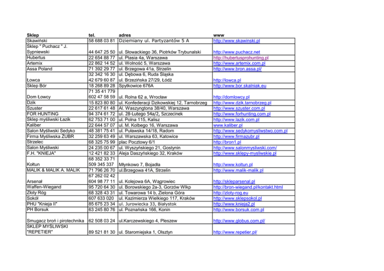 Sklep Skawiński Sklep " Puchacz " J. Sypniewski Hubertus Artemix Assa Poland Łowca Sklep Bór Dom Łowcy Dzik Szuster FOR HUNTING Sklep myśliwski Łazik Kaliber Salon Myśliwski Sedyko Firma Myśliwska ŻUBR Strzelec Salon Myśliwski F.H. "KNIEJA" Kołtun MALIK & MALIK A. MALIK Arsenał Waffen-Wiegand Złoty Róg Sokół PHU "Knieja II" PH Borsuk tel. adres 58 688 03 81 Dziemiany ul. Partyzantów 5 A www http://www.skawinski.pl 44 647 25 50 22 654 88 77 22 862 14 52 71 392 29 77 32 342 16 30 42 679 60 87 18 268 89 28 71 35 41 779 602 47 58 59 15 823 80 80 22 617 61 48 94 374 61 72 62 753 71 00 22 644 57 07 48 381 75 41 32 259 63 49 68 325 75 99 24 235 00 67 12 421 82 33 68 352 33 71 509 345 337 71 796 26 70 67 262 02 42 604 98 77 11 95 720 64 30 68 328 43 31 607 633 020 85 675 23 34 63 245 80 76 ul. Słowackiego 36, Piotrków Trybunalski ul. Ptasia 4a, Warszawa ul. Wolność 5, Warszawa ul. Brzegowa 41a, Strzelin ul. Dębowa 6, Ruda Śląska ul. Brzezińska 27/29, Łódź Spytkowice 676A http://www.puchacz.net http://hubertusprohunting.pl http://www.artemix.com.pl http://www.bron.assa.pl/ ul. Rolna 62 a, Wrocław ul. Konfederacji Dzikowskiej 12, Tarnobrzeg Al. Waszyngtona 38/40, Warszawa ul. 28-Lutego 54a/2, Szczecinek ul. Polna 115, Kalisz ul. M. Kolbego 16, Warszawa ul. Puławska 14/18, Radom ul. Warszawska 63, Katowice plac Pocztowy 6/1 ul. Wyszyńskiego 21, Gostynin Aleja Daszyńskiego 32, Kraków http://domlowcy.pl http://www.dzik.tarnobrzeg.pl http://www.szuster.com.pl http://www.forhunting.com.pl http://www.lazik.com.pl www.kaliber.pl http://www.sedykomysliwstwo.com.pl http://www.firmazubr.pl http://bron1.pl http://www.salonmysliwski.com/ http://www.sklepy-mysliwskie.pl Młynkowo 7, Bojadła ul.Brzegowa 41A, Strzelin http://www.koltun.pl http://www.malik-malik.pl ul. Kolejowa 6A, Wągrowiec ul. Borowskiego 2a-3, Gorzów Wlkp ul. Towarowa 14 b, Zielona Góra ul. Kazimierza Wielkiego 117, Kraków http://skleparsenal.pl http://bron-wiegand.pl/kontakt.html http://zloty-rog.eu http://www.sklepsokol.pl http://www.knieja2.pl http://www.borsuk.com.pl ul. Jurowiecka 33, Białystok ul. Poznańska 166, Konin Smugacz broń i pirotechnika 62 508 03 24 ul.Karczewskiego 4, Pleszew SKLEP MYŚLIWSKI "REPETIER" 89 521 81 30 ul. Staromiejska 1, Olsztyn http://lowca.pl http://www.bor.skalniak.eu http://www.globus.com.pl/ http://www.repetier.pl/ ELCOLTHUBERTUS "Hubert" Sklep Myśliwski Hubertus "Hubertus" S.C. Salon Myśliwski 14 622 32 22 ul. Pułaskiego 6, Tarnów 94 342 64 95 ul. Kaszubska 10 D, Koszalin 85 653 22 25 ul. Saturna 41, Białystok http://sklep.elcolt-hubertus.com.pl http://www.hubert.koszalin.pl/ www.hubertus.com.pl 84 639 23 37 Nowy Rynek 20, Zamość "Kaliber 7,62" Sklep z Bronią 32 275 30 72 ul. Goethego 28 /3, Zabrze "Łowiec" Sklep Antoni Tertel Radex-Broń B.U.H. "SECPOL" "Wadera" Sklep Myśliwski ARGALI Sklep Myśliwski Piotr Robacki Broń Akcesoria Jager Arkadiusz Surel Firma Militaria.pl Jedność Łowiecka Rusznikarnia Włodzimierz Łucyk Mr. Hunter Obrót Bronią i Amunicją Stanisław Nowak PK-U "Parabellum" EdeX Mosin Wojtylak Włodzimierz Sklep Łowiecki 87 563 08 37 23 672 48 30 71 341 92 49 695 40 98 39 ul. 1 Maja 25, Suwałki ul. Zielona Ścieżka 4a, Ciechanów ul. Gwarna 13, Wrocław ul. Kaliska 11, Władysławów http://www.bestgun.pl http://www.secpol.com.pl/ http://www.wadera.com.pl/ 696 25 42 13 os. Unii Lubelskiej 3 A http://www.sklepmysliwski-argali-robacki.pl/ 85 742 04 30 ul. Legionowa 9 /1 lok. 142 71 347 47 47 ul. Oławska 16, Wrocław http://www.militaria.pl/ 22 826 77 45 ul. Nowy Świat 35, Warszawa 56 684 12 30 Plac 700 Lecia 23, Kowalewo Pomorskie http://www.mrhunter.pl 22 614 05 12 22 783 57 77 13 445 83 39 71 314 15 53 http://www.bron.waw.pl http://www.parabellum.pl http://www.edex-sklep.pl http://mosin.pl ul.Modlińska 226 a, Warszawa ul. Armii Krajowej 77, Sulejówek Warzyce 209, Jasło ul. Strzelce 96 /2, Dobroszyce 32 215 43 44 ul. Ligocka 40, Czechowice-Dziedzice