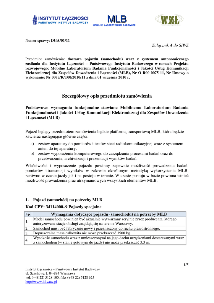 MLB MOBILNE LABORATORIUM BADAWCZE Numer sprawy: DGA/01/11 Załącznik A do SIWZ Przedmiot zamówienia: dostawa pojazdu (samochodu) wraz z systemem autonomicznego zasilania dla Instytutu Łączności – Państwowego Instytutu Badawczego w ramach Projektu rozwojowego: Mobilne Laboratorium Badania Funkcjonalności i Jakości Usług Komunikacji Elektronicznej dla Zespołów Dowodzenia i Łączności (MLB), Nr O R00 0075 11, Nr Umowy o wykonanie: Nr 0075/R/T00/2010/11 z dnia 01 września 2010 r. Szczegółowy opis przedmiotu zamówienia Podstawowe wymagania funkcjonalne stawiane Mobilnemu Laboratorium Badania Funkcjonalności i Jakości Usług Komunikacji Elektronicznej dla Zespołów Dowodzenia i Łączności (MLB) Pojazd będący przedmiotem zamówienia będzie platformą transportową MLB, która będzie zawierać następujące główne części: a) zestaw aparatury do pomiarów i testów sieci radiokomunikacyjnej wraz z systemem anten do tej aparatury, b) zestaw wyposażenia komputerowego do zarządzania procesami badań oraz do przetwarzania, archiwizacji i prezentacji wyników badań. Właściwości i wyposażenie pojazdu powinny zapewnić możliwość prowadzenia badań, pomiarów i transmisji wyników w zakresie określonym metodyką wykorzystania MLB, zarówno w czasie jazdy jak i na postoju w terenie. W czasie postoju w bazie powinna istnieć możliwość prowadzenia prac utrzymaniowych wszystkich elementów MLB. 1. Pojazd (samochód) na potrzeby MLB Kod CPV: 34114000–9 Pojazdy specjalne Lp. 1. 2. 3. 4. Wymagania dotyczące pojazdu (samochodu) na potrzeby MLB Model samochodu powinien być aktualnie wytwarzany seryjnie przez producenta, którego autoryzowane stacje obsługi znajdują się na terenie Warszawy. Samochód musi być fabrycznie nowy i przeznaczony do ruchu prawostronnego. Dopuszczalna masa całkowita nie może przekraczać 3500 kg. Wysokość samochodu wraz z umieszczonymi na jego dachu urządzeniami dostarczanymi wraz z samochodem (w stanie gotowym do jazdy) nie może przekraczać 3,3 m. 1/5 Instytut Łączności – Państwowy Instytut Badawczy ul. Szachowa 1, 04-894 Warszawa tel. (+48 22) 5128 100, faks (+48 22) 5128 625 http://www.itl.waw.pl Lp. Wymagania dotyczące pojazdu (samochodu) na potrzeby MLB Wnętrze samochodu będzie funkcjonalnie podzielone na trzy części, tj.: − przedział kierowcy z siedzeniami dla dwóch osób (kierowca + pasażer), − część kontrolno-pomiarowa, w której zainstalowany będzie system kontrolno-pomiarowy i niezbędne urządzenia pomocnicze, 5. − część transportowa przeznaczona na pozostałe urządzenia i systemy pomocnicze oraz przewożenie dodatkowej aparatury itp. Fizyczne oddzielenie części kontrolno-pomiarowej od transportowej nie jest przedmiotem zamówienia. Operator systemu kontrolno-pomiarowego powinien mieć możliwość przejścia do przedziału 6. kierowcy bez wychodzenia z samochodu. Przedział kierowcy nie może być odizolowany od części kontrolno pomiarowej (np. drzwiami, itp.). 7. Wysokość wnętrza części kontrolno-pomiarowej pojazdu powinna wynosić minimum 1,7 m. Wymiary minimalne przestrzeni do zagospodarowania na część kontrolno-pomiarową i 8. transportową: szerokość – 1,4 m, długość – 2,5 m. Konstrukcja i wyposażenie dachu (punkty mocowania, relingi itp.) powinny umożliwić 9. zainstalowanie na stałe kompletu anten (ok. 10 szt.) do aparatury badaniowej i pomiarowej. Powinien być możliwy dostęp do anten poprzez szyberdach. Pokrywa szyberdachu powinna 10. być przesuwana. Rozmiary szyberdachu i jego umieszczenie powinny umożliwić wygodne manipulacje przy antenach. W bocznej ścianie powinny być uszczelnione przepusty umożliwiające przeprowadzenie kabli 11. antenowych. 12. Nie jest przewidziana potrzeba bezpośredniego dostępu do anten w czasie jazdy. W części pomiarowej musi znajdować się obrotowy fotel dla operatora systemu kontrolnopomiarowego. Fotel operatora powinien umożliwiać bezpieczne, zgodne z obowiązującymi przepisami dotyczącymi bezpieczeństwa w ruchu drogowym, wykorzystywanie go w czasie 13. jazdy (powinien być wyposażony w pasy bezpieczeństwa oraz posiadać blokady uniemożliwiające jego poruszanie się podczas jazdy). Ostateczna decyzja o dokładnej lokalizacji fotela operatora zostanie podjęta w trakcie wyposażania wnętrza pojazdu z uwzględnieniem wskazań dostawcy pojazdu. Z prawej strony pojazdu powinny znajdować się drzwi przesuwane z oknem, umożliwiające 14. swobodne wejście operatora systemu kontrolno-pomiarowego lub wniesienie dodatkowego sprzętu. Po przeciwnej stronie powinno znajdować się okno. Z tyłu samochodu powinny znajdować się otwierane na zewnątrz o 270° dwuskrzydłowe nieprzeszkolone drzwi lub nieprzeszklona klapa, umożliwiające dostęp do części 15. transportowej. Z tyłu pojazdu powinien znajdować się stopień ułatwiający wejście do części transportowej samochodu. Samochód powinien być wyposażony w silnik wysokoprężny o mocy min. 140 KM (100kW) 16. umożliwiający rozwijanie na szosie lub autostradzie prędkości co najmniej 80 km/h (przy pełnym obciążeniu). Samochód powinien posiadać: a) ABS b) ASR c) ESP 17. d) system automatycznej kontroli napędu na 4 koła, uwzględniający stopień obciążenia osi pojazdu e) wspomaganie kierownicy f) wspomaganie hamulców. Samochód powinien być wyposażony w elektrycznie opuszczane szyby i sterowane 18. elektrycznie lusterka. 2/5 Lp. 19. 20. 21. 22. 23. 24. 25. 26. 27. 28. 29. 30. 31. Wymagania dotyczące pojazdu (samochodu) na potrzeby MLB Z przodu i z tyłu samochodu powinny być zainstalowane zaczepy do awaryjnego holowania. Pojazd powinien być wyposażony także w hak holowniczy wraz z osprzętem elektrycznym do holowania przyczepy. Pojazd powinien być wyposażony w standardowe układy ogrzewania, wentylacji i klimatyzacji (chłodzenia) sterowane elektronicznie, a także – jeśli jest taka potrzeba – w dodatkowe układy ogrzewania, we