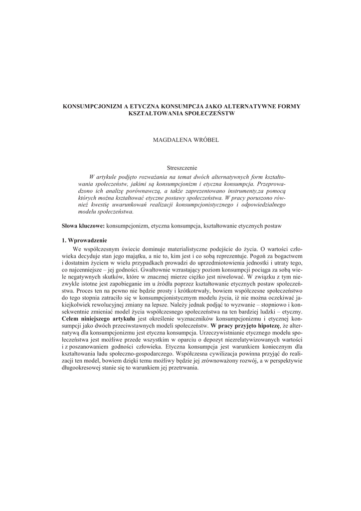 KONSUMPCJONIZM A ETYCZNA KONSUMPCJA JAKO ALTERNATYWNE FORMY KSZTAŁTOWANIA SPOŁECZESTW MAGDALENA WRÓBEL Streszczenie W artykule podjto rozwaania na temat dwóch alternatywnych form kształtowania społeczestw, jakimi s konsumpcjonizm i etyczna konsumpcja. Przeprowadzono ich analiz porównawcz, a take zaprezentowano instrumenty,za pomoc których mona kształtowa etyczne postawy społeczestwa. W pracy poruszono równie kwesti uwarunkowa realizacji konsumpcjonistycznego i odpowiedzialnego modelu społeczestwa. Słowa kluczowe: konsumpcjonizm, etyczna konsumpcja, kształtowanie etycznych postaw 1. Wprowadzenie We współczesnym wiecie dominuje materialistyczne podejcie do ycia. O wartoci człowieka decyduje stan jego majtku, a nie to, kim jest i co sob reprezentuje. Pogo za bogactwem i dostatnim yciem w wielu przypadkach prowadzi do uprzedmiotowienia jednostki i utraty tego, co najcenniejsze – jej godnoci. Gwałtownie wzrastajcy poziom konsumpcji pociga za sob wiele negatywnych skutków, które w znacznej mierze ciko jest niwelowa. W zwizku z tym niezwykle istotne jest zapobieganie im u ródła poprzez kształtowanie etycznych postaw społeczestwa. Proces ten na pewno nie bdzie prosty i krótkotrwały, bowiem współczesne społeczestwo do tego stopnia zatraciło si w konsumpcjonistycznym modelu ycia, i nie mona oczekiwa jakiejkolwiek rewolucyjnej zmiany na lepsze. Naley jednak podj to wyzwanie – stopniowo i konsekwentnie zmienia model ycia współczesnego społeczestwa na ten bardziej ludzki – etyczny. Celem niniejszego artykułu jest okrelenie wyznaczników konsumpcjonizmu i etycznej konsumpcji jako dwóch przeciwstawnych modeli społeczestw. W pracy przyjto hipotez, e alternatyw dla konsumpcjonizmu jest etyczna konsumpcja. Urzeczywistnianie etycznego modelu społeczestwa jest moliwe przede wszystkim w oparciu o depozyt niezrelatywizowanych wartoci i z poszanowaniem godnoci człowieka. Etyczna konsumpcja jest warunkiem koniecznym dla kształtowania ładu społeczno-gospodarczego. Współczesna cywilizacja powinna przyj do realizacji ten model, bowiem dziki temu moliwy bdzie jej zrównowaony rozwój, a w perspektywie długookresowej stanie si to warunkiem jej przetrwania. 104 Magdalena Wróbel Konsumpcjonizm a etyczna konsumpcja jako alternatywne formy kształtowania społeczestw 2. Konsumpcjonizm jako model funkcjonowania współczesnego społeczestwa Jedn z cech charakterystycznych współczesnego pokolenia jest konsumpcjonistyczny model ycia. Encyklopedia pedagogiczna XXI wieku podaje kilka definicji konsumpcjonizmu: 1) postawa yciowa, charakteryzujca si nadmiernym deniem do zdobywania i zuywania duej liczby rónych dóbr materialnych; 2) styl ycia, który wyej stawia denia do tego, aby „mie” ni „by”; 3) przekonanie, e szczcie osiga si poprzez nabywanie dóbr1. Natomiast Słownik wyrazów obcych PWN definiuje konsumpcjonizm jako postaw yciow charakteryzujc si nadmiernym przywizywaniem wagi do zdobywania dóbr materialnych2. W niniejszej pracy konsumpcjonizm bdzie rozumiany jako postawa charakteryzujca si nadmiernym materializmem we wszystkich sferach ycia. Przejawy konsumpcjonizmu mona zaobserwowa w wielu aspektach ycia codziennego współczesnego pokolenia. Współczenie ludzie dokonuj zakupu nadmiernej iloci dóbr, czsto takich, które nie s im potrzebne i stanowi tylko gadety na pokaz. Problemem jest to, i w wielu przypadkach dobra te nie s nabywane za zaoszczdzone rodki, ale s kupowane na kredyt. Łatwo, z jak mona uzyska kredyt konsumpcyjny powoduje, e wiele osób yje ponad stan zadłuajc si. Zgodnie z raportem Biura Informacji Gospodarczej InfoMonitor „InfoDług” (edycja z lutego 2011) Polacy posiadaj 28,21 mld zł zaległych płatnoci, a rednie, zaległe zadłuenie Polaka wynosi 13 861 zł. Na przestrzeni ostatniego roku niespłacane zadłuenie wzrosło o 68%, a tendencj wzrostow wykazuje nie tylko kwota przeterminowanych zobowiza, lecz równie liczba klientów podwyszonego ryzyka3. Obecnie mona zaobserwowa take skrócenie cyklu ycia nabywanych produktów. Zmieniajca si moda i ch podania za ni powoduje, e ludzie czsto dokonuj zakupu nowych dóbr, mimo i te, które posiadaj s nadal uyteczne. Wpływ mody widoczny jest wyranie w przypadku takich dóbr jak samochody, telefony komórkowe, sprzt komputerowy, RTV i AGD oraz odzie. Skutkiem tak szybkiej rotacji dóbr jest problem nadmiernej iloci odpadów. Wydaje si, e spełniła si obawa wyraona niegdy przez Hannah Arendt, która przestrzegała przed sytuacj, w której pochłanianie i wyrzucanie rzeczy stałoby si nieomal tak szybkie, jak ich pojawienie w wiecie, a zalepione obfitoci dóbr społeczestwo, nie potrafiło ju zda sobie sprawy z własnej daremnoci i ulotnoci4. Współczesne pokolenie kupuje głównie produkty wytwarzane masowo, bowiem niemodne jest nieposiadanie tego, co posiadaj inni. Gdy w danym sezonie modny jest okrelony model telefonu to wszyscy chc go posiada, gdy na ekrany kin wejdzie nowy film to gadety z bohaterami tego filmu maj wszyscy – takie przykłady z ycia codziennego mona by mnoy. Nawet w przypadku ywnoci masowo produkcji jest akceptowana przez konsumentów, bowiem powoduje to nisze jej ceny. Konsumenci dokonujc zakupu towarów nie interesuj si tym gdzie, przez kogo i w jakich warunkach zostały wytworzone. Wystarczy wskaza jako przykład warunki pracy w przemyle odzieowym po to, aby udowodni, i jednak jest powód do zainteresowania procesem produkcji 1 Encyklopedia pedagogiczna XXI wieku, Wydawnictwo Akademickie ak, Tom II, Warszawa 2003, s. 783. Słownik wyrazów obcych, Wydawnictwo Naukowe PWN, Warszawa 1996, s. 589. 3 InfoDług. Ogólnopolski raport o zaległym zadłueniu i klientach podwyszonego ryzyka, BIG InfoMonitor, Edycja 15, Warszawa luty 2011, s. 3–4. 4 Winiewski W., Procesja konsumpcji, www.ekonsument.pl, (08.03.2011). 2 Studies & Proceedings of Polish Association for Knowledge Management Nr 51, 2011 105 kupowanych dóbr. Według danych BBC wikszo z blisko 20 milionów os