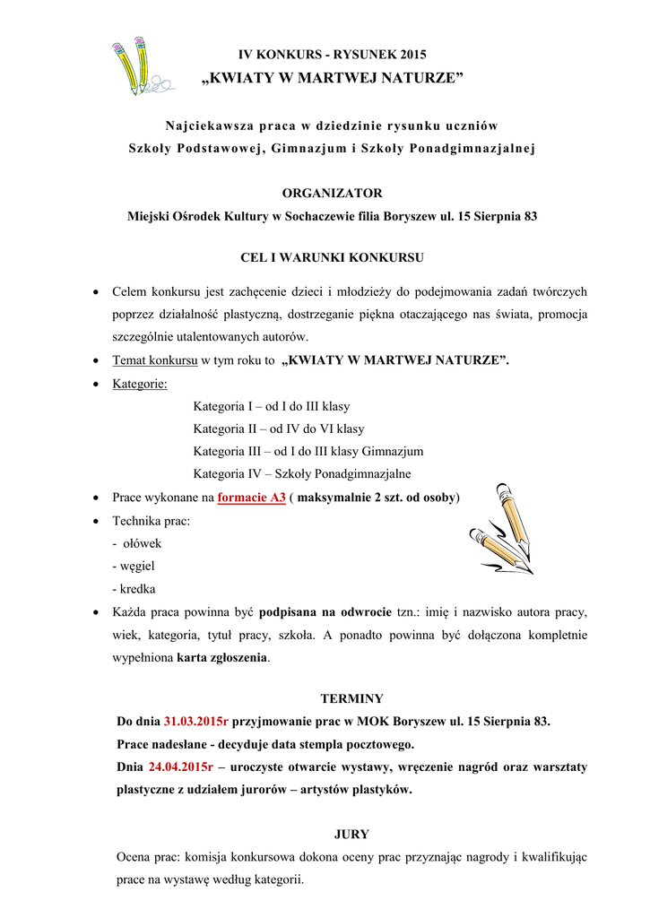 IV KONKURS - RYSUNEK 2015 „KWIATY W MARTWEJ NATURZE” Najciekawsza praca w dziedzinie rysunku uczniów Szkoły Podstawowej , Gimnazjum i Szkoły Ponadgimnazjalne j ORGANIZATOR Miejski Ośrodek Kultury w Sochaczewie filia Boryszew ul. 15 Sierpnia 83 CEL I WARUNKI KONKURSU Celem konkursu jest zachęcenie dzieci i młodzieży do podejmowania zadań twórczych poprzez działalność plastyczną, dostrzeganie piękna otaczającego nas świata, promocja szczególnie utalentowanych autorów. Temat konkursu w tym roku to „KWIATY W MARTWEJ NATURZE”. Kategorie: Kategoria I – od I do III klasy Kategoria II – od IV do VI klasy Kategoria III – od I do III klasy Gimnazjum Kategoria IV – Szkoły Ponadgimnazjalne Prace wykonane na formacie A3 ( maksymalnie 2 szt. od osoby) Technika prac: - ołówek - węgiel - kredka Każda praca powinna być podpisana na odwrocie tzn.: imię i nazwisko autora pracy, wiek, kategoria, tytuł pracy, szkoła. A ponadto powinna być dołączona kompletnie wypełniona karta zgłoszenia. TERMINY Do dnia 31.03.2015r przyjmowanie prac w MOK Boryszew ul. 15 Sierpnia 83. Prace nadesłane - decyduje data stempla pocztowego. Dnia 24.04.2015r – uroczyste otwarcie wystawy, wręczenie nagród oraz warsztaty plastyczne z udziałem jurorów – artystów plastyków. JURY Ocena prac: komisja konkursowa dokona oceny prac przyznając nagrody i kwalifikując prace na wystawę według kategorii. NAGRODY Nagrody rzeczowe i dyplomy przyznane będą w trzech kategoriach wiekowych - I, II, III miejsce. POSTANOWIENIA DODATKOWE Nagrodzone, wyróżnione i zakwalifikowane na wystawę prace będzie można oglądać w Galerii Miejskiego Ośrodka Kultury w Sochaczewie filia Boryszew. Udział w konkursie jest bezpłatny; Organizator konkursu nie ponosi odpowiedzialności za ewentualne zmiany lub odwołanie konkursu z przyczyn od niego niezależnych; Nadesłane na konkurs prace nie powinny brać udziału w innych wcześniejszych konkursach; Prace nie spełniające warunków konkursu nie będą rozpatrywane; Uczestnicy i nauczyciele, opiekunowie wyrażają zgodę na przetwarzanie danych osobowych i wizerunku do celów związanych z konkursem; Organizatorzy nie zwracają prac nadesłanych na konkurs oraz zastrzegają sobie dowolność dysponowania nimi. Zwrot prac jest tylko możliwy na pisemny wniosek i koszt zgłaszającego w terminie do 28 czerwca br. Nadesłanie prac na konkurs jest równoznaczne z akceptacją regulaminu konkursu. Z A PR A S Z A M Y Miejski Ośrodek Kultury w Sochaczewie Filia Boryszew ul. 15 Sierpnia 83 96-500 Sochaczew Tel.: 46 863 07 68 lub 668 850 337 adres email: [email protected] lub [email protected] Koordynator konkursu Ewa Kubeł- Zielińska – artysta malarz, instruktor Pracowni Rysunku MOK Strona internetowa: www.mok.sochaczew.pl KARTA ZGŁOSZENIA do konkursu RYSUNEK 2015 „KWIATY W MARTWEJ NATURZE” Imię i nazwisko uczestnika Konkursu ……………………………………………………………………. Klasa ……………………………………………………………………………………………………………. Tytuł pracy ………………………………………………………………………………………………………. Oświadczenie Po zapoznaniu się z regulaminem konkursu rysunkowego „Kwiaty w martwej naturze” wyrażam zgodę na wykorzystanie pracy konkursowej mojego dziecka/ ucznia. ……………………………………………………….. Imię i nazwisko dziecka/ucznia (drukowanymi literami) …………………………………………….. Data i podpis czytelny rodzica lub opiekuna Dane adresowe …………………………………………………………………………….. Szkoła lub inny adres do korespondencji ………………………………………………….. Ulica, miejscowość ………………………………………………………………………… Kod pocztowy …………………………………………………………………………….. Imię i nazwisko koordynatora konkursu w szkole ………………………………………… Telefon kontaktowy ……………………………………………………………………….. E-mail: …………………………………………………………………………………….. ……………………………………………….. Podpis i pieczątka dyrektora ( tylko w przypadku zgłoszeń szkolnych)