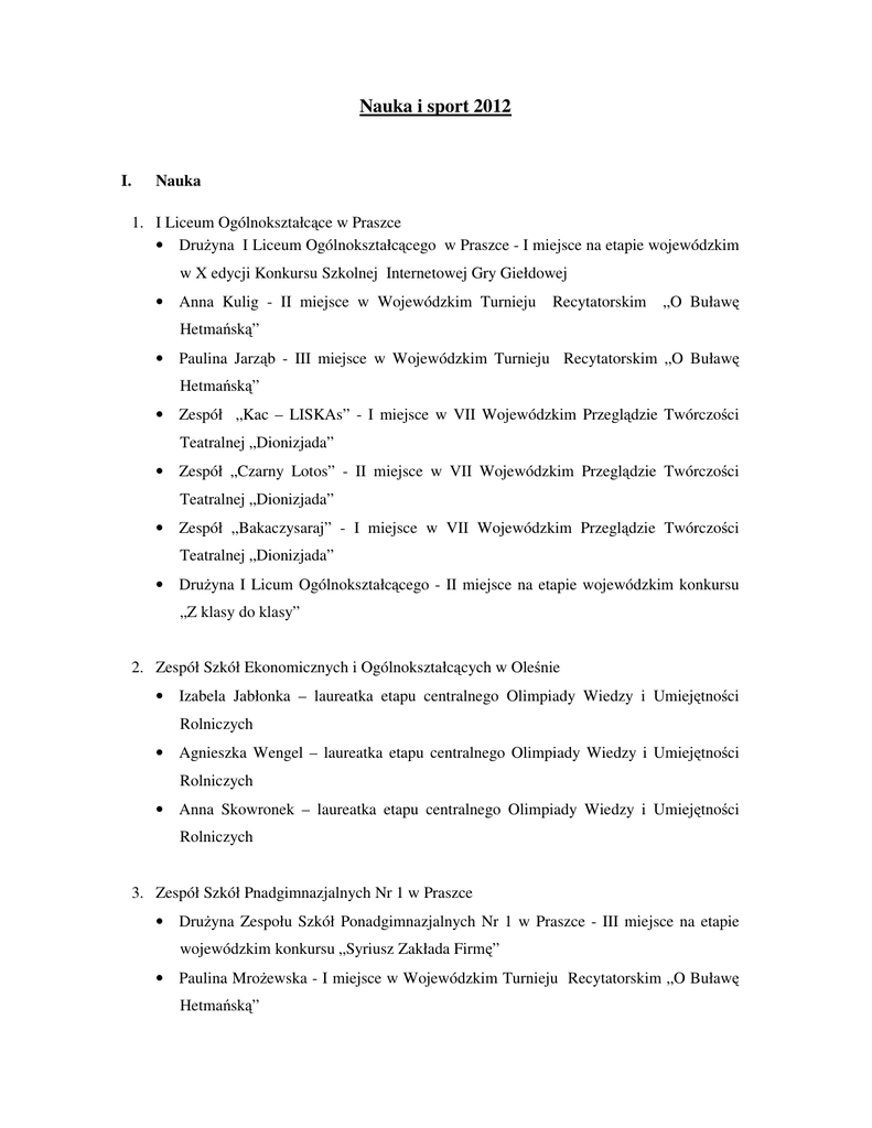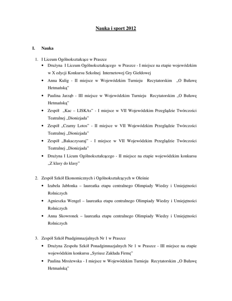 Nauka i sport 2012 I. Nauka 1. I Liceum Ogólnokształc ce w Praszce • Dru yna I Liceum Ogólnokształc cego w Praszce - I miejsce na etapie wojewódzkim w X edycji Konkursu Szkolnej Internetowej Gry Giełdowej • Anna Kulig - II miejsce w Wojewódzkim Turnieju Recytatorskim „O Buław Hetma sk ” • Paulina Jarz b - III miejsce w Wojewódzkim Turnieju Recytatorskim „O Buław Hetma sk ” • Zespół „Kac – LISKAs” - I miejsce w VII Wojewódzkim Przegl dzie Twórczo ci Teatralnej „Dionizjada” • Zespół „Czarny Lotos” - II miejsce w VII Wojewódzkim Przegl dzie Twórczo ci Teatralnej „Dionizjada” • Zespół „Bakaczysaraj” - I miejsce w VII Wojewódzkim Przegl dzie Twórczo ci Teatralnej „Dionizjada” • Dru yna I Licum Ogólnokształc cego - II miejsce na etapie wojewódzkim konkursu „Z klasy do klasy” 2. Zespół Szkół Ekonomicznych i Ogólnokształc cych w Ole nie • Izabela Jabłonka – laureatka etapu centralnego Olimpiady Wiedzy i Umiej tno ci Rolniczych • Agnieszka Wengel – laureatka etapu centralnego Olimpiady Wiedzy i Umiej tno ci Rolniczych • Anna Skowronek – laureatka etapu centralnego Olimpiady Wiedzy i Umiej tno ci Rolniczych 3. Zespół Szkół Pnadgimnazjalnych Nr 1 w Praszce • Dru yna Zespołu Szkół Ponadgimnazjalnych Nr 1 w Praszce - III miejsce na etapie wojewódzkim konkursu „Syriusz Zakłada Firm ” • Paulina Mro ewska - I miejsce w Wojewódzkim Turnieju Recytatorskim „O Buław Hetma sk ” • Dawid Popczyk - III miejsce na etapie wojewódzkim konkursu „Poka nam j zyk” • Paulina Smolarz - I miejsce na etapie rejonowym „I Rejonowego Konkursu Wiedzy o Krajach Niemieckoj zycznych” • Mateusz Pre - finalista etapu krajowego w konkursie „Genius Logicus • Dru yna Zespołu Szkół Ponadgimnazjalnych Nr 1 w Praszce - I miejsce na etapie centralnym w Olimpiadzie Wiedzy o Polskim i Europejskim Rynku Pracy • Bartosz Urbaniak – finalista etapu Ogólnopolskiej Olimpiady Logistycznej 4. Zespół Szkół Zawodowych w Ole nie • Dru yna Zespołu Szkół Zawodowych w Ole nie - III miejsce w XIX Wojewódzkim Turnieju Matematycznym dla uczniów zasadniczej szkoły zawodowej • Damian Hu – laureat XIX Wojewódzkim Turnieju Matematycznym dla uczniów zasadniczej szkoły zawodowej • Damian Bujak - III miejsce w XVIII Wojewódzkim Konkursie wiedzy o bezpiecze stwie i higienie pracy w rolnictwie 5. Zespół Szkół Ponadgimnazjalnych w Dobrodzieniu • Koło LOP - III miejsce na etapie wojewódzkim dla najlepiej pracuj cego Koła LOP • Duet: Justyna Tworek i Ewelina Krawczyk - I miejsce na etapie wojewódzkim w „IX Festiwalu Piosenki Obcoj zycznej – Tułowice 2012” • Dorota Matziol - I miejsce na etapie wojewódzkim w Ogólnopolskim Turnieju Wiedzy Po arniczej • Beniamin Brylka - I miejsce na etapie centralnym w II Ogólnopolskich Zawodach Modeli aglowych i II miejsce na etapie centralnym w XVIII Mi dzynarodowych Mistrzostwach Modeli Redukcyjnych Pływaj cych (junior) 6. Zespół Szkół w Ole nie • Wojciech Tobi – laureat ogólnopolskich olimpiad i konkursów matematycznych, zdobywca Diamentowego Indeksu AGH • Adam Zeler - laureata etapu centralnego XIX Olimpiady Wiedzy o Prawach Człowieka • Marek Stró yk - finalista etapu centralnego LXII Olimpiady Literatury i J zyka Polskiego i laureat III miejsca na etapie krajowym w II Mi dzynarodowym Konkursie Literacko – Plastycznym „Polska to brzmi dumnie” • Jakub Zagrobelny - za zaj cie III miejsca na etapie centralnym w II Olimpiadzie z Wiedzy o Planowaniu i Zarz dzaniu Karier Zawodow • Paweł Kudli ski - udział na etapie centralnym w LIII Olimpiadzie Wiedzy o Polsce i wiecie Współczesnym • Paweł Koty - I miejsce na etapie wojewódzkim w XLIV Małej Olimpiady Matematycznej • Maciej Cebula - I miejsce na etapie wojewódzkim w XLIV Małej Olimpiady Matematycznej • Aleksandra Stró yk - laureatka etapu regionalnego w Konkursie „Deutsche Quiz” • Martyna Wo - laureatka Wojewódzkiego Konkursu Grafiki Komputerowej „Kim jest – moje metamorfozy” • Dariusz Janik - I miejsce na etapie regionalnym w I Konkursie Matematycznym Pogranicza l sko - Opolskiego • Duet: Beniamin Sosnowski i Maciej Gniadek - udział na etapie krajowym w Ogólnopolskim Konkursie „Rola Parlamentu Krajowego w Unii Europejskiej” • Sylwia Glomb – I miejsce na etapie wojewódzkim w konkursie plastycznym „ ołnierz Polski w Misjach Pokojowych” • Michał Jaron - finalista etapu wojewódzkiego w konkursie „Wiedza o BHP w rolnictwie” i w Wojewódzkim Turnieju J zyka Niemieckiego • Wiktoria Matyja - I miejsce na etapie wojewódzkim konkursu „Stosunki mi dzynarodowe w praktyce” • Alicja Grzesik - laureatka etapu krajowego Mi dzynarodowego Konkursu Literacko – Plastycznego „Polska to brzmi dumnie” Stypendy ci Prezesa Rady Ministrów 1. 2. 3. 4. 5. Emilia Kubik – Zespół Szkół w Ole nie Marek Kraska – Zespół Szkół Zawodowych w Ole nie Agnieszka Wengel – Zespół Szkół Ekonomicznych i Ogólnokształc cych w Ole nie Amanda Rejak - Zespół Szkół Ekonomicznych i Ogólnokształc cych w Ole nie Piotr Duda – I Liceum Ogólnokształc ce w Praszce 6. Justyna Drewniok – Zespół Szkół w Gorzowie l. 7. Klaudia Zadworna – Zespół Szkół Ponadgimnazjalnych Nr 1 Praszce 8. Małgorzata Zagrodnik - Zespół Szkół Ponadgimnazjalnych Nr 1 Praszce 9. Amanda Ku – Zespół Szkół Ponadgimnazjalnych w Dobrodzieniu 10. Agnieszka Pietrucha – Zespół Szkół Ponadgimnazjalnych w Dobrodzieniu 11. Justyna Tworek - Zespół Szkół Ponadgimnazjalnych w Dobrodzieniu II. Sport A. Szkoły Podstawowe – klasyfikacja gmin: Dziewczyny Chłopcy 1. Olesno 86 pkt 1. Praszka 77 pkt 2. Praszka 59 pkt 2. Rudniki 67 pkt 3. Dobrodzie 50 pkt 3. Olesno 65 pkt „Razem” 1. Olesno 157 pkt 2. Praszka 144 pkt 3. Rudniki 122 pkt 4. Radłów 104 pkt 5. Dobrodzie 76 pkt 6. Gorzów l. 70 pkt 7. Z bowice 15 pkt B. Klasyfikacja Szkó