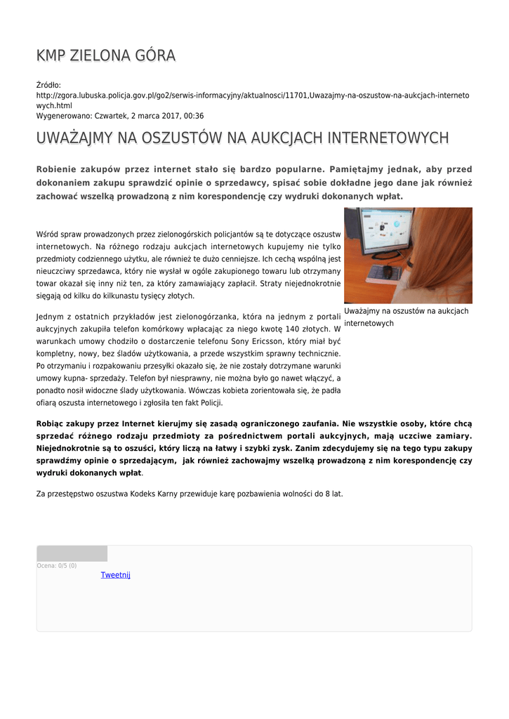 KMP ZIELONA GÓRA Źródło: http://zgora.lubuska.policja.gov.pl/go2/serwis-informacyjny/aktualnosci/11701,Uwazajmy-na-oszustow-na-aukcjach-interneto wych.html Wygenerowano: Czwartek, 2 marca 2017, 00:36 UWAŻAJMY NA OSZUSTÓW NA AUKCJACH INTERNETOWYCH Robienie zakupów przez internet stało się bardzo popularne. Pamiętajmy jednak, aby przed dokonaniem zakupu sprawdzić opinie o sprzedawcy, spisać sobie dokładne jego dane jak również zachować wszelką prowadzoną z nim korespondencję czy wydruki dokonanych wpłat. Wśród spraw prowadzonych przez zielonogórskich policjantów są te dotyczące oszustw internetowych. Na różnego rodzaju aukcjach internetowych kupujemy nie tylko przedmioty codziennego użytku, ale również te dużo cenniejsze. Ich cechą wspólną jest nieuczciwy sprzedawca, który nie wysłał w ogóle zakupionego towaru lub otrzymany towar okazał się inny niż ten, za który zamawiający zapłacił. Straty niejednokrotnie sięgają od kilku do kilkunastu tysięcy złotych. Jednym z ostatnich przykładów jest zielonogórzanka, która na jednym z portali aukcyjnych zakupiła telefon komórkowy wpłacając za niego kwotę 140 złotych. W Uważajmy na oszustów na aukcjach internetowych warunkach umowy chodziło o dostarczenie telefonu Sony Ericsson, który miał być kompletny, nowy, bez śladów użytkowania, a przede wszystkim sprawny technicznie. Po otrzymaniu i rozpakowaniu przesyłki okazało się, że nie zostały dotrzymane warunki umowy kupna- sprzedaży. Telefon był niesprawny, nie można było go nawet włączyć, a ponadto nosił widoczne ślady użytkowania. Wówczas kobieta zorientowała się, że padła ofiarą oszusta internetowego i zgłosiła ten fakt Policji. Robiąc zakupy przez Internet kierujmy się zasadą ograniczonego zaufania. Nie wszystkie osoby, które chcą sprzedać różnego rodzaju przedmioty za pośrednictwem portali aukcyjnych, mają uczciwe zamiary. Niejednokrotnie są to oszuści, który liczą na łatwy i szybki zysk. Zanim zdecydujemy się na tego typu zakupy sprawdźmy opinie o sprzedającym, jak również zachowajmy wszelką prowadzoną z nim korespondencję czy wydruki dokonanych wpłat. Za przestępstwo oszustwa Kodeks Karny przewiduje karę pozbawienia wolności do 8 lat. Ocena: 0/5 (0) Tweetnij