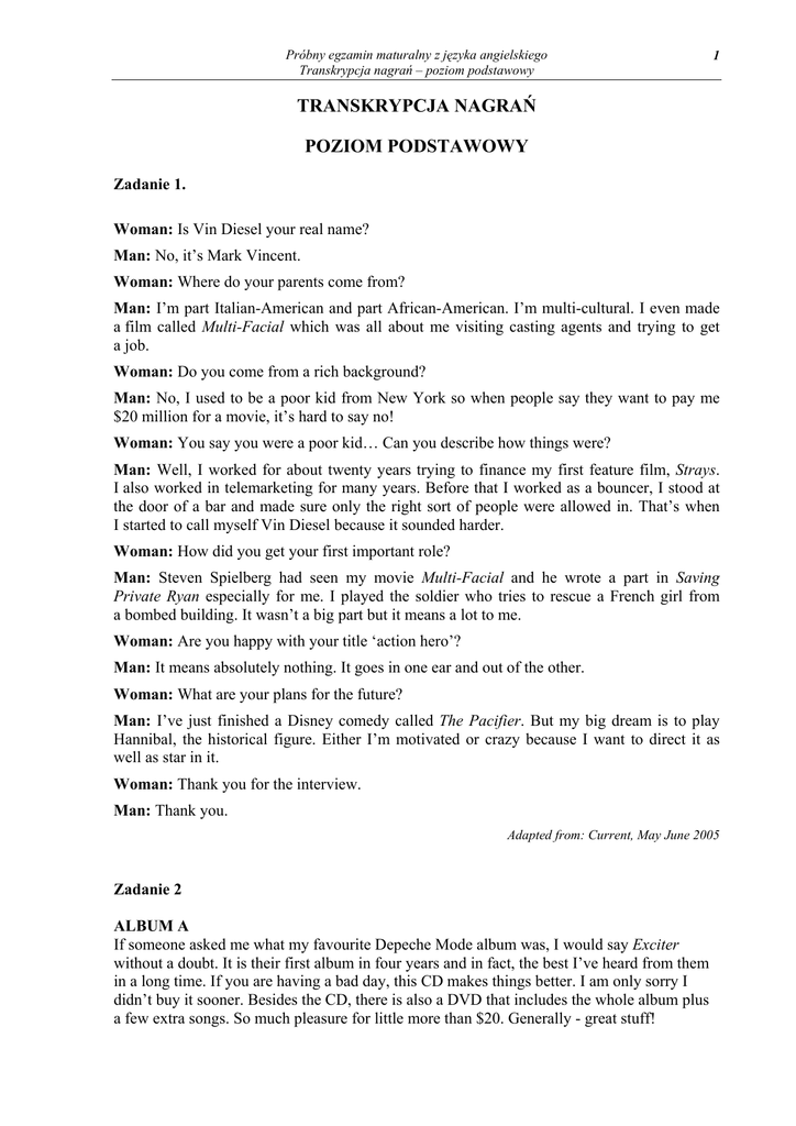 Próbny egzamin maturalny z języka angielskiego Transkrypcja nagrań – poziom podstawowy 1 TRANSKRYPCJA NAGRAŃ POZIOM PODSTAWOWY Zadanie 1. Woman: Is Vin Diesel your real name? Man: No, it’s Mark Vincent. Woman: Where do your parents come from? Man: I’m part Italian-American and part African-American. I’m multi-cultural. I even made a film called Multi-Facial which was all about me visiting casting agents and trying to get a job. Woman: Do you come from a rich background? Man: No, I used to be a poor kid from New York so when people say they want to pay me $20 million for a movie, it’s hard to say no! Woman: You say you were a poor kid… Can you describe how things were? Man: Well, I worked for about twenty years trying to finance my first feature film, Strays. I also worked in telemarketing for many years. Before that I worked as a bouncer, I stood at the door of a bar and made sure only the right sort of people were allowed in. That’s when I started to call myself Vin Diesel because it sounded harder. Woman: How did you get your first important role? Man: Steven Spielberg had seen my movie Multi-Facial and he wrote a part in Saving Private Ryan especially for me. I played the soldier who tries to rescue a French girl from a bombed building. It wasn’t a big part but it means a lot to me. Woman: Are you happy with your title ‘action hero’? Man: It means absolutely nothing. It goes in one ear and out of the other. Woman: What are your plans for the future? Man: I’ve just finished a Disney comedy called The Pacifier. But my big dream is to play Hannibal, the historical figure. Either I’m motivated or crazy because I want to direct it as well as star in it. Woman: Thank you for the interview. Man: Thank you. Adapted from: Current, May June 2005 Zadanie 2 ALBUM A If someone asked me what my favourite Depeche Mode album was, I would say Exciter without a doubt. It is their first album in four years and in fact, the best I’ve heard from them in a long time. If you are having a bad day, this CD makes things better. I am only sorry I didn’t buy it sooner. Besides the CD, there is also a DVD that includes the whole album plus a few extra songs. So much pleasure for little more than $20. Generally - great stuff! 2 Próbny egzamin maturalny z języka angielskiego Transkrypcja nagrań – poziom podstawowy ALBUM B To me Coldplay just keeps getting better! Their latest album X&Y, sold over 700,000 copies within the first week. And I wouldn’t be ashamed to share this with my friends, parents or even my grandmother. Overall, the band uses their talent to create a great CD! It’s certainly worthy of any CD collection. ALBUM C I have just purchased Maroon 5’s new album, Songs About Jane, and believe me I don’t regret spending the seven dollars and ninety cents I had to sacrifice to get it. I admit the real reason I bought it was because it was so cheap compared to the usual fifteen dollars you have to pay for a CD. The first time I put this CD in my player I was surprised at how much I enjoyed every single song I heard. ALBUM D I have been a fan of Madonna for a long time, but it was a mistake to buy her latest CD – Confession on a Dance Floor. None of the tracks are that terrific. Coming from someone with the talent of Madonna, I truly expected so much more. If you are in a club surrounded by people and having fun, the music is fine. Sitting at home alone and listening to the CD, you can’t help asking yourself, “What went wrong?” Adapted from: www.amazon.com Zadanie 3. Interviewer: His beard is insured for a six-figure sum and the plates on his red Mercedes read SANTA. Today we meet Brady White, Father Christmas to Hollywood’s rich and famous. How did you become Santa to the stars? Brady White: About 20 years ago, I was an out-of-work actor and nine months behind with the rent, so I took a seasonal job as Santa at a shopping mall in Beverly Hills. The Los Angeles Times voted me the best Santa Claus in Southern California and word spread from there. Interviewer: Who was the first celebrity you met? Brady White: Imelda Marcos asked me to hand out gifts at her Christmas party. Most of them were gold bracelets, earrings, rings and necklaces, but there was also a miniature Ferrari car for children. Interviewer: Who’s your favourite celebrity? Brady White: Kirstie Alley invites me to her home for her kids. She’s one of the best mums I know – a real down-to-earth sort. And Sylvester Stallone and his wife, Jennifer Flavin, have three young daughters who I see each year – they’re very nice, regular, unspoiled children. Interviewer: Which party will you never forget? Brady White: It was the songwriter Burt Bacharach’s party. As always, my job was to go into the house ho-ho-ho-ing and give presents to the guests, but afterwards Burt invited me to stay to dinner. I took off my coat and was in the kitchen dressed in my white T-shirt and red Próbny egzamin maturalny z języka angielskiego Transkrypcja nagrań – poziom podstawowy 3 braces when Elizabeth Taylor came in and sat beside me. She said: “You’re the best Santa I’ve ever met, because you remind me of what I thought Santa looked like when I was a little girl.” Interviewer: And the most extravagant party? Brady White: I’ve been to many such parties in Hollywood where there is truckloads of snow in the garden, champagne and mountains of caviar. But two years ago, I did a party for a major film producer. Not only did he have the winter wonderland in the garden but he even had a reindeer which had been sent from Lapland. Interviewer: What do you do on Christmas Day? Brady White: I’m always at The Beverly Hills Hotel. I have my Christmas lunch there. Interviewer: What do you do when Christmas is over? Brady White: It never is! I work all year round as Santa. After I’ve been down all those chimneys, I do a lot of modelling for catalogues and TV commercials. Interviewer: Are you recognised when
