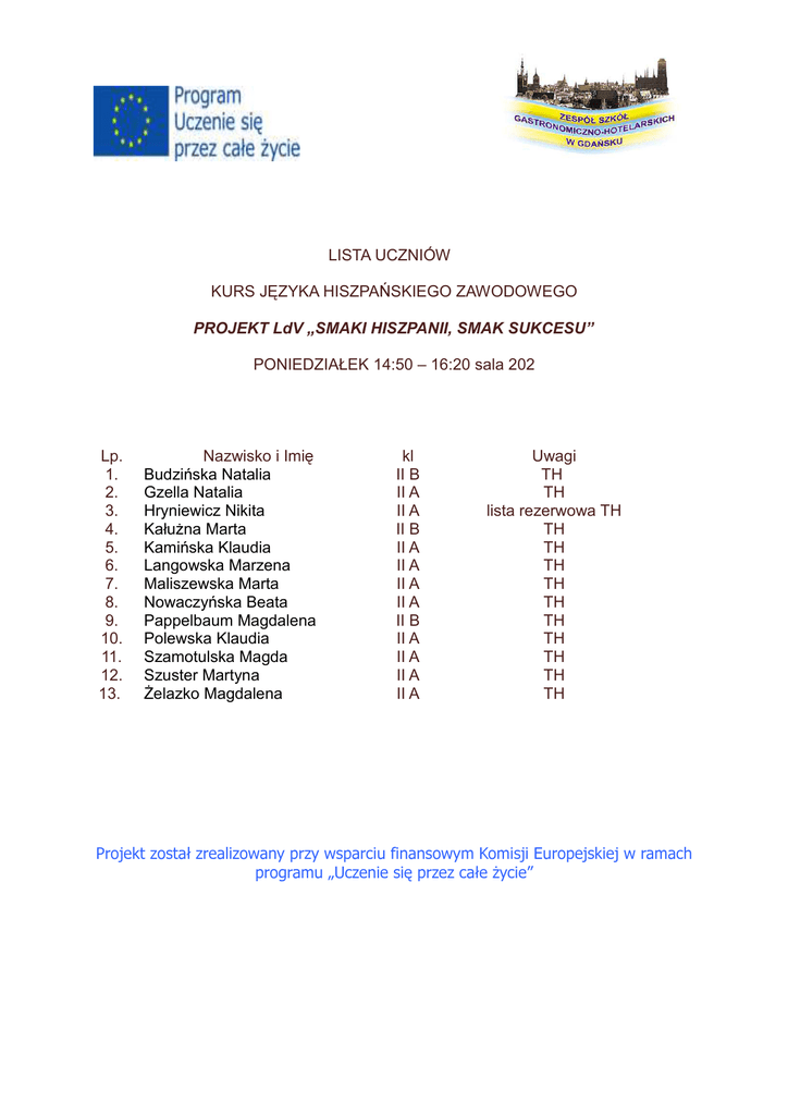 LISTA UCZNIÓW KURS JĘZYKA HISZPAŃSKIEGO ZAWODOWEGO PROJEKT LdV „SMAKI HISZPANII, SMAK SUKCESU” PONIEDZIAŁEK 14:50 – 16:20 sala 202 Lp. 1. 2. 3. 4. 5. 6. 7. 8. 9. 10. 11. 12. 13. Nazwisko i Imię Budzińska Natalia Gzella Natalia Hryniewicz Nikita Kałużna Marta Kamińska Klaudia Langowska Marzena Maliszewska Marta Nowaczyńska Beata Pappelbaum Magdalena Polewska Klaudia Szamotulska Magda Szuster Martyna Żelazko Magdalena kl II B II A II A II B II A II A II A II A II B II A II A II A II A Uwagi TH TH lista rezerwowa TH TH TH TH TH TH TH TH TH TH TH Projekt został zrealizowany przy wsparciu finansowym Komisji Europejskiej w ramach programu „Uczenie się przez całe życie” LISTA UCZNIÓW KURS JĘZYKA HISZPAŃSKIEGO ZAWODOWEGO PROJEKT LdV „SMAKI HISZPANII, SMAK SUKCESU” WTOREK 14:50 – 16:20 sala 202 Lp. 1. 2. 3. 3. 4. 5. 6. 7. 8. 9. 10. 11. 12. Nazwisko i Imię Borowski Krzysztof Ciołek Sandra Jezierska Jolanta Korda Aleksander Łastowska Agata Műller Monika Opiela Agnieszka Pietras Natalia Skubij Monika Szybka Martyna Thumas Kamila Węsierska Paulina Zielińska Sara kl II D II C II D II D II C II M II M II M II M II C II D II M II C Uwagi T Kucharz T Kelenr lista rezerwowa T Kelner T Kucharz T Kelenr TOUG TOUG TOUG lista rezerwowa TOUG T Kelenr T Kucharz TOUG T Kelner Projekt został zrealizowany przy wsparciu finansowym Komisji Europejskiej w ramach programu „Uczenie się przez całe życie” LISTA UCZNIÓW KURS JĘZYKA HISZPAŃSKIEGO ZAWODOWEGO PROJEKT LdV „SMAKI HISZPANII, SMAK SUKCESU” ŚRODA 14:50 – 16:20 sala 202 Lp. 1. 2. 3. 4. 5. 6. 7. 8. 9. 10. 11. 12. Nazwisko i Imię Chojnacki Michał Hinc Michał Jadeszko Dominik Jezierska Jolanta Kanka Jakub Kotkowski Adrian Laskowski Dariusz Niska Katarzyna Puzio Adrianna Siniewicz Dominika Sowulewski Łukasz Stanek Daniel kl II I II I II I II I II I II I II I II I II I II I II I II I Uwagi T Kucharz T Kucharz T Kucharz lista rezerwowa T Kucharz T Kucharz T Kucharz T Kucharz T Kucharz T Kucharz T Kucharz T Kucharz T Kucharz Projekt został zrealizowany przy wsparciu finansowym Komisji Europejskiej w ramach programu „Uczenie się przez całe życie”